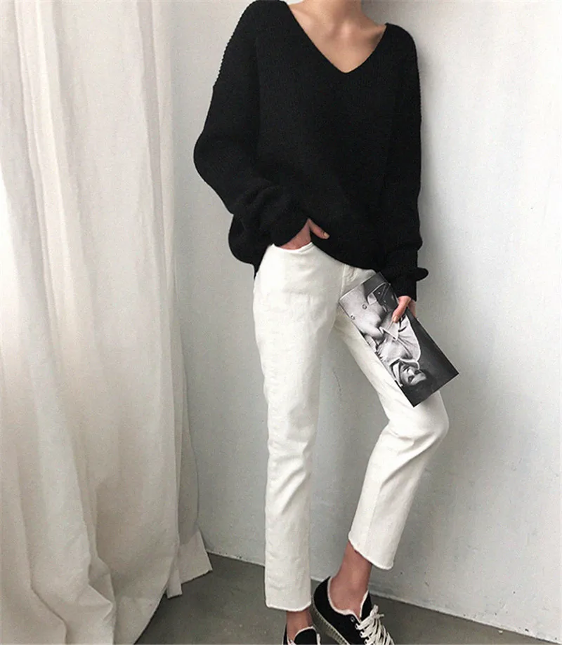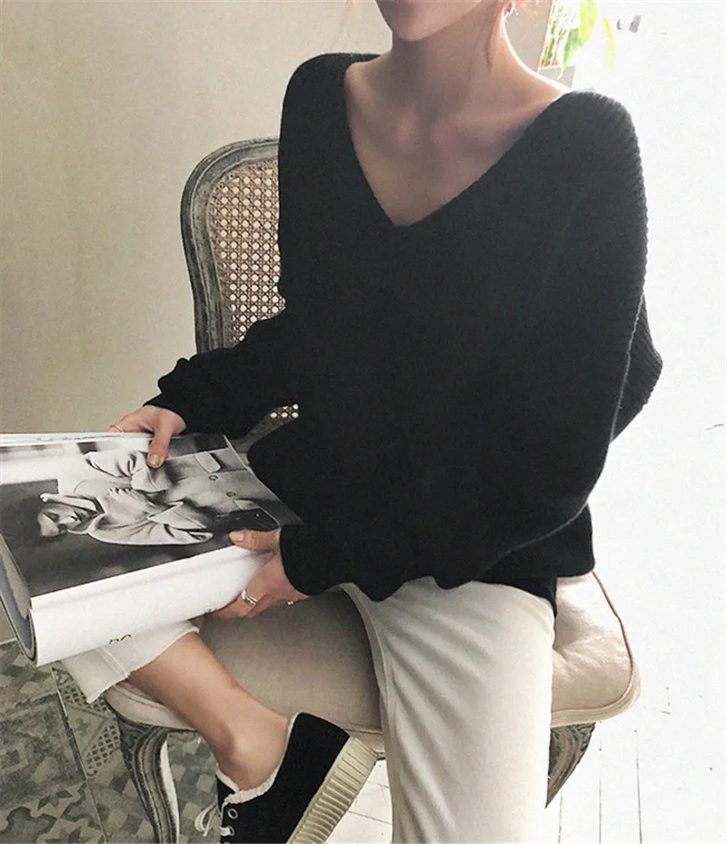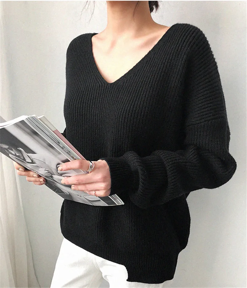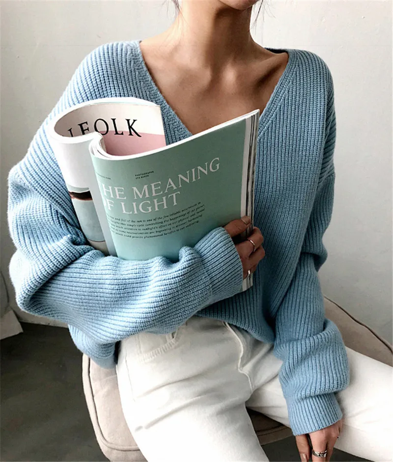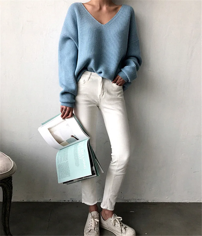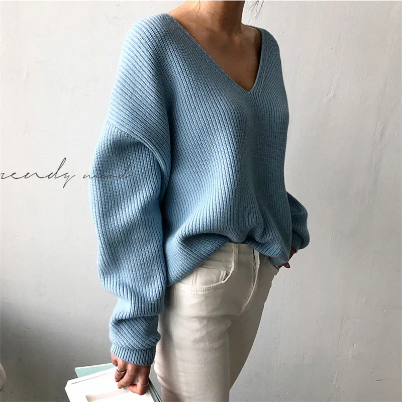 2020 Autumn Winter Casual Womens Sweaters V Neck Solid Knitted