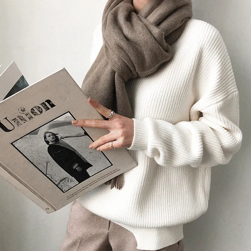 For size M, sometimes L, Russian 44-46 was not oversized at all, but an ordinary wide sweater. Perhaps due to the rubber band-assembly at the bottom such an impression, it does not hang and hangs, but simply neatly placed on the figure, for my size for a good effect should be much more voluminous. In the photo many can see it. A good effect will be on the thinner. And so on the look of a quality sweater, the seams are all neat, see how it behaves after washing.