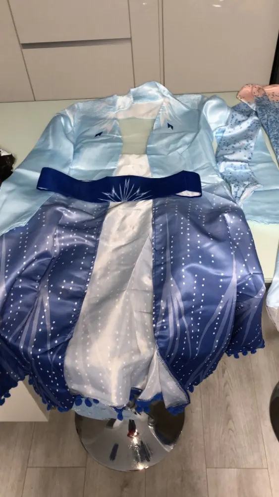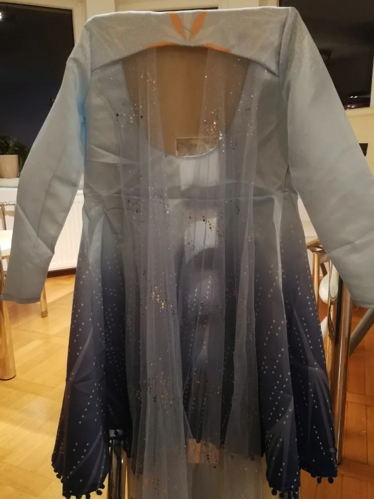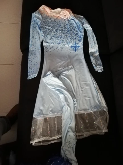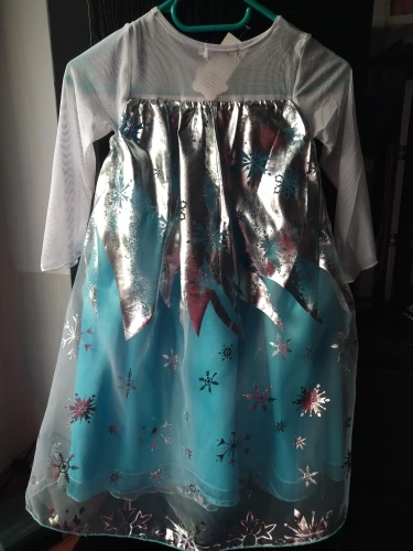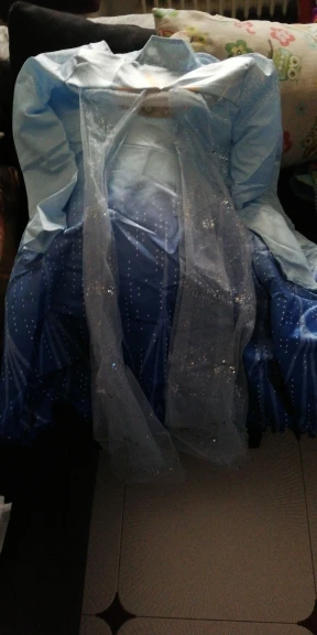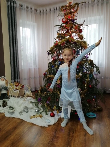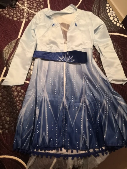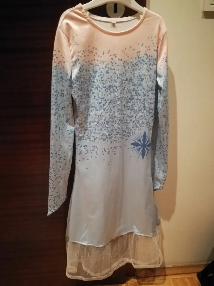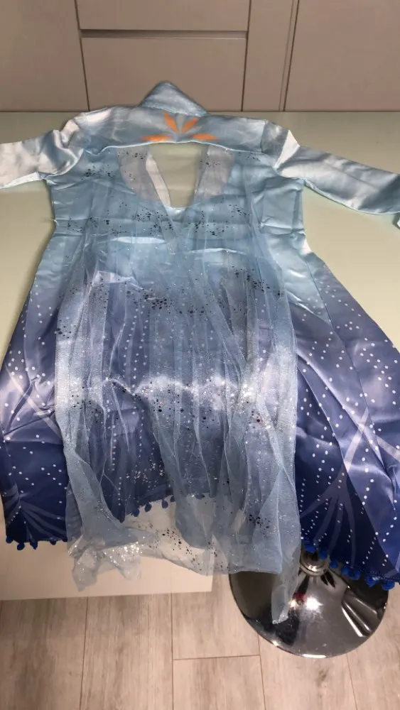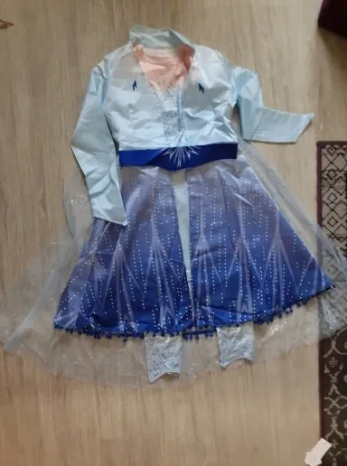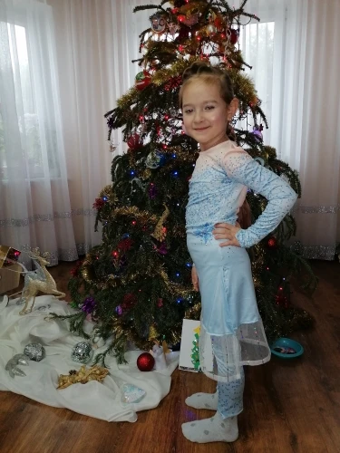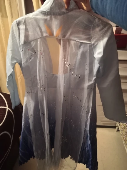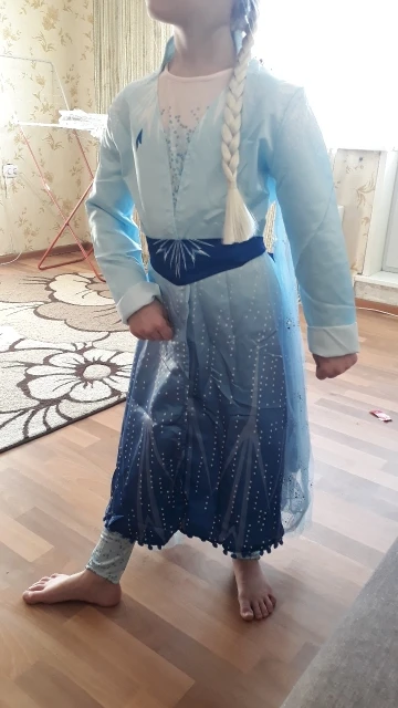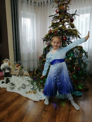 Cool costume) quality is not bad, the daughter is delighted) on the cloak is written size 110 for 4 years a little bit more but this is nonsense)) rolled up at the end of November but stuck straight on December 28 at the post office and received after the holidays) on the belt themselves already pasted and sewn rhinestones) Thank you costume good