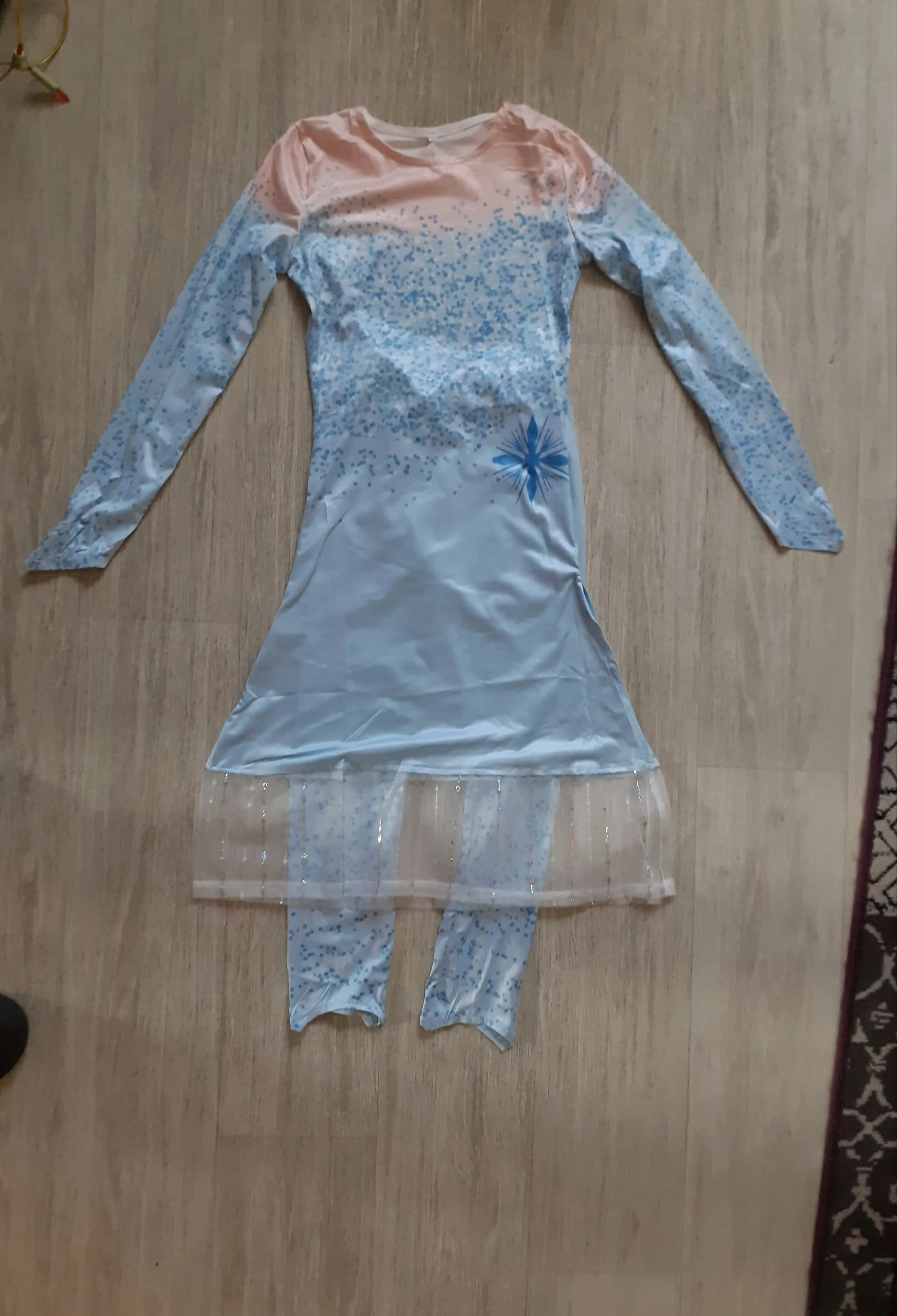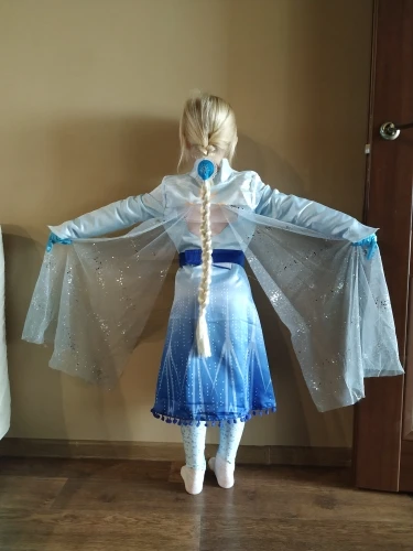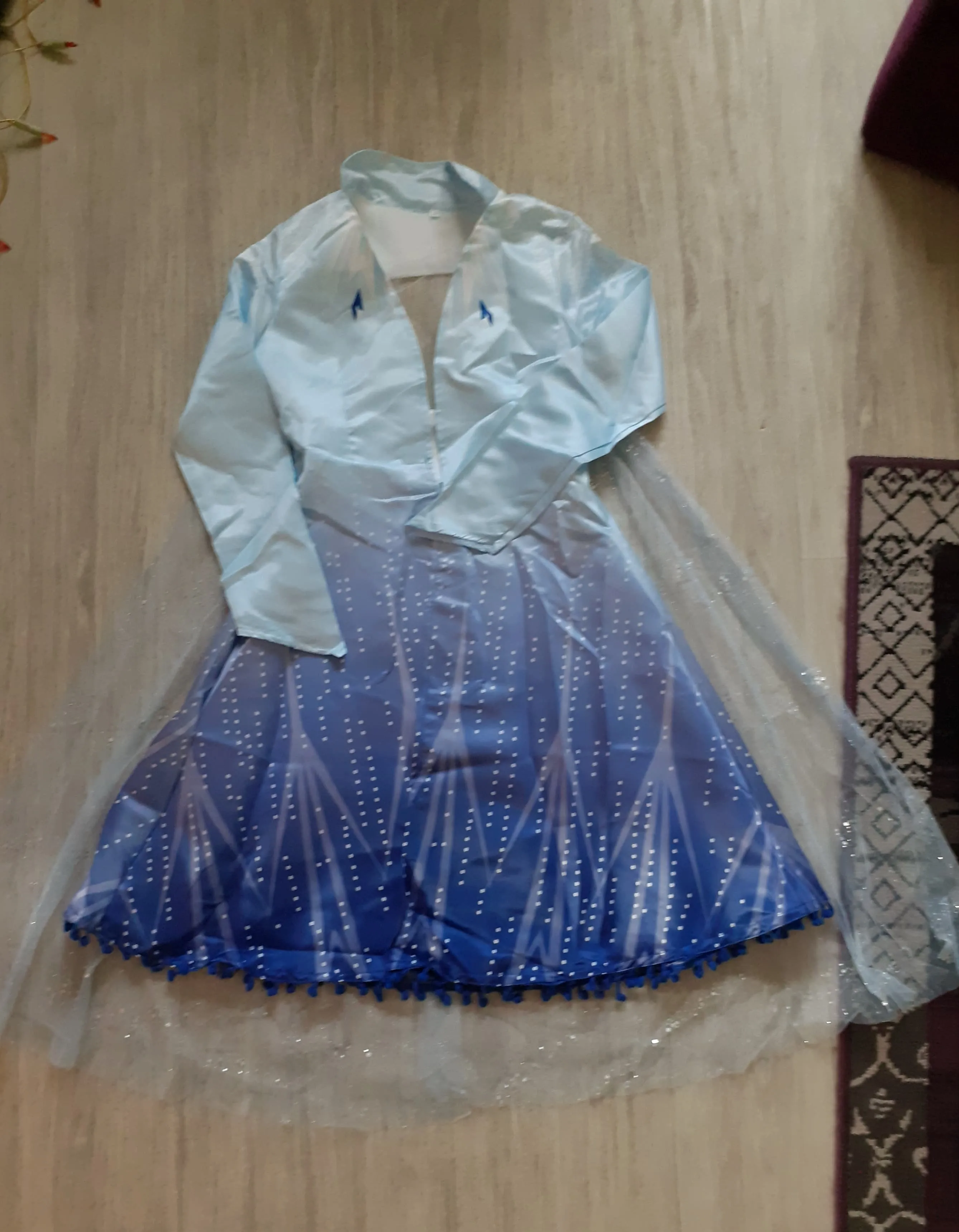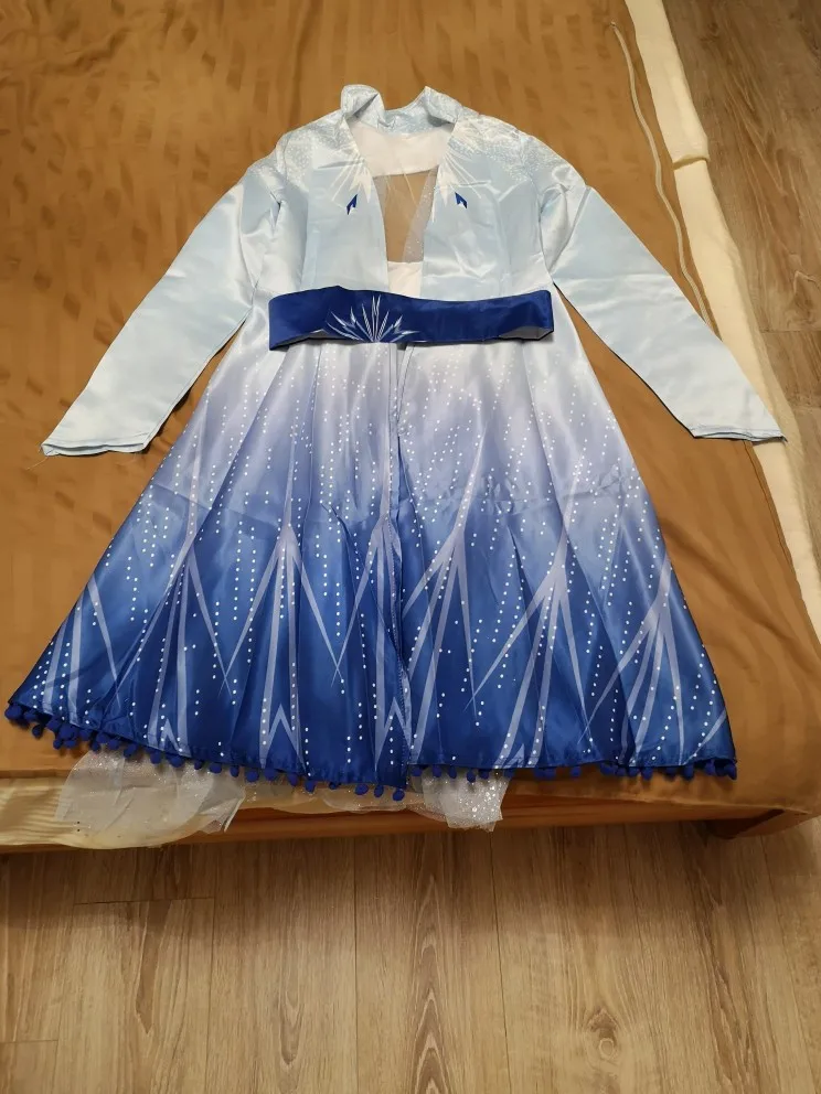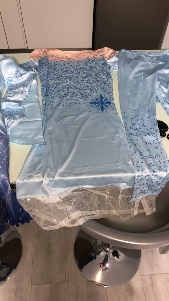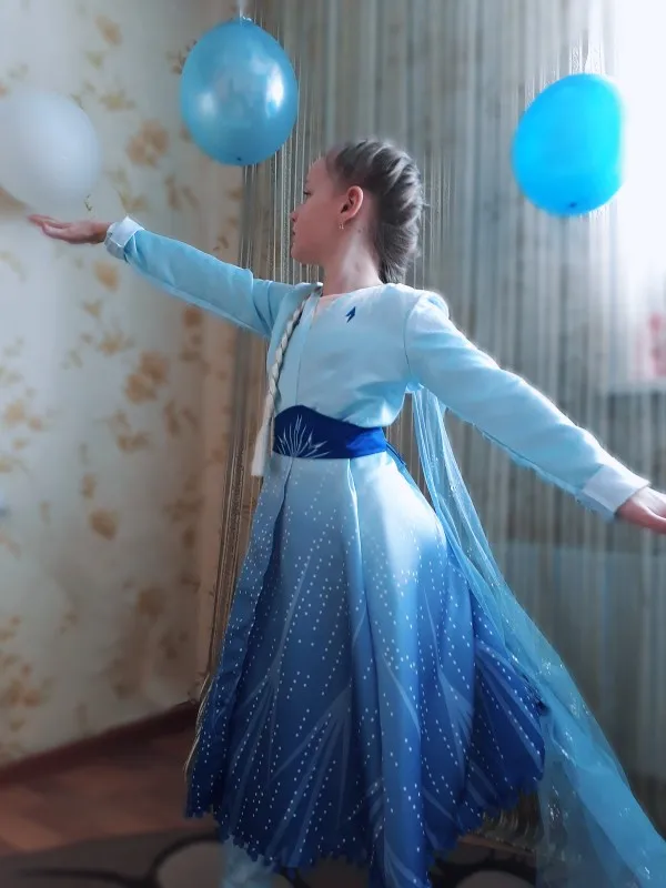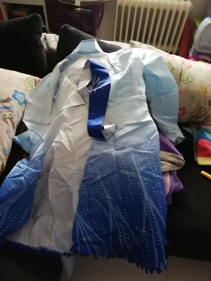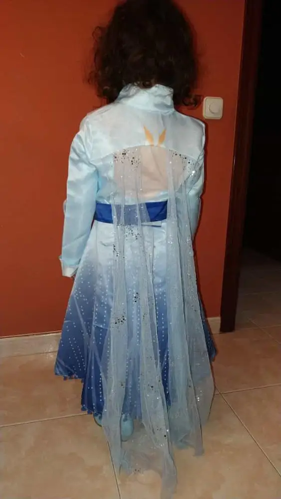 Cool costume) quality is not bad, the daughter is delighted) on the cloak is written size 110 for 4 years a little bit more but this is nonsense)) rolled up at the end of November but stuck straight on December 28 at the post office and received after the holidays) on the belt themselves already pasted and sewn rhinestones) Thank you costume good