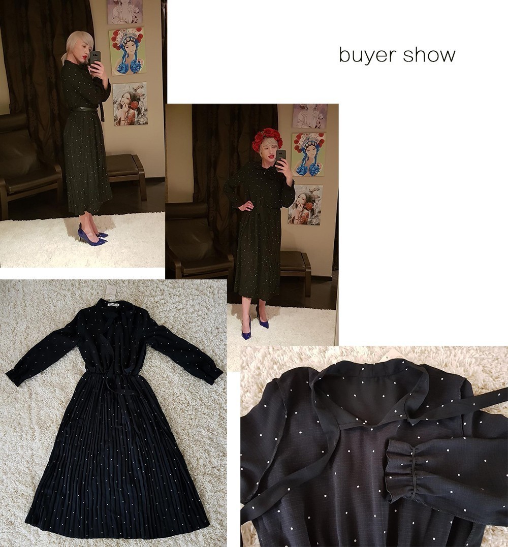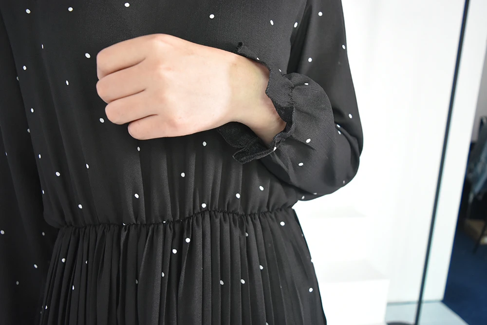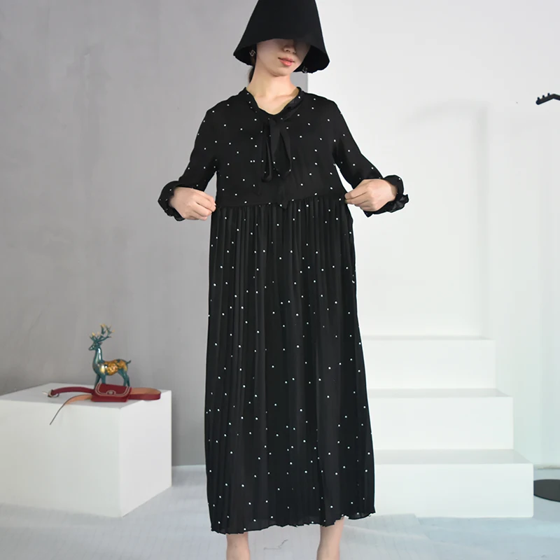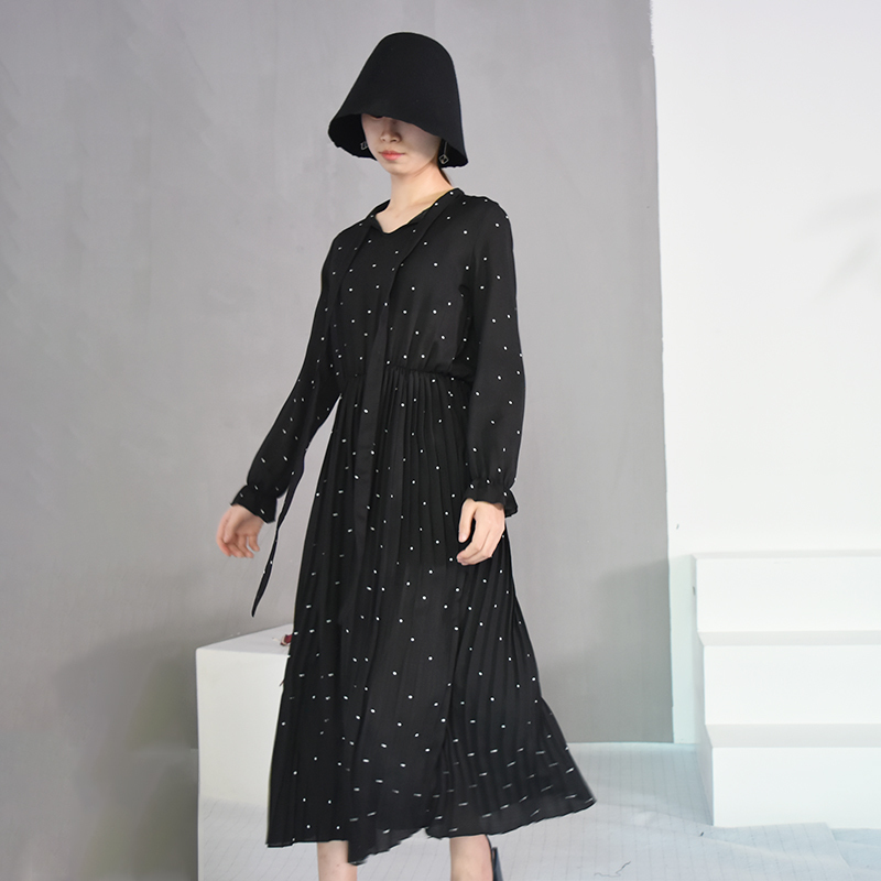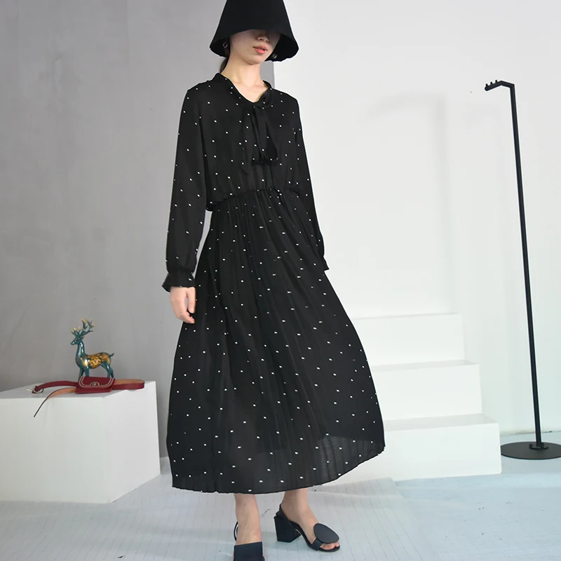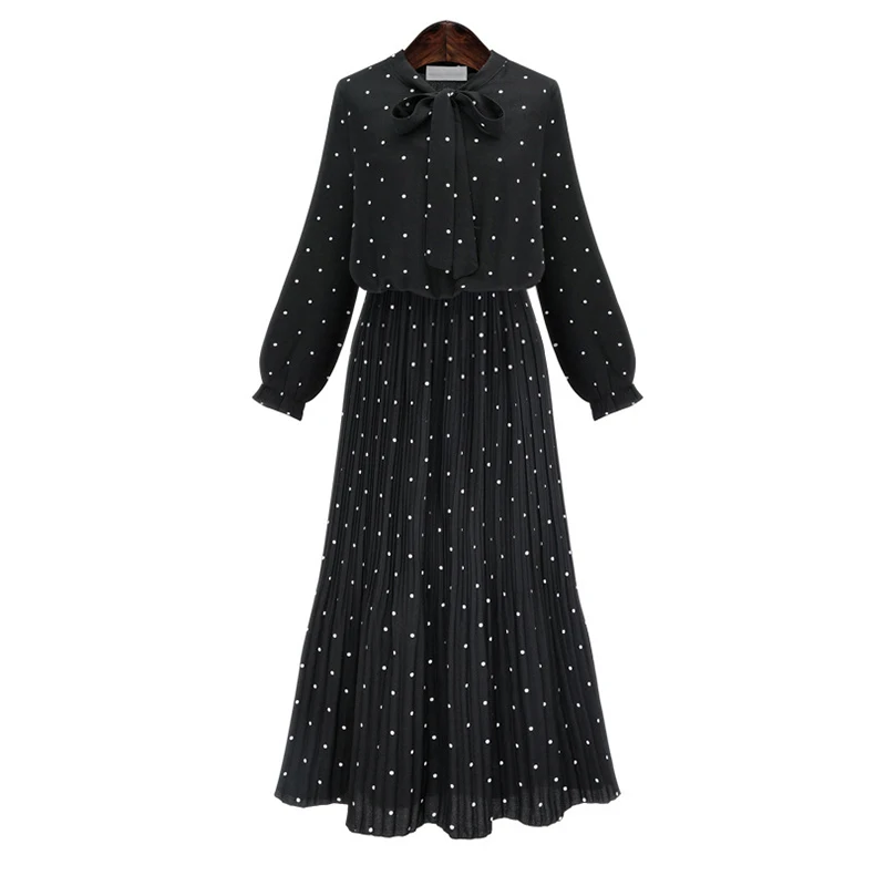 2020 New Women Dresses Round Neck Long Sleeve Solid Black Chiffon Dot Loose Big Size Dress L0248