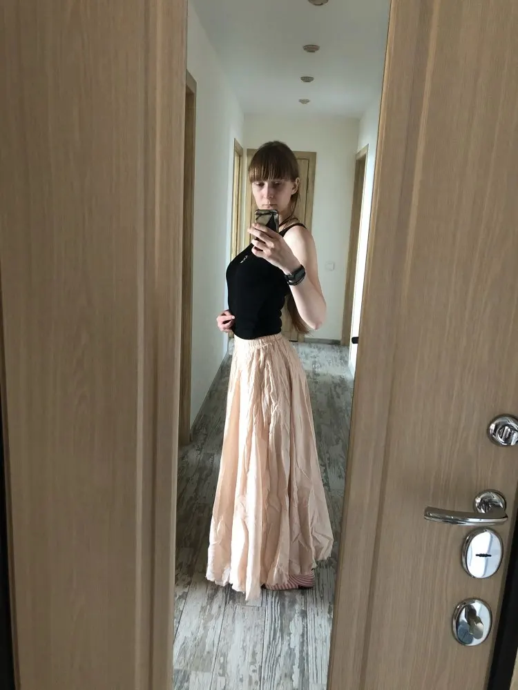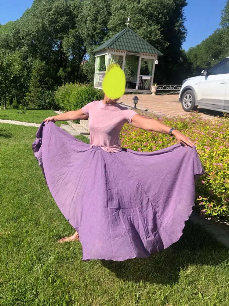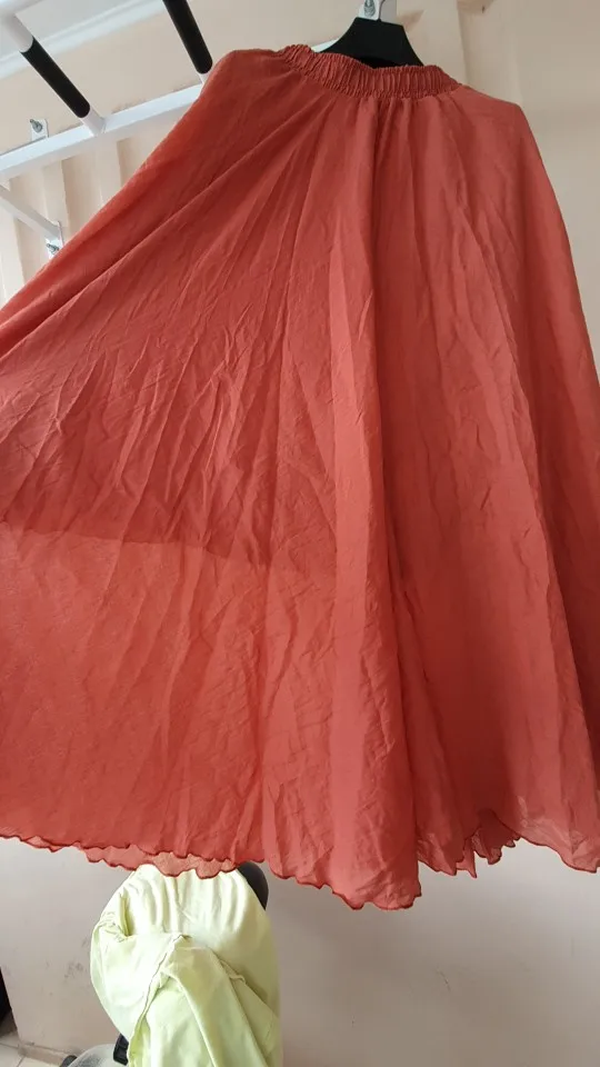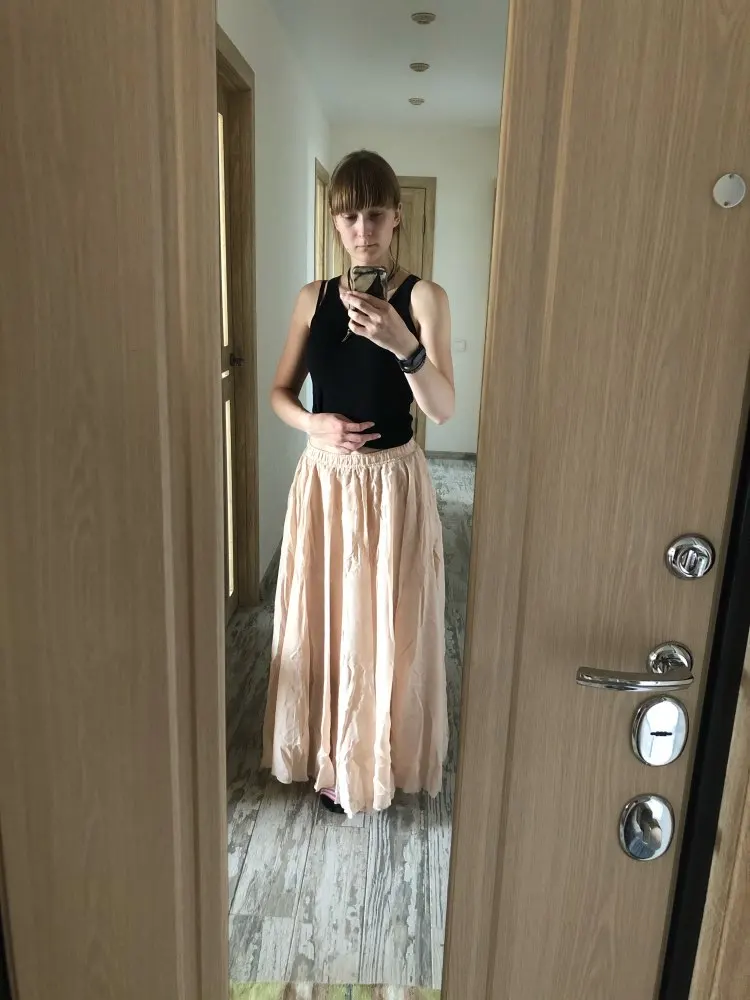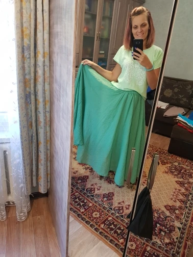 Очень хорошая юбочка. Материала много. Как на фото, цвет немного отличается. Думала красный, а он кирпичный, цвет ржавчины. Но все равно очень довольна. Материал натуральный и юбки, и подъюбника. Подъюбник узкий, я распарола. Хочется резинку послабее, давит немного. На рост 171, размер L хорошо. Буду заказывать еще в других цветах. Попробую XL, может резинка будет покомфортнее.