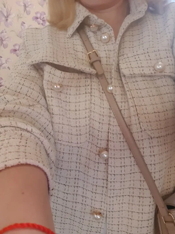 The shirt has excellent factory quality-smooth seams, no sticking threads and defects, pleasant to the body fabric. The shirt has a classic style, accessories for pearls. On the parameters 83-64-91 and the height of 173 in the size of L sat perfectly! I recommend to buy!