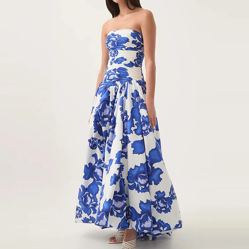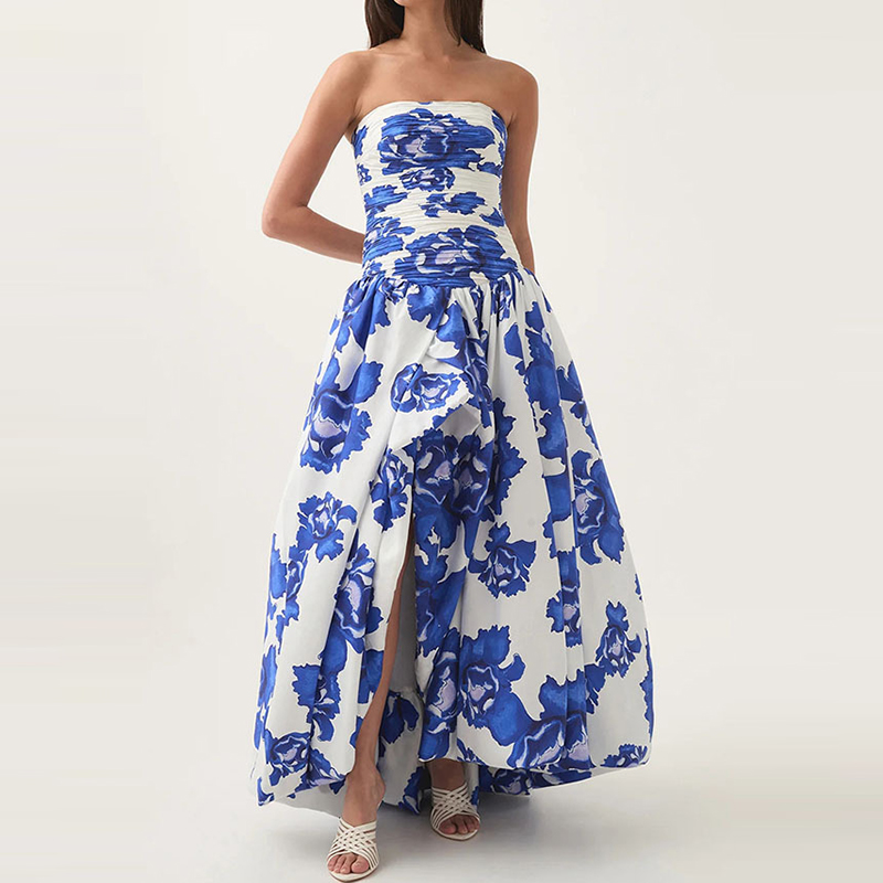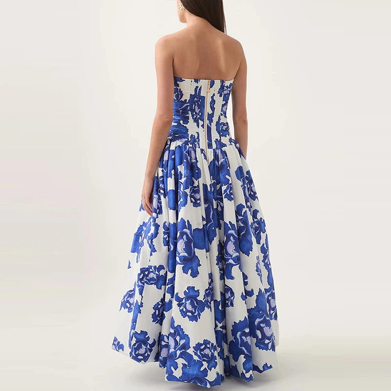 2025 Elegant Strapless Floral Party Dress Off Shoulder Pleated Slim Fit Long Evening Gown for Women OUT1028