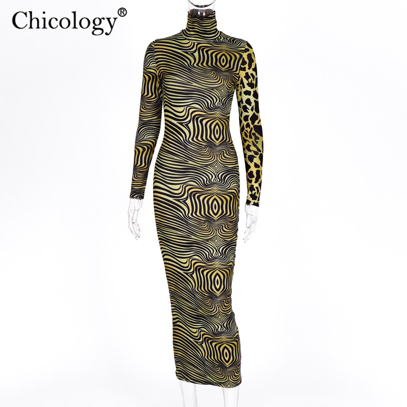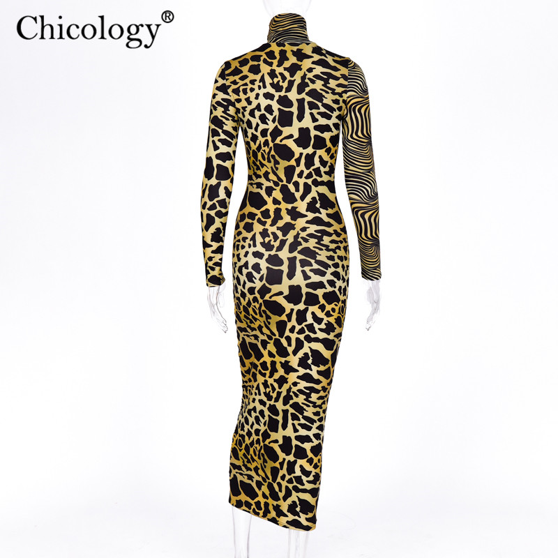 Leopard Zebra Print Midi Dress Women Long Sleeve Turtleneck Streetwear Casual Clothes L0171