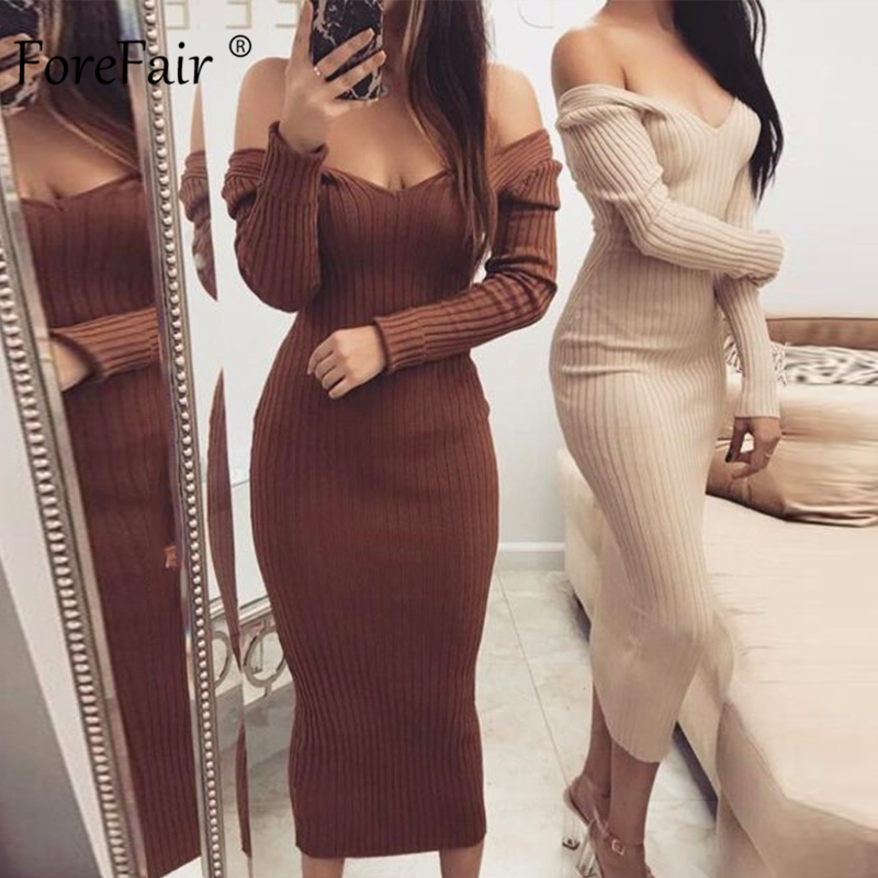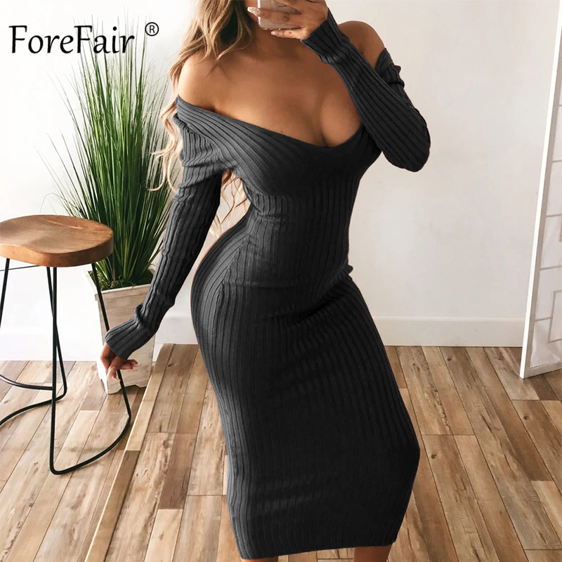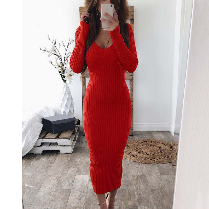 Ribbed Dress Knit Long Sleeve V Neck Bodycon OUT0877
