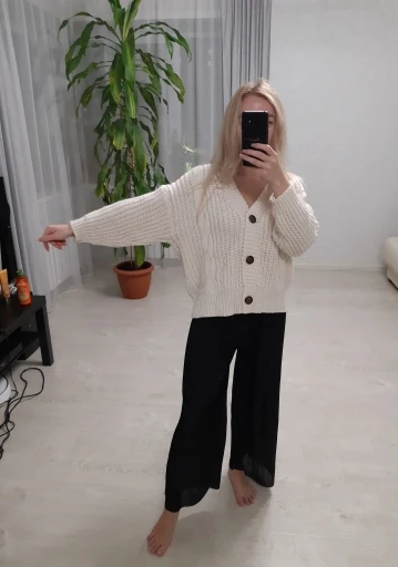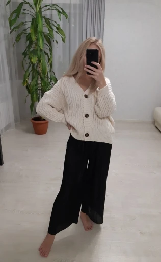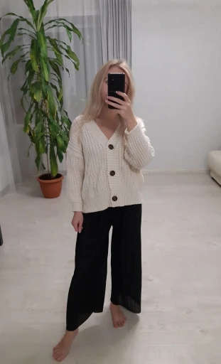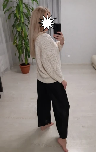 The goods came, an interesting cardigan chick, fashionable, for an amateur. I did not like the beginning, but the more I try, I like it more and more. There is a small smell, but it is not critical. My parameters: 94-80 - 98, height 160. thanks to the store, delivery is satisfied.