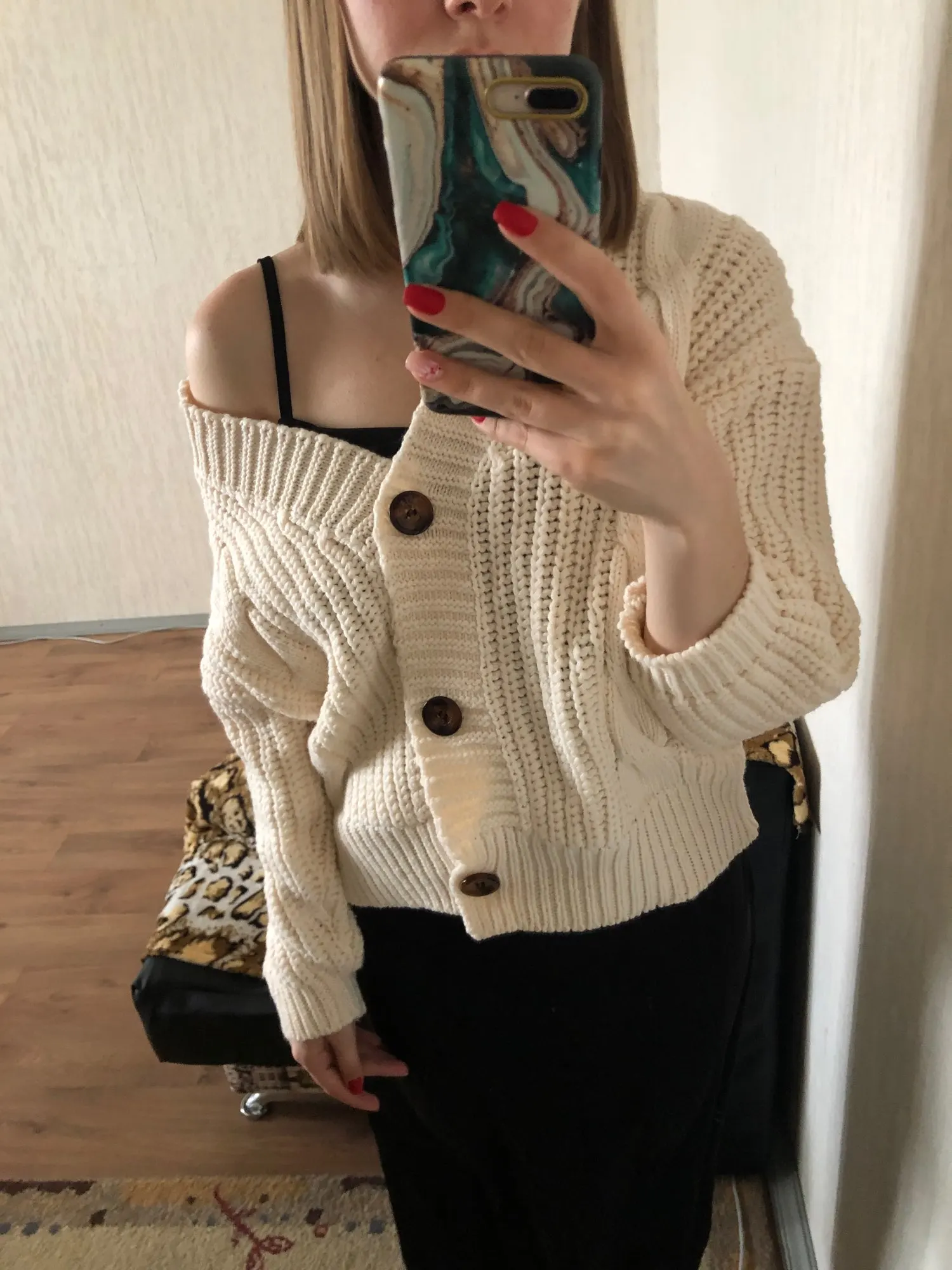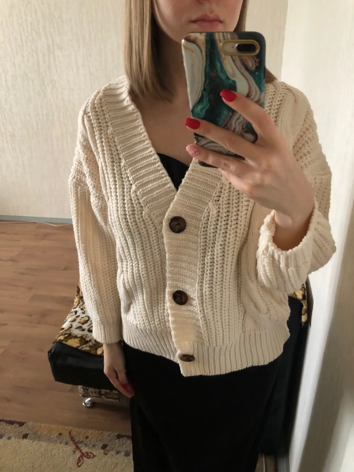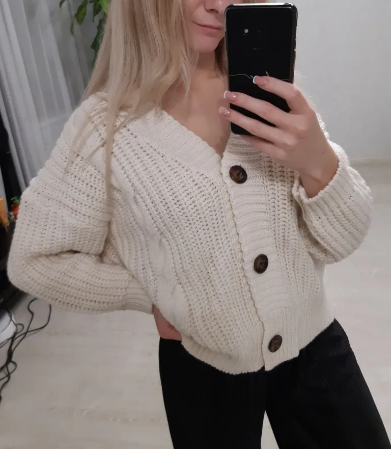 Pleasant calm color! A good cardigan for this money. Some of the threads stick out, there is a smell of "Factory", but quickly weathered. Cardigan is surprisingly warm. In my opinion, too overweight, on rus.42th size (og 92 cm, OT 64) the cutout is too large, the cardigan itself is very wide-it's difficult to fill On the height of 167 cm to the middle of the thigh. Was packed in plastic bag. Also the store put the promo code.