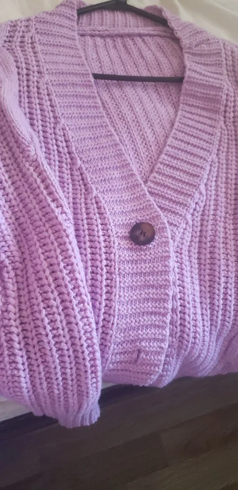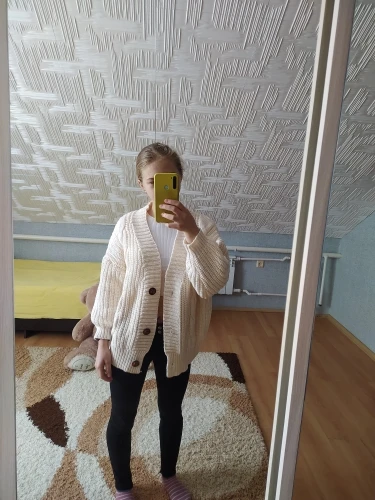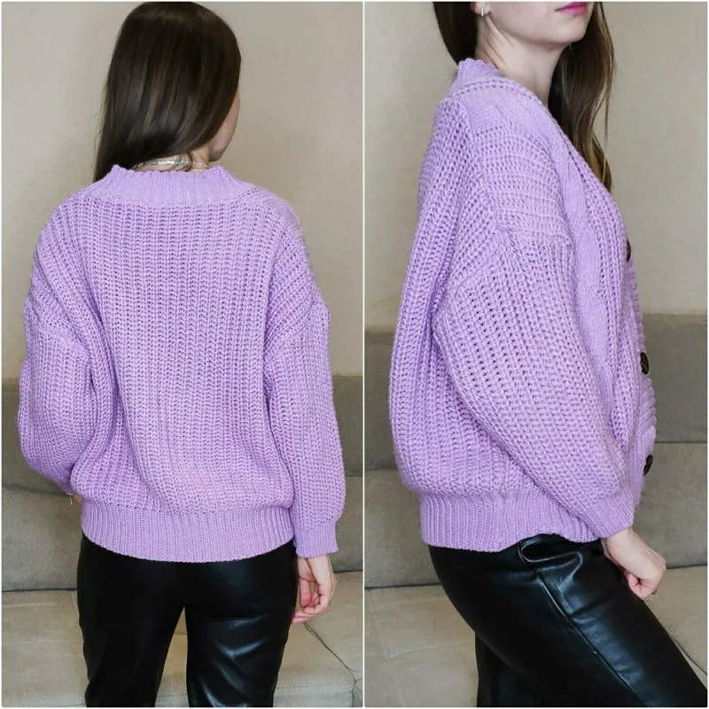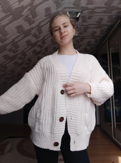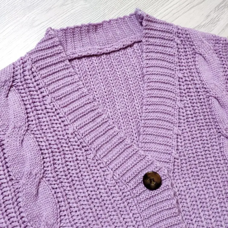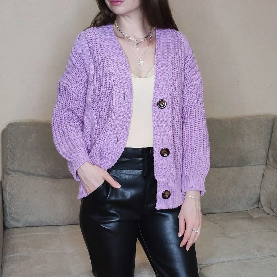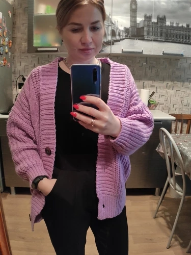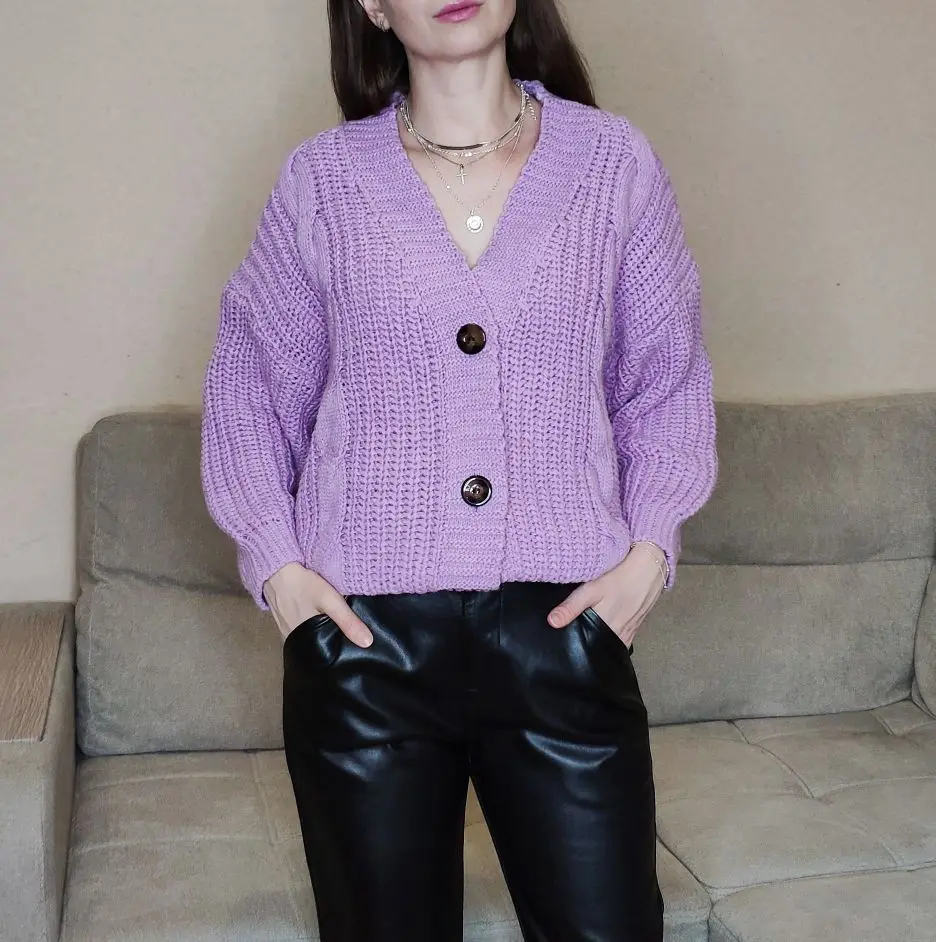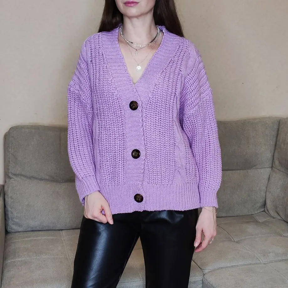Cardigan fully corresponds to the photo and description in the store. On my parameters 80-65-89 landing oversize, the length of the Cardigan itself on the height of 157 cm is excellent, but the length of the sleeve is back to back (((( The material is mixed, I think the synthetic thread prevails. The mating is beautiful, large. Sewing is not very neat, but since everything is inaccurate from the wrong side, I do not reduce the evaluation. Buttons are plastic, tortoiseshell coloring. The color is very pleasant, I do not know how it is more correct-lilac or lilac. In general, the cardigan is beautiful, relevant, it will be combined with many things.