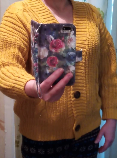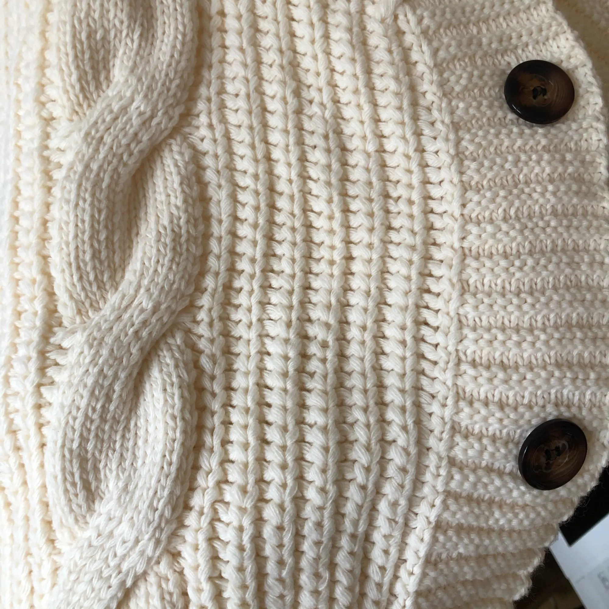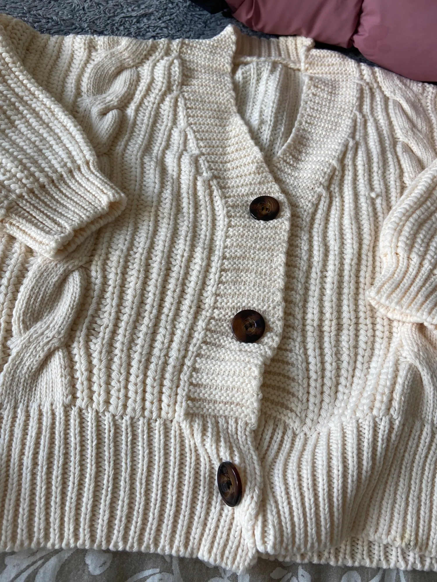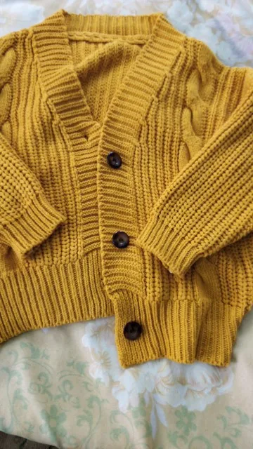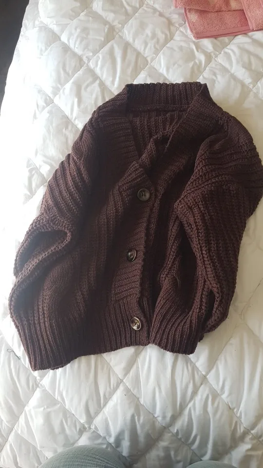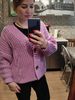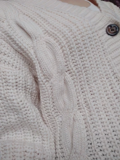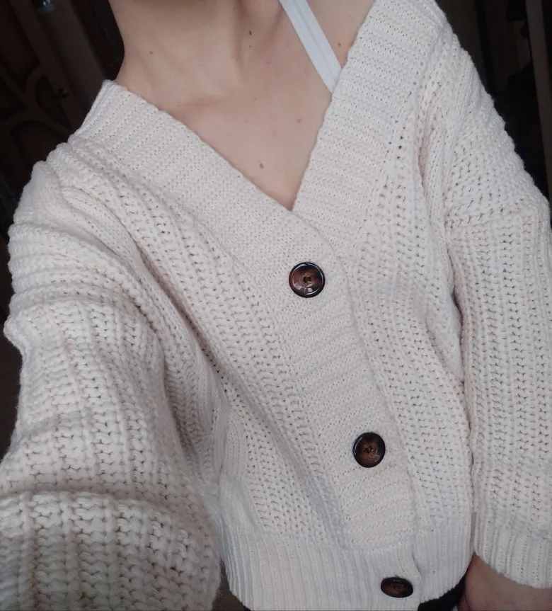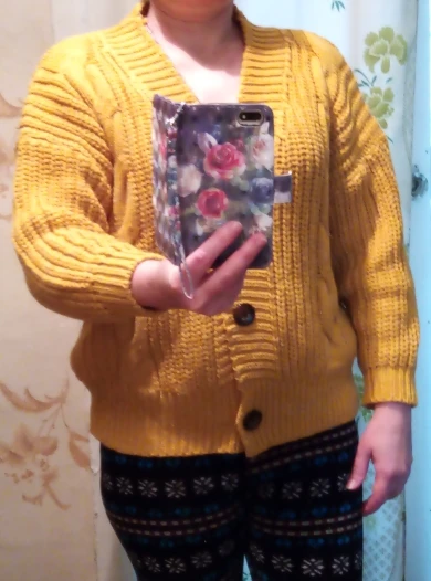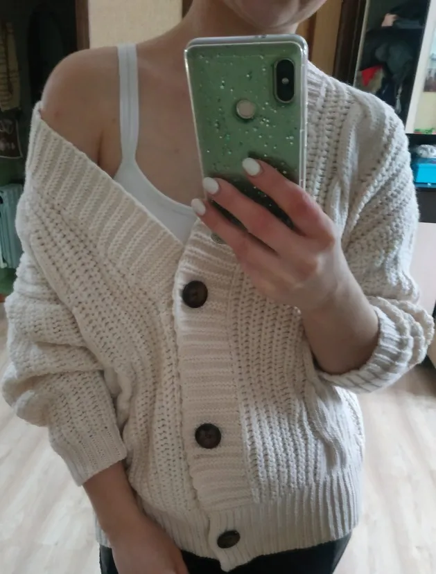 Cardigan fully corresponds to the photo and description in the store. On my parameters 80-65-89 landing oversize, the length of the Cardigan itself on the height of 157 cm is excellent, but the length of the sleeve is back to back (((( The material is mixed, I think the synthetic thread prevails. The mating is beautiful, large. Sewing is not very neat, but since everything is inaccurate from the wrong side, I do not reduce the evaluation. Buttons are plastic, tortoiseshell coloring. The color is very pleasant, I do not know how it is more correct-lilac or lilac. In general, the cardigan is beautiful, relevant, it will be combined with many things.