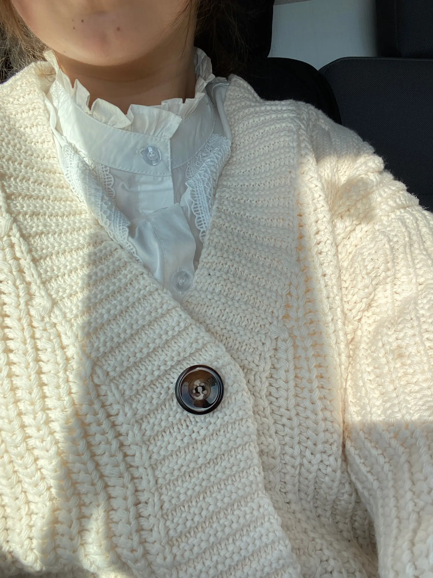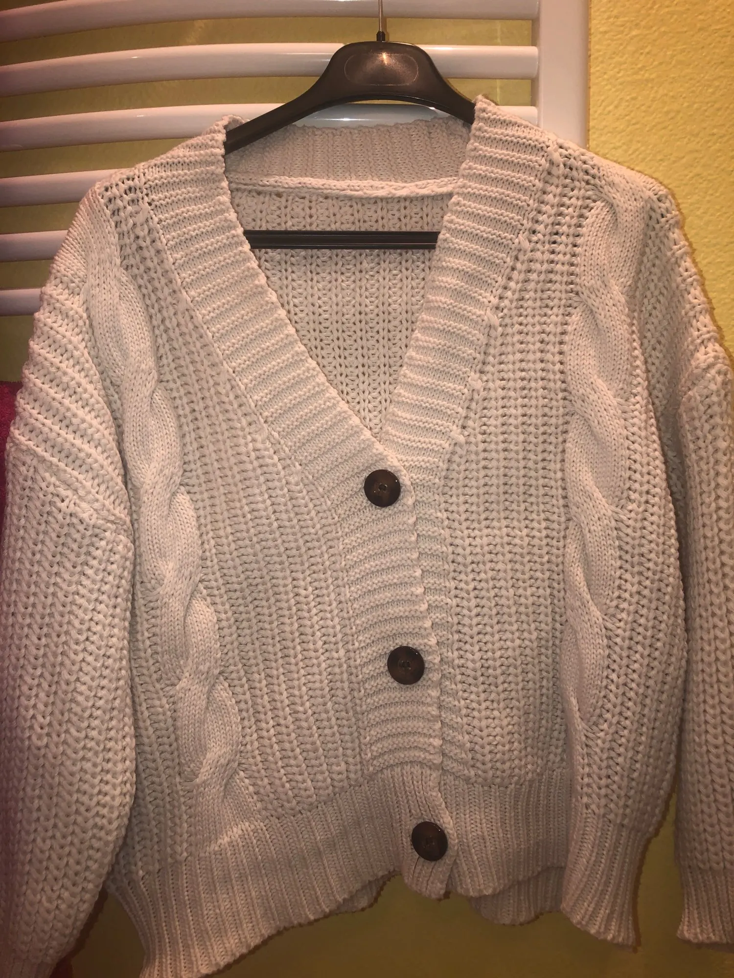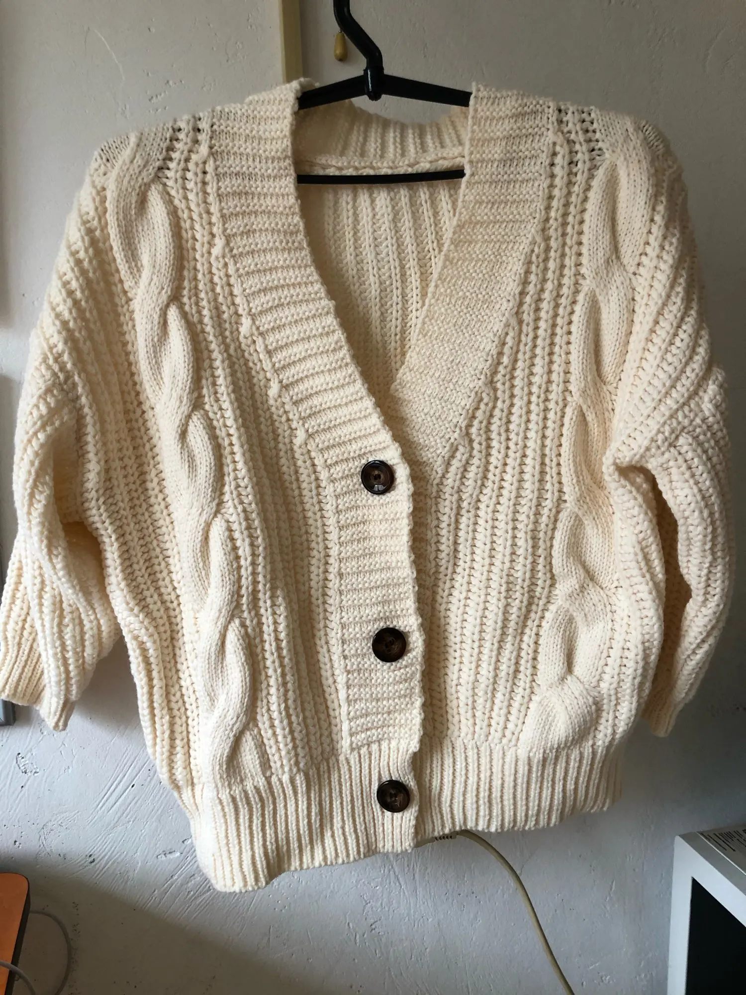 A good cardigan. the threads do not stick out, the smell is factory. The size 44 of course is free, but it should be. Thank you