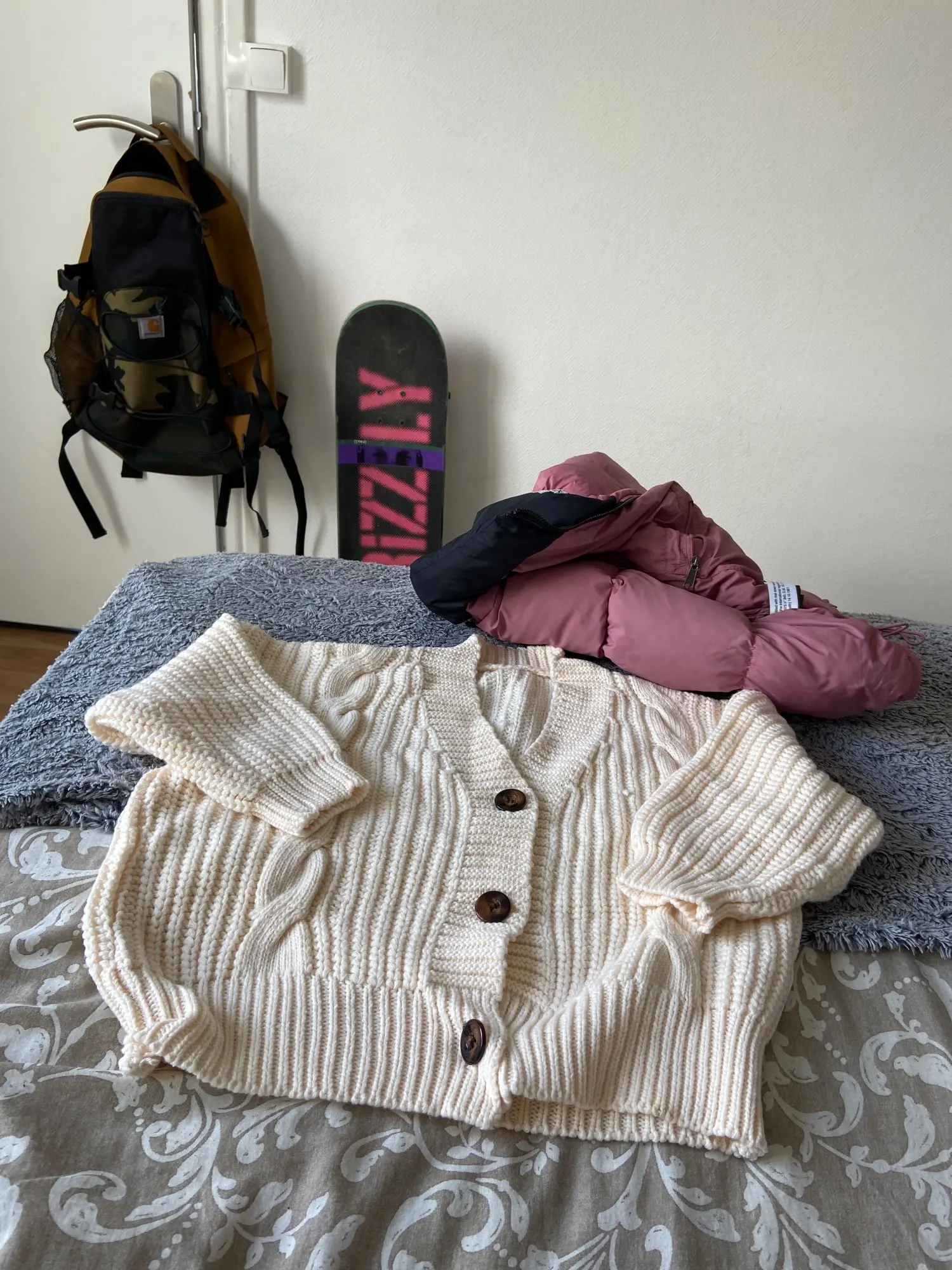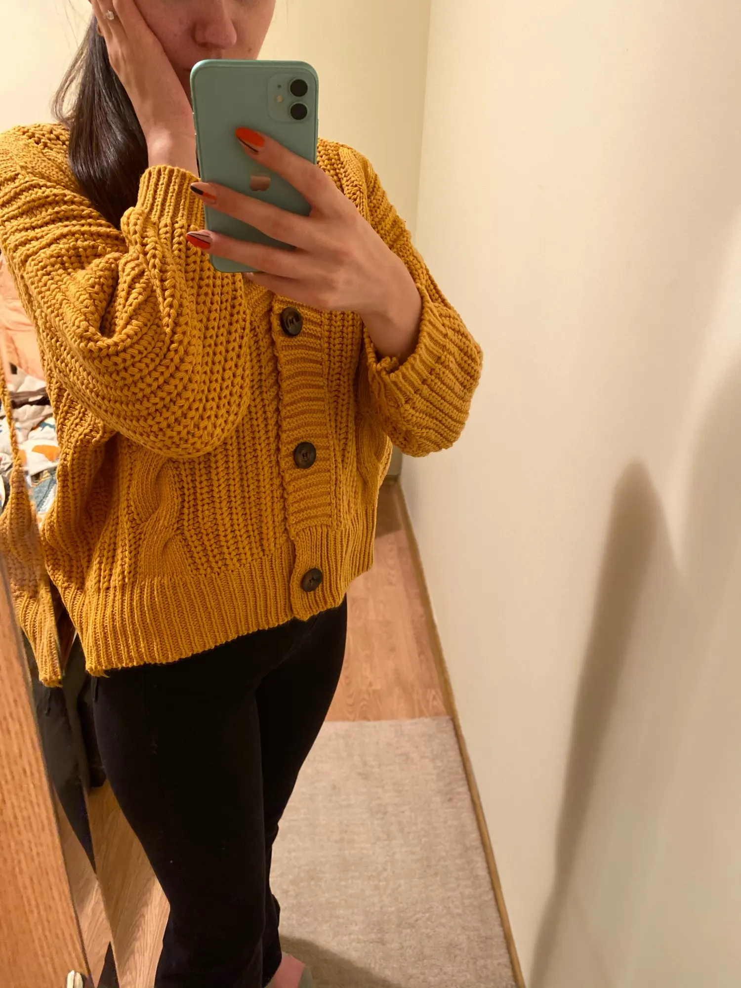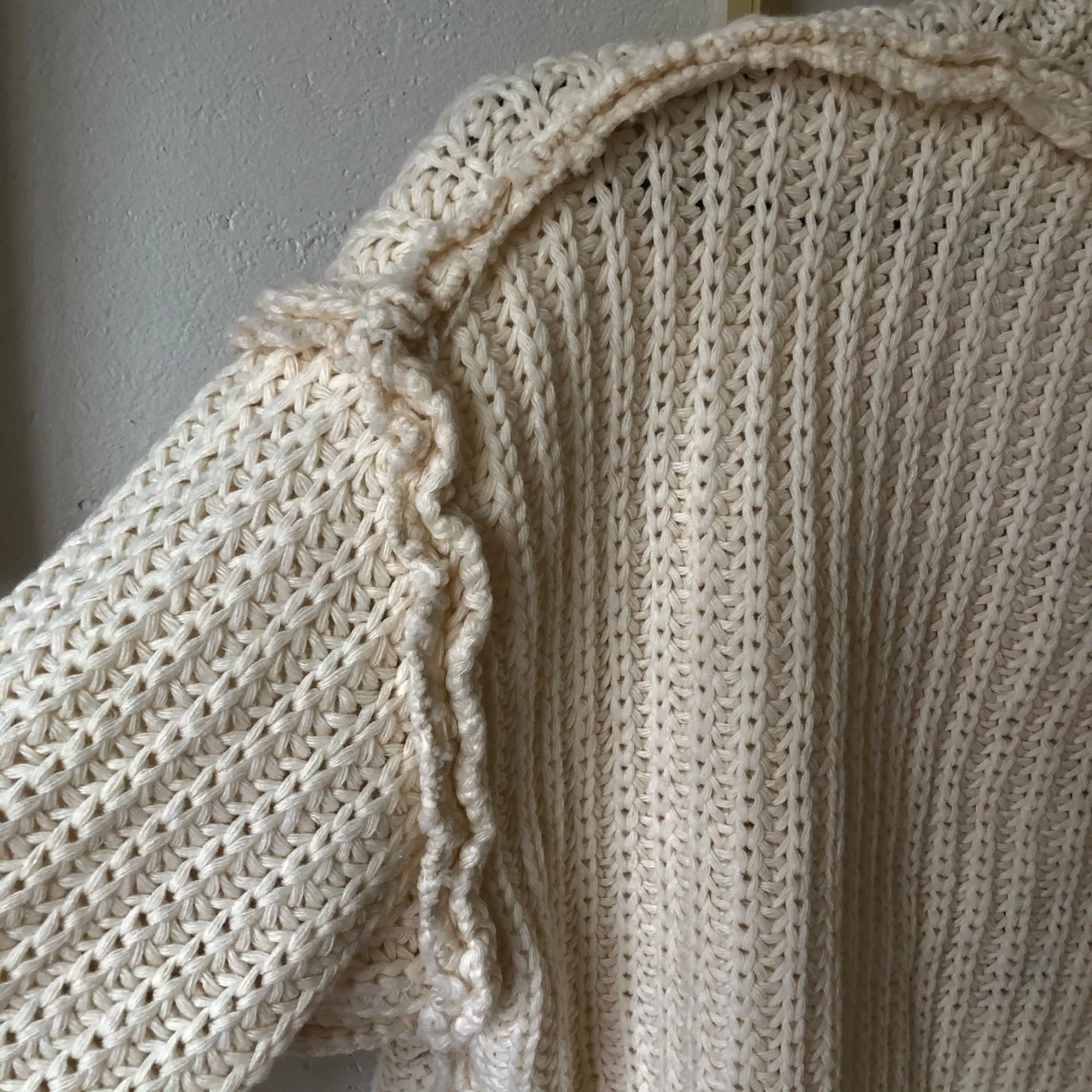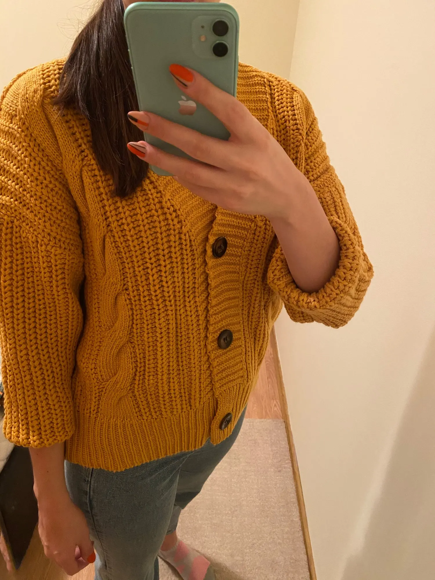 A good cardigan. the threads do not stick out, the smell is factory. The size 44 of course is free, but it should be. Thank you