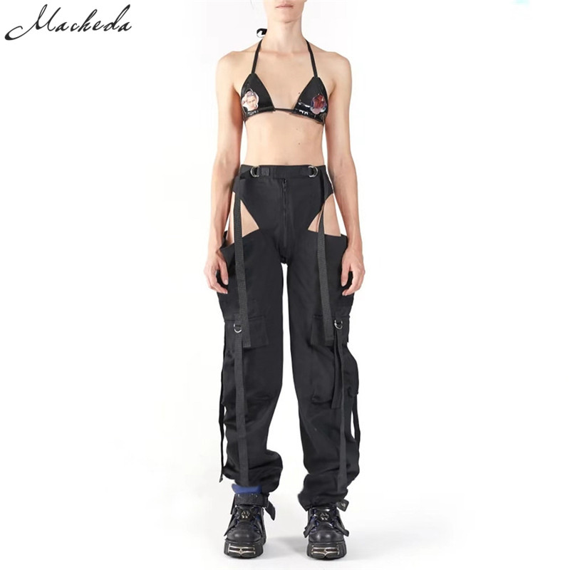 Black High Waist Hollow Up Zipper Trousers Loose Pockets Streetwear Casual Harem Pants L0035