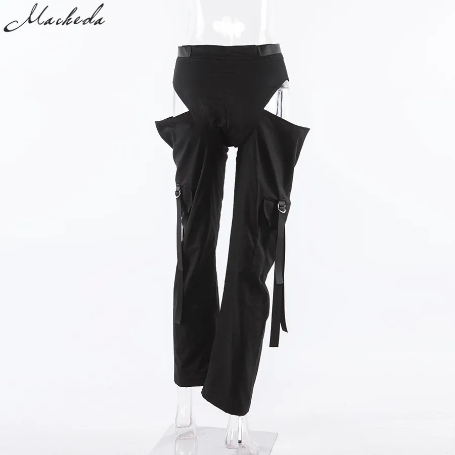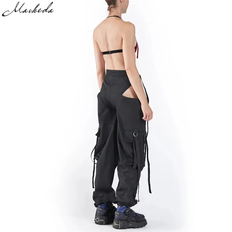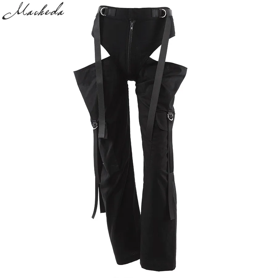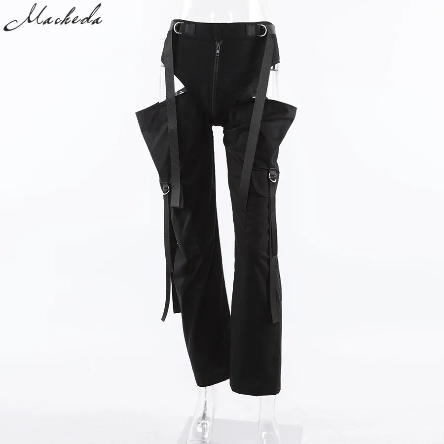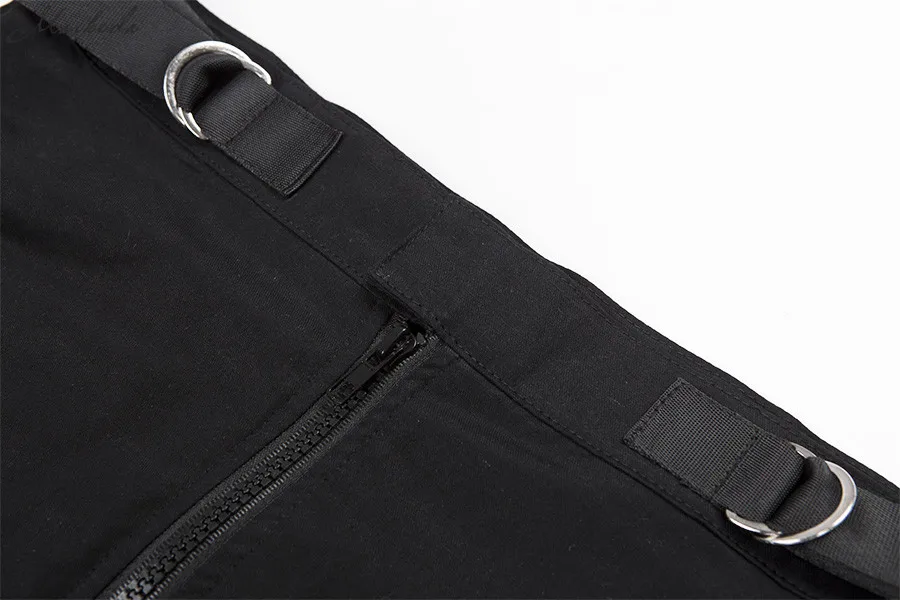 Black High Waist Hollow Up Zipper Trousers Loose Pockets Streetwear Casual Harem Pants L0035