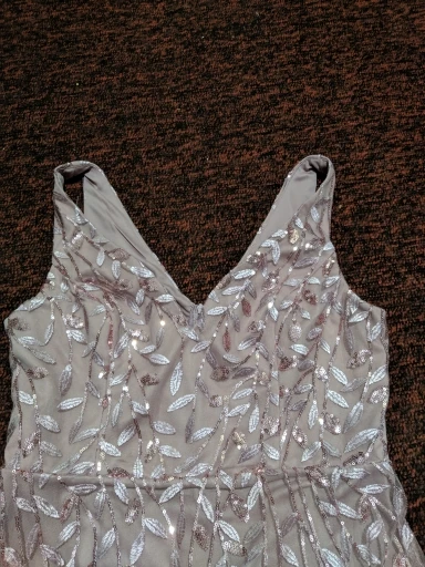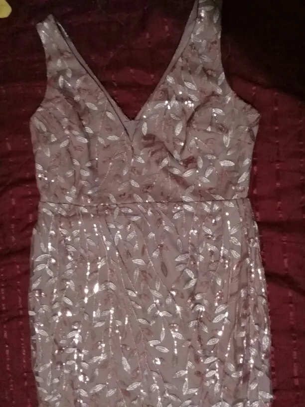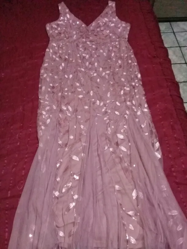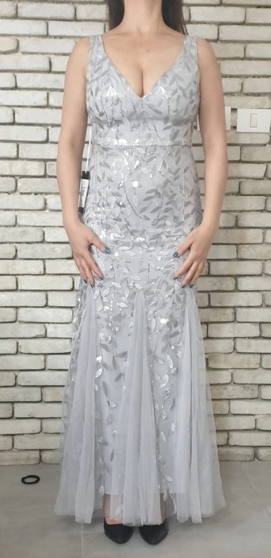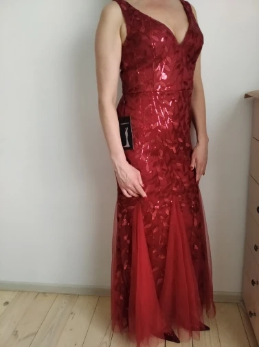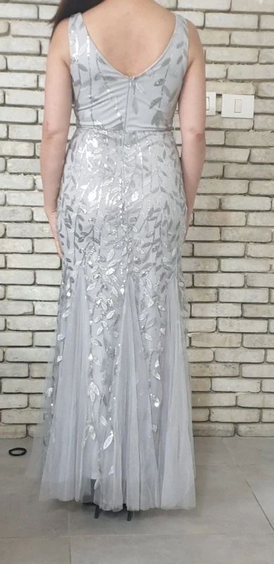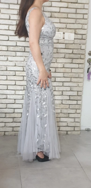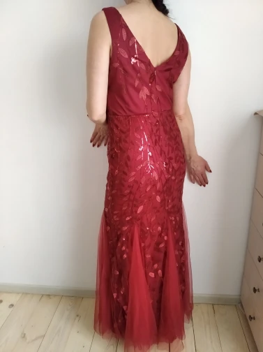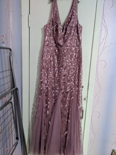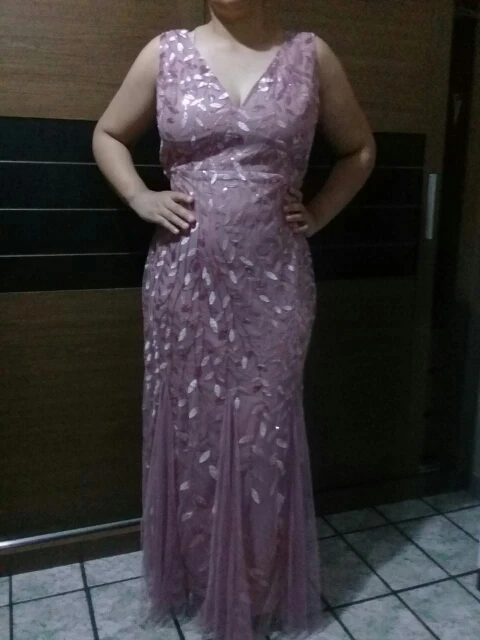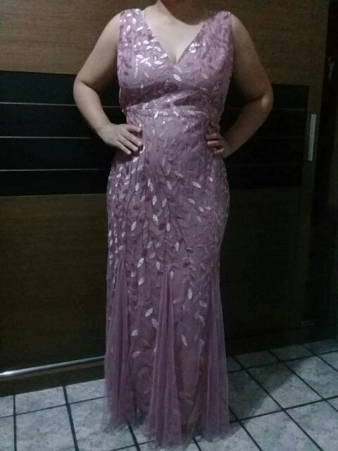 Платье прекрасное. На рост 168 см и параметры 96-76-108 взяла размер 14. Размерная сетка соответствует действительности. Как и ожидала в бедрах платье село идеально. В талии и в груди немного широкое, но я его . На мой рост, когда я босиком, то платье в пол, а если обуть туфли на каблуке, то платье не будет касаться пола. Цвет соответствует фото. Ткань 100% полиэстер. Ткань-сетка верхнего слоя мягкая и приятная на ощупь. Покроено платье отлично: все симметрично и нитки не торчат. Заказ пришел в Украину меньше, чем за 2 недели (супер быстро). Единственный минус это упаковка. Платье положили в 2 пакета. Внутренний даже без застежки. По городу доставка выпала на дождливые дни и когда я распаковала платье оно было полностью мокрым. Повезло, что не успело приобрести неприятный запах или заплесневеть.
