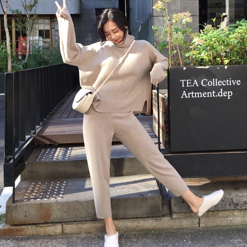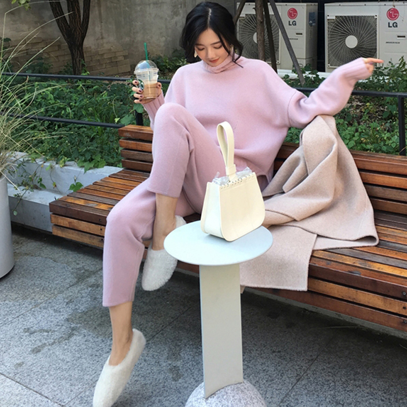 Casual Sweater Pants Knitted Set Turtleneck Pullovers And Elastic Waist Pants