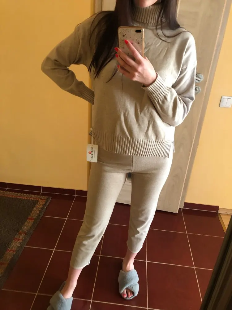 Very happy with this set, the fabric is great and feels really nice on the skin. I usually wear M and my height is 173cm, so of course the pants are a bit short as you can see in the picture, but this “capri” style look is ok for me. And the sweater is not baggy as it looked in the pictures, but not tight either (sleeves are just the right lenght!). All in all really satisfied with the set. Also store added cute hairtie as a gift.