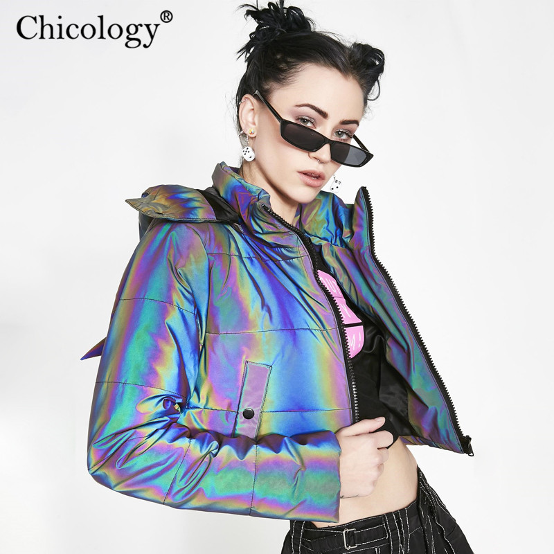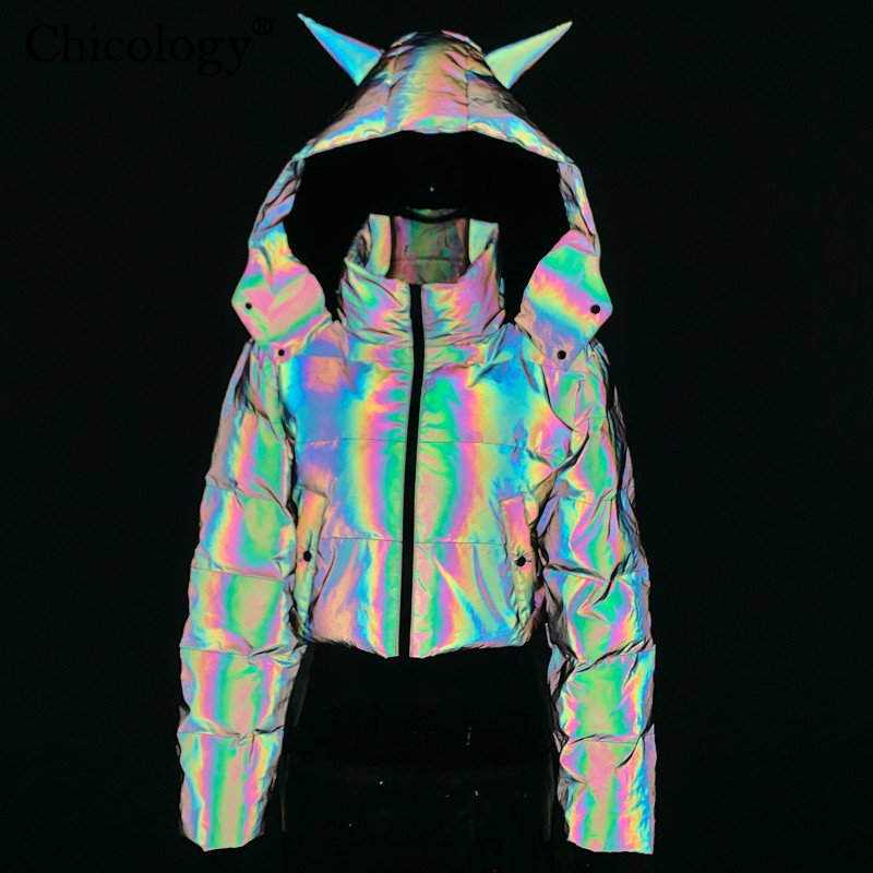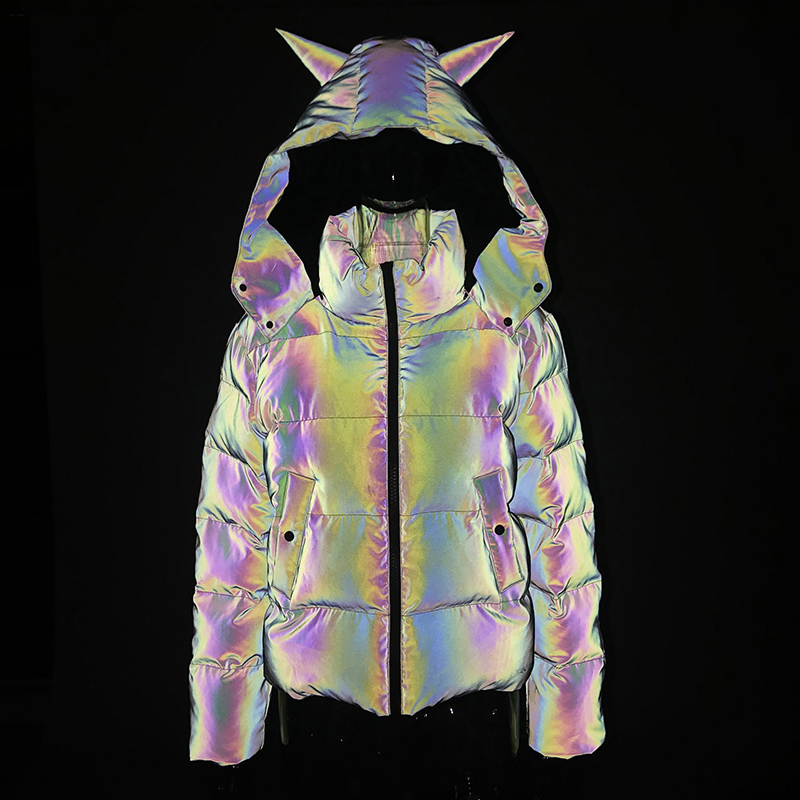 Devil Hooded Reflective Cotton Padded Women Crop Jacket Winter Coat Long Sleeve Zipper L0180