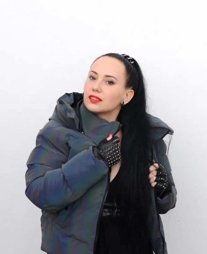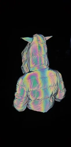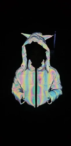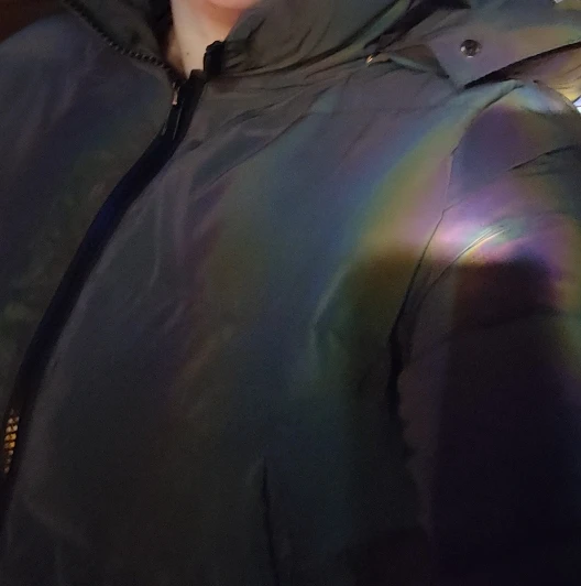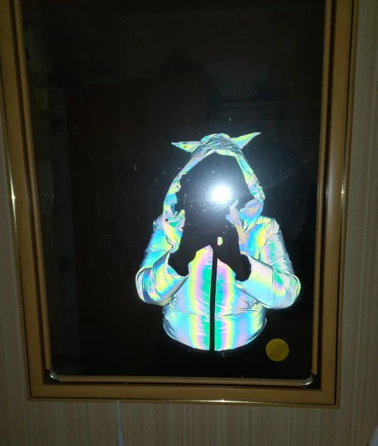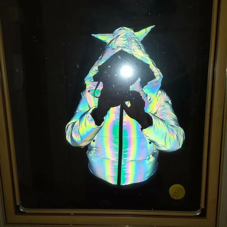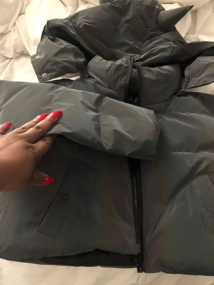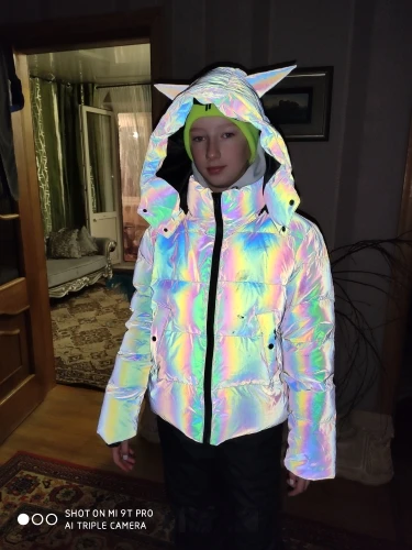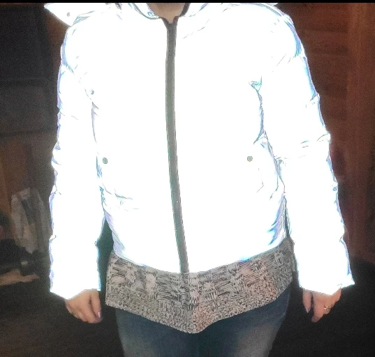Chic jacket. If without weighting, the color is gray with overflow type gasoline. In the light of the headlights bright white, when the phone flash rainbow. Carefully read the measurements, if all is true, sits perfectly. I liked it very much, it was sewn neatly, the threads do not stick out, there is no smell. I highly recommend to order. She took a long one. Length as photo one to one.