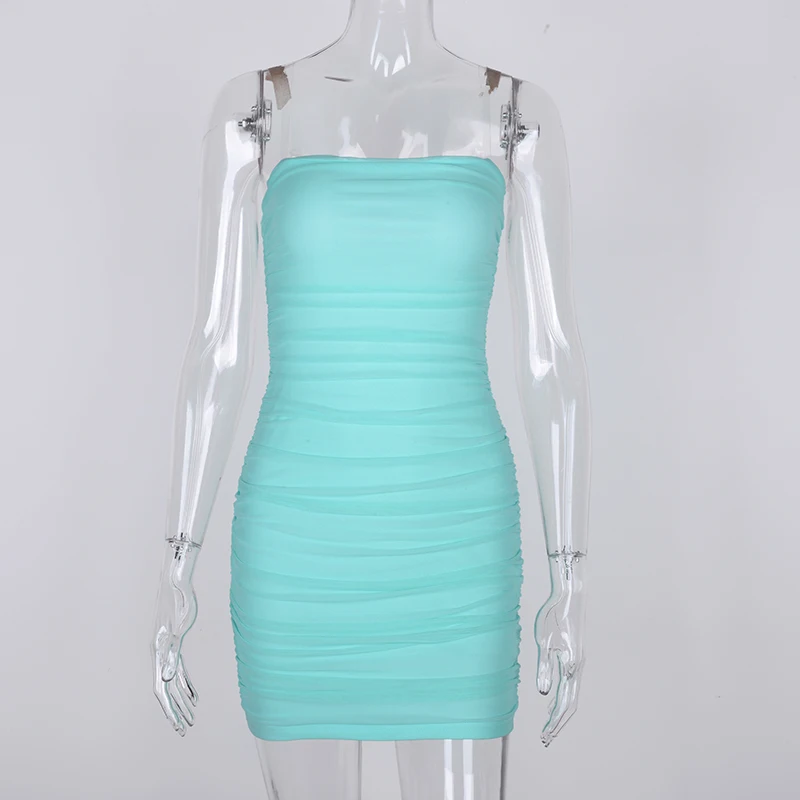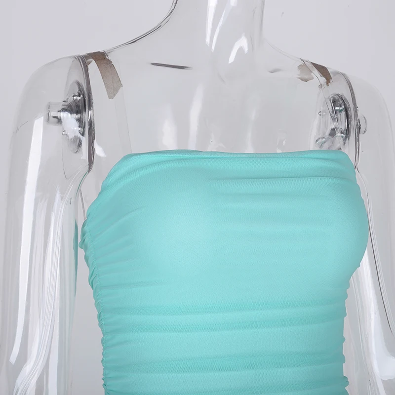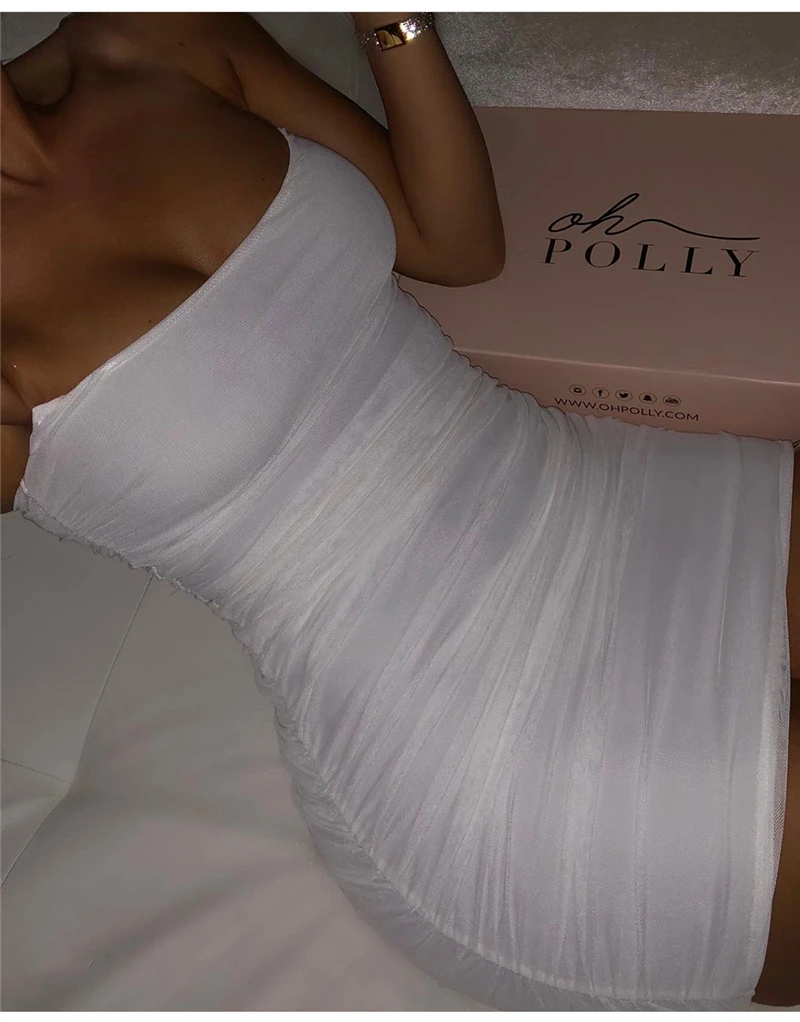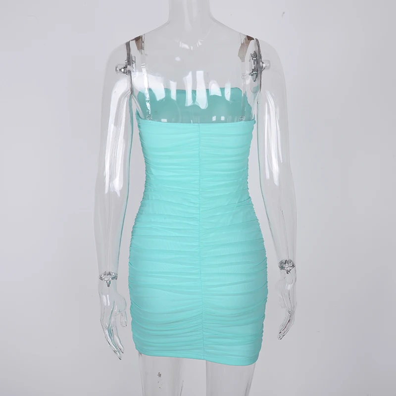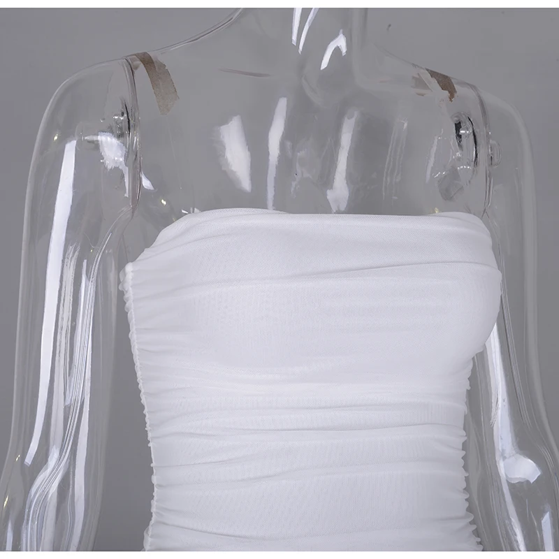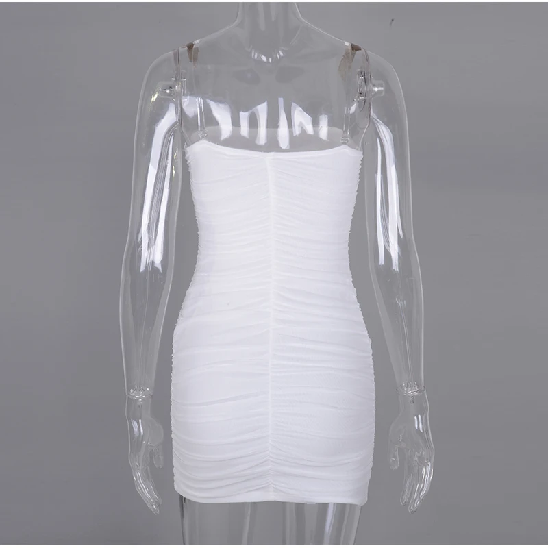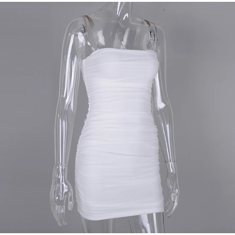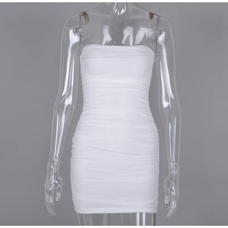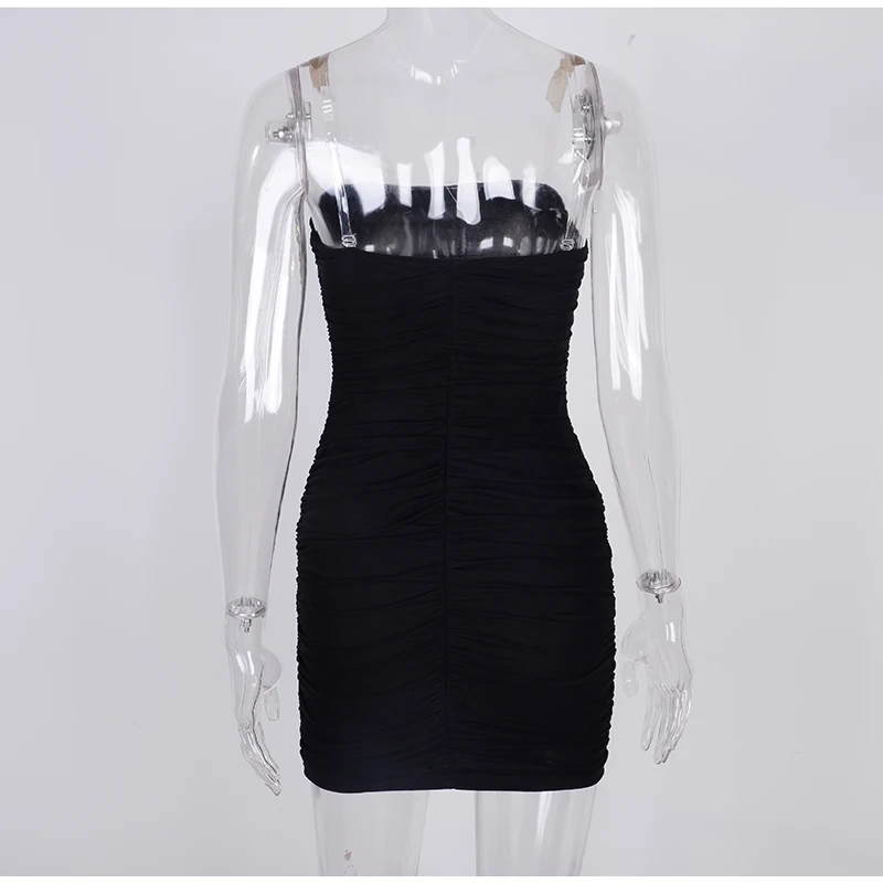 Dresses Clear Strap Slash Neck Mesh Short Ruched Bodycon Club Mini Dress L0008