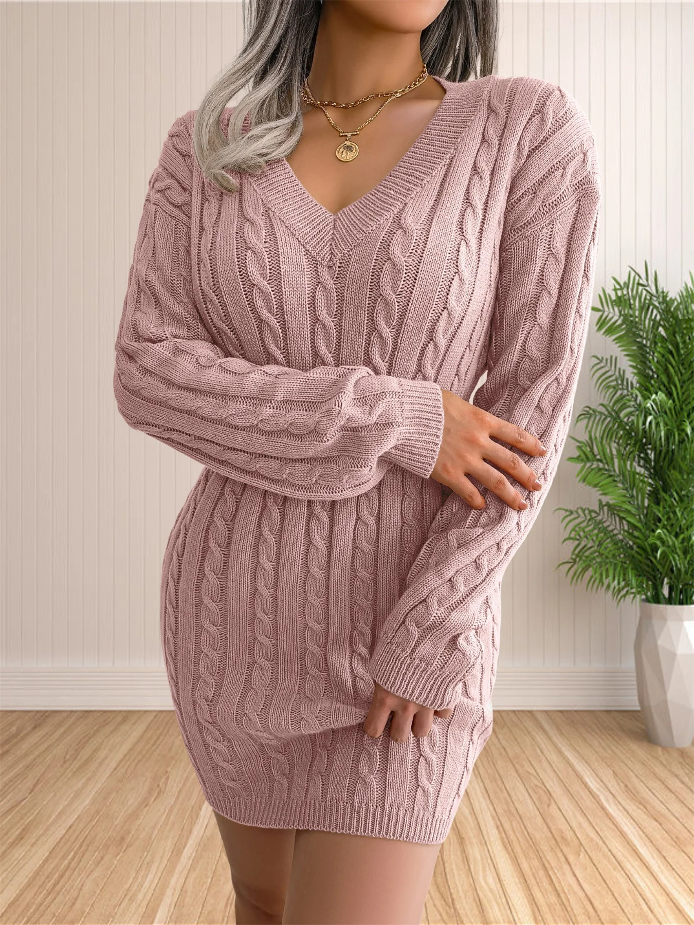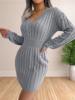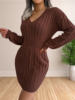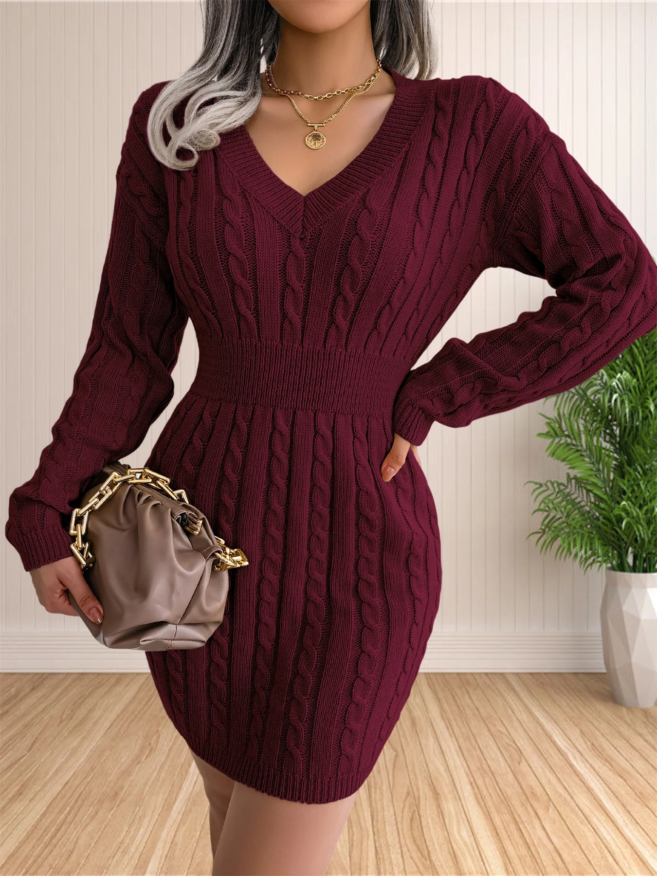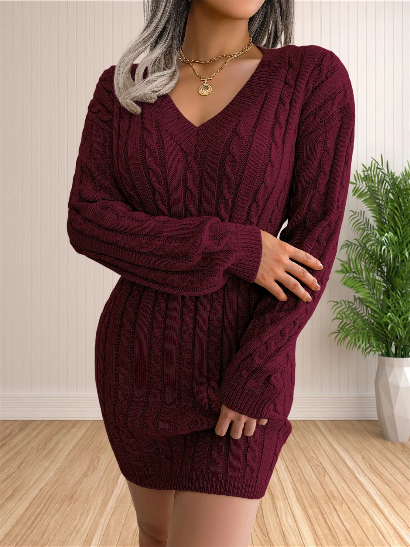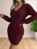 Elegant Cable Knit V-Neck Mini Dress Burgundy Long Sleeve Bodycon Sweater Dress OUT1177