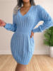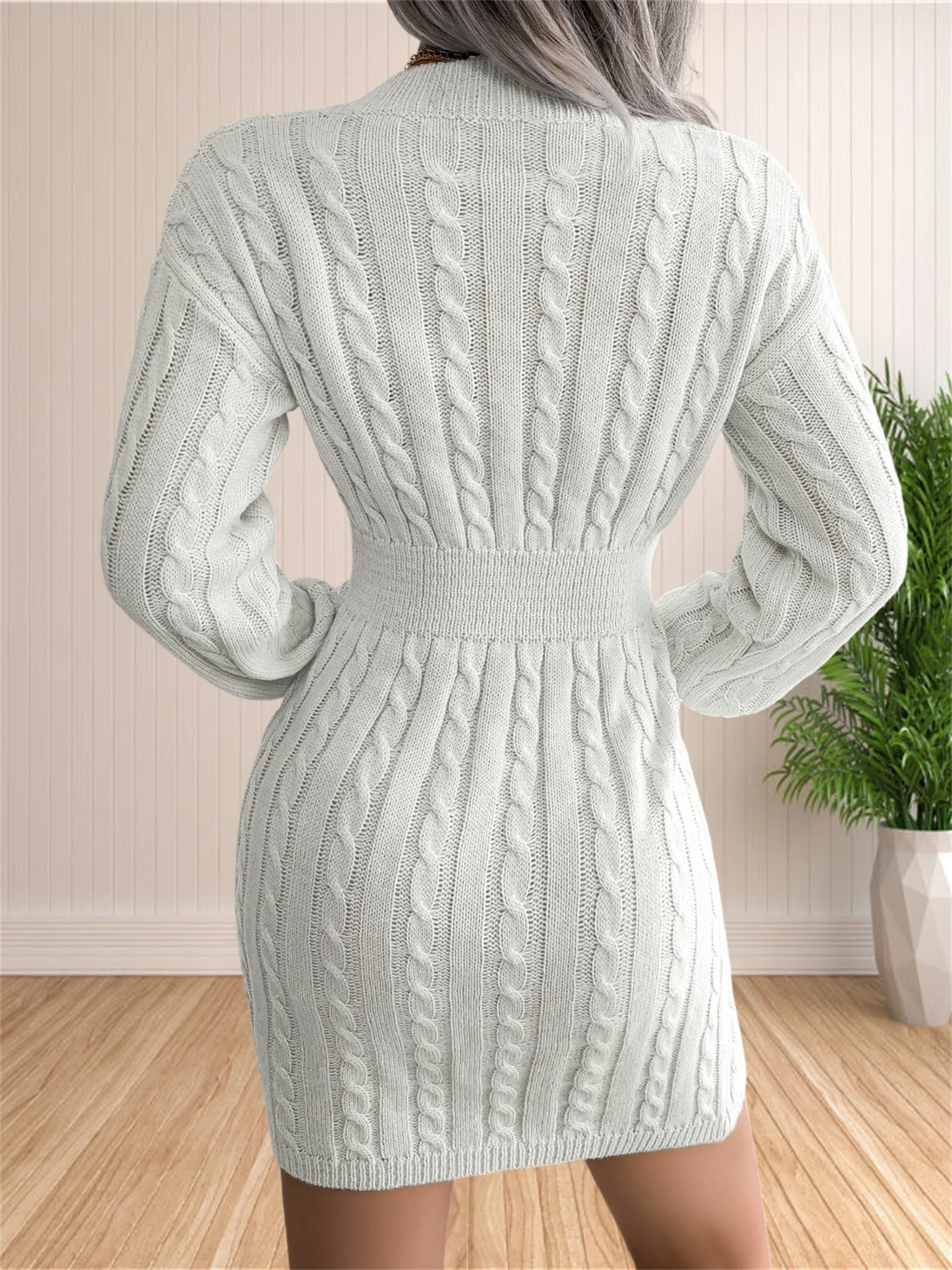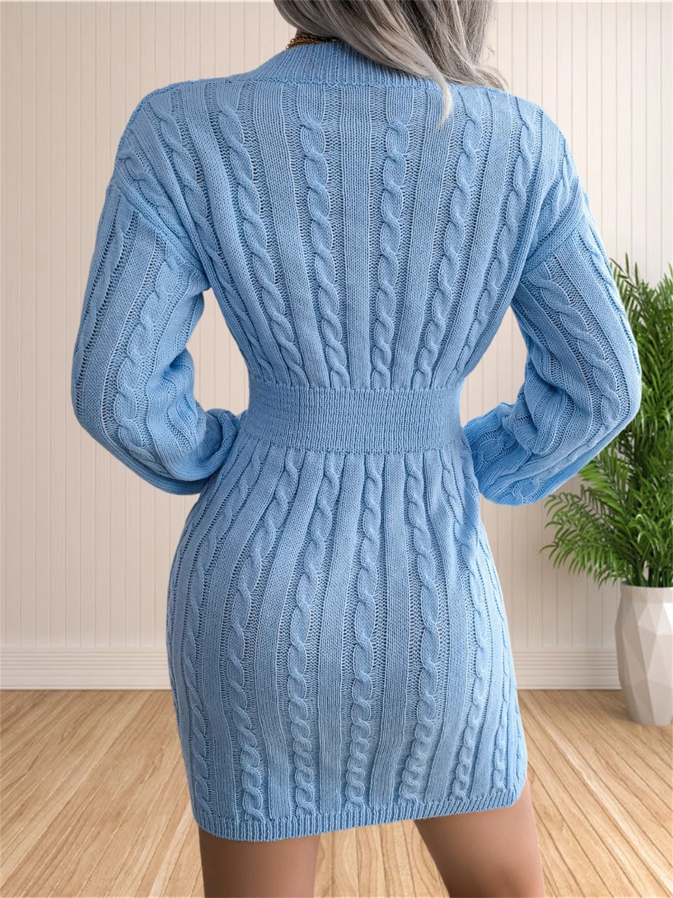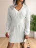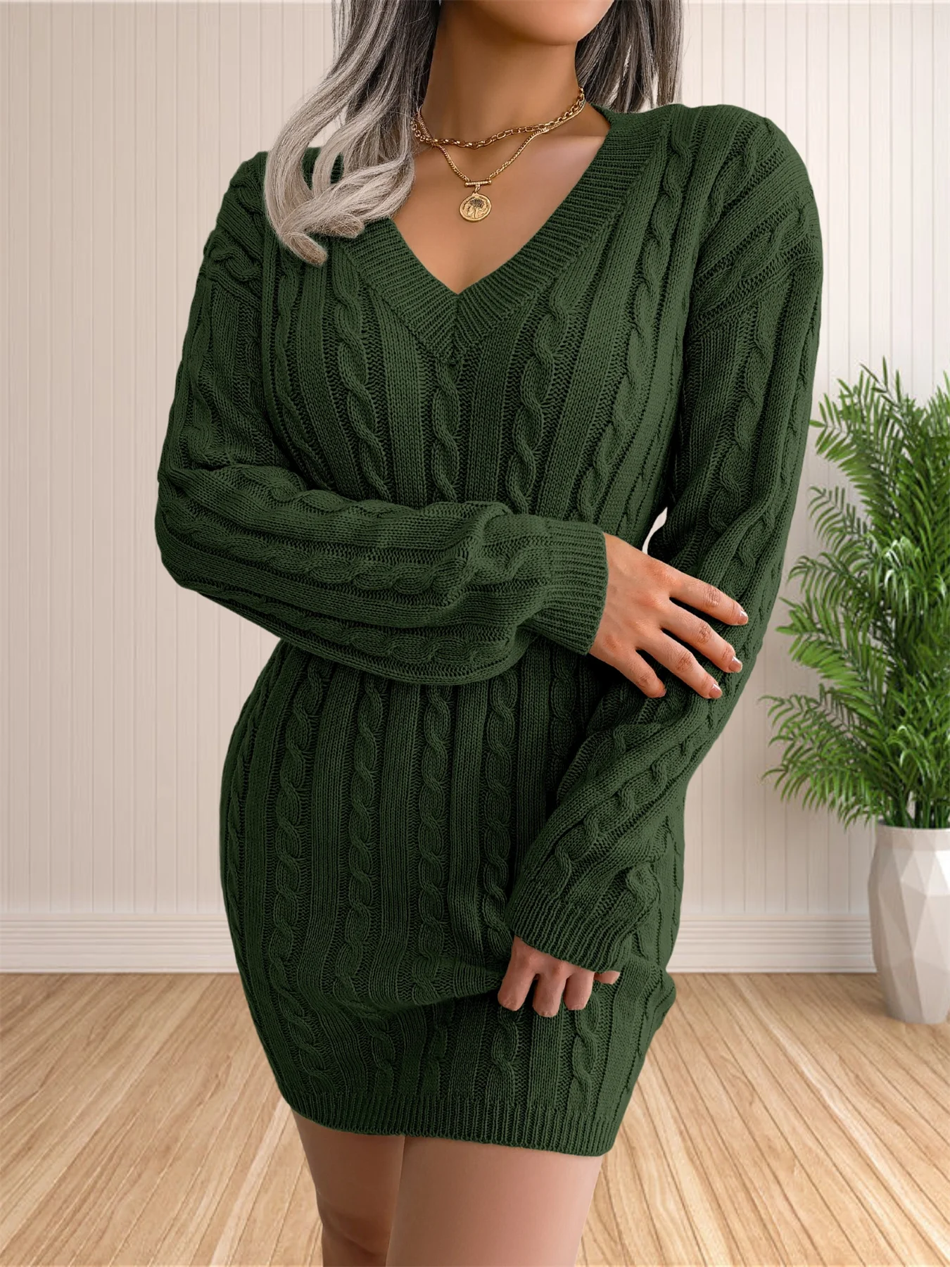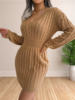 Elegant Cable Knit V-Neck Mini Dress Burgundy Long Sleeve Bodycon Sweater Dress OUT1177