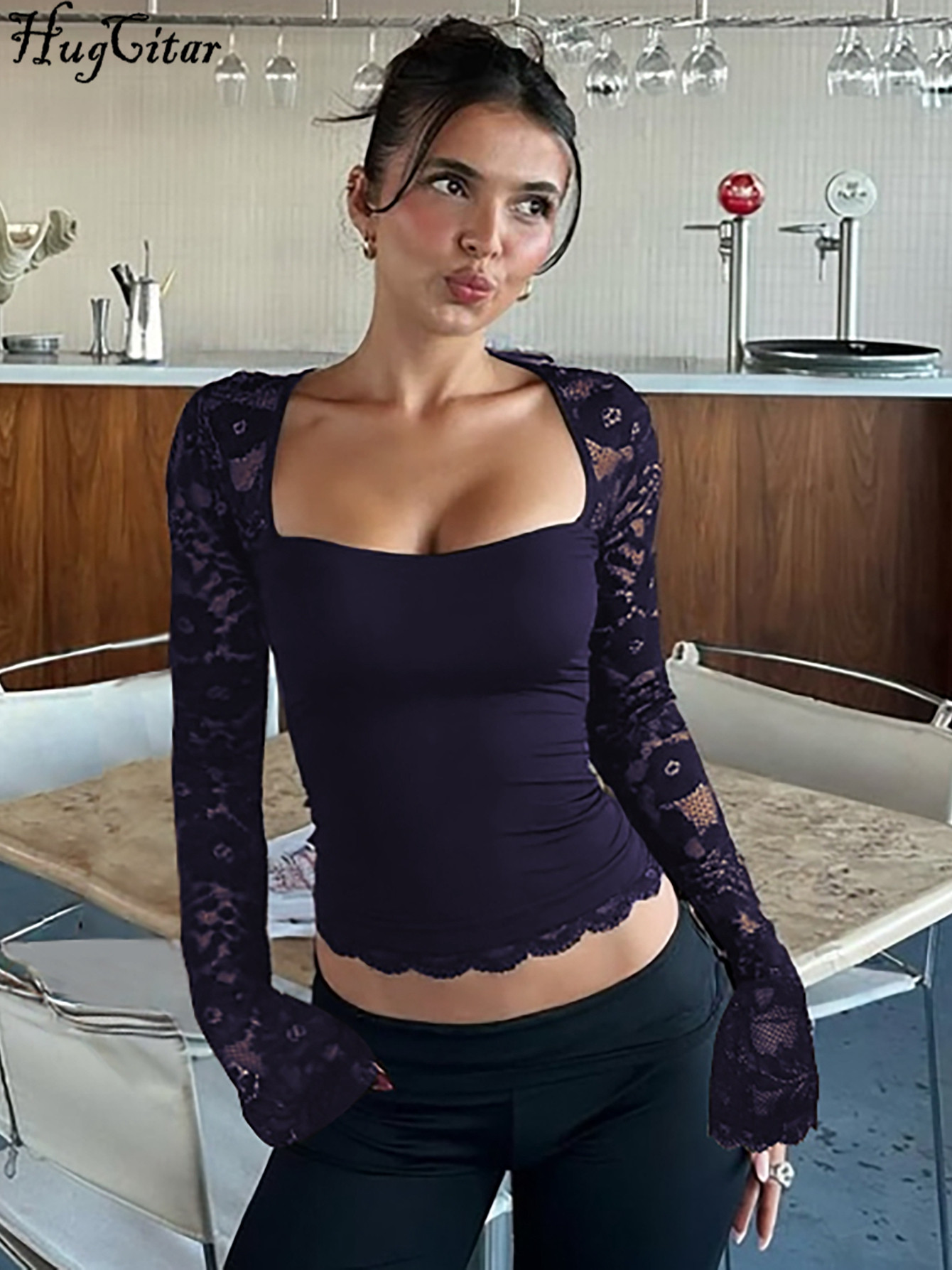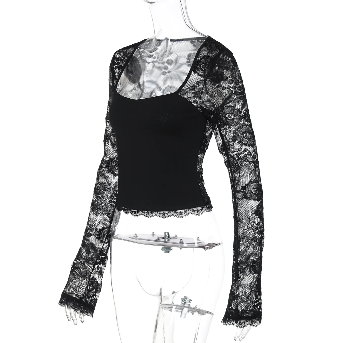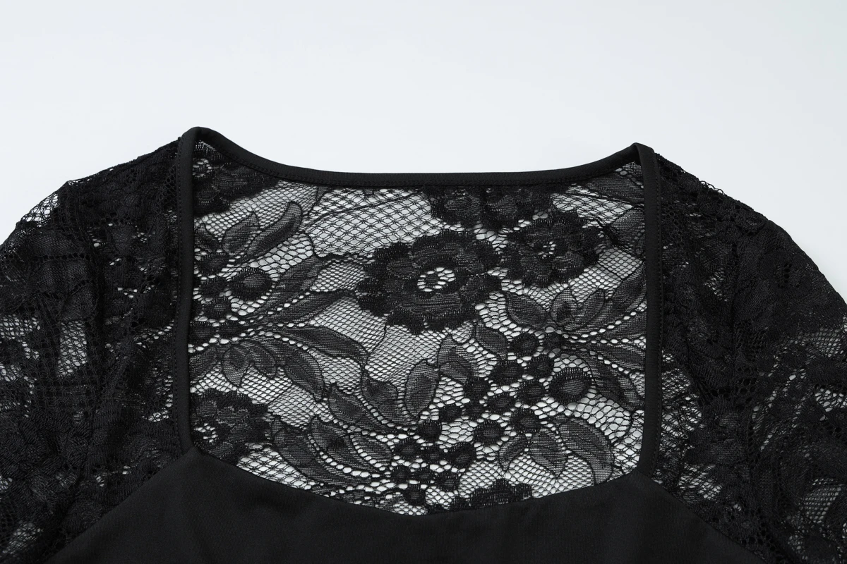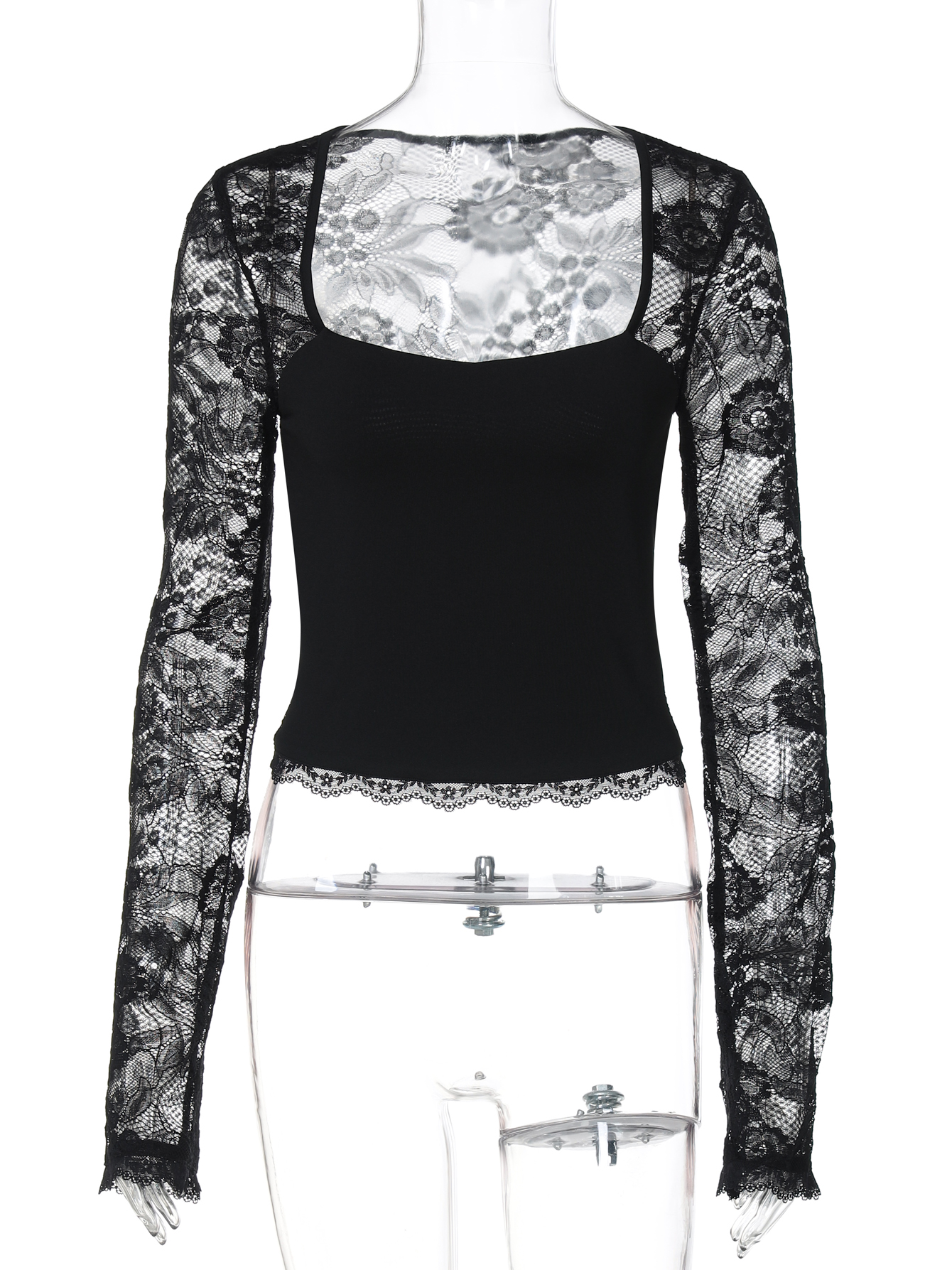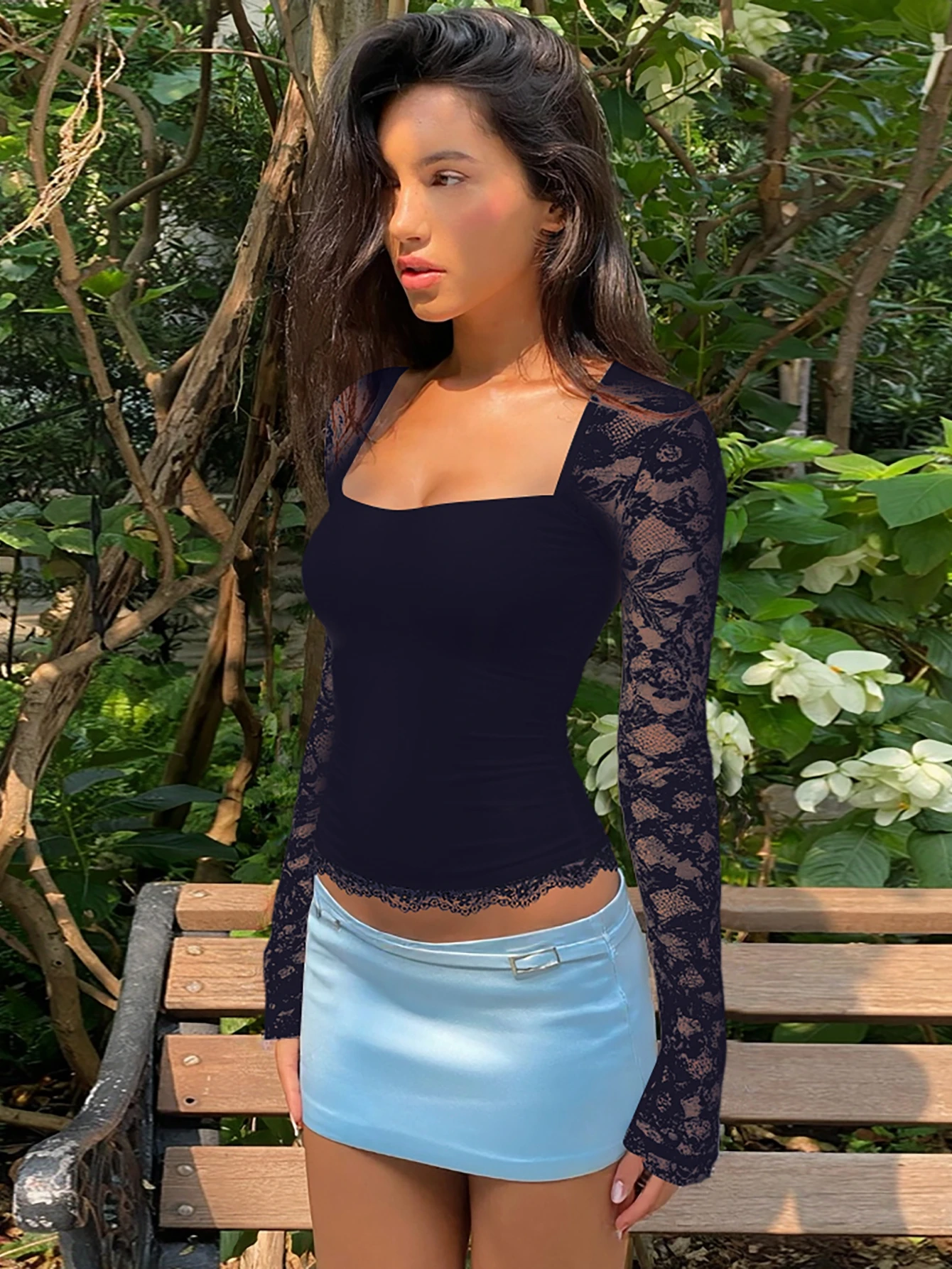 Elegant Lace Patchwork Long Sleeve Square Neck Slim Fit Tops OUT1055