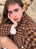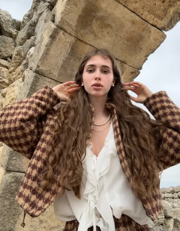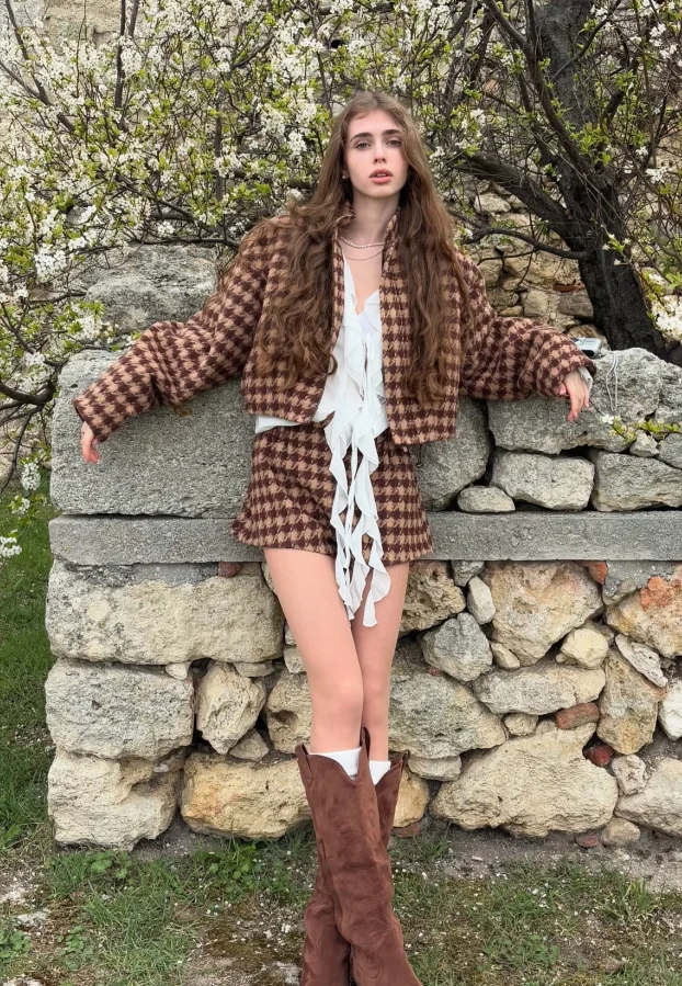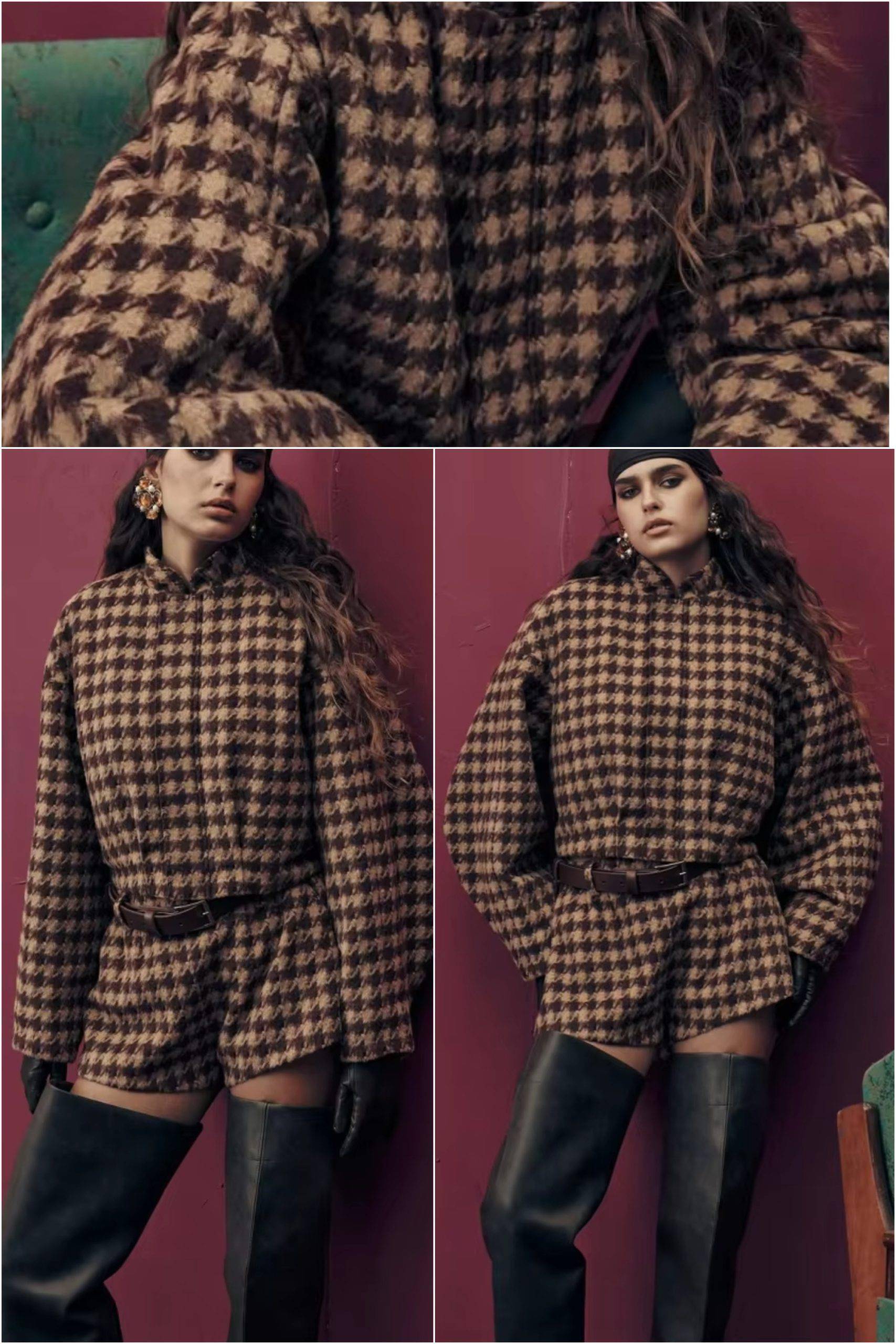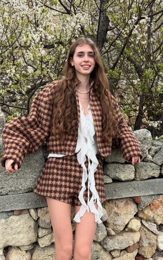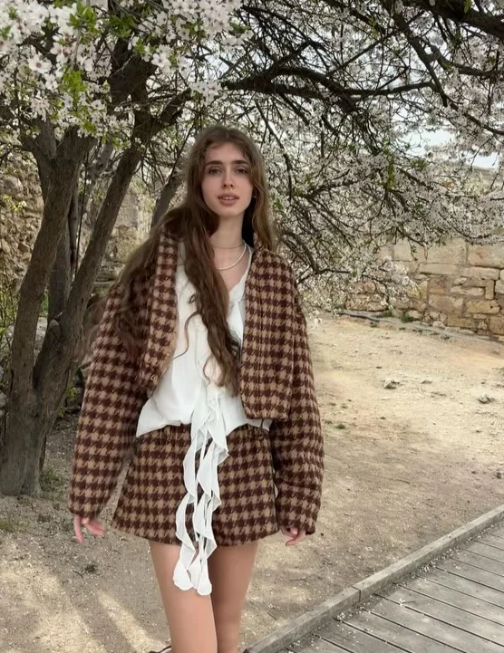 This houndstooth suit is simply a fashion model! Brown is classic and versatile, with loose tops and shorts, showing a sense of high quality in casual. The fabric looks soft and comfortable, which is very suitable for going out everyday. Whether it's with a casual knit hat or with exquisite accessories, you can easily switch styles and be full of fashion!