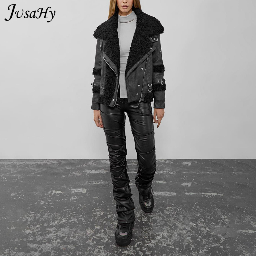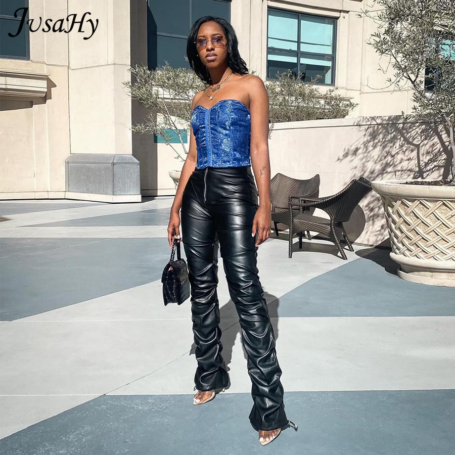 FREE SHIPPING 2022 Trend Black PU Leather Pleated Stacked Pants OUT0895