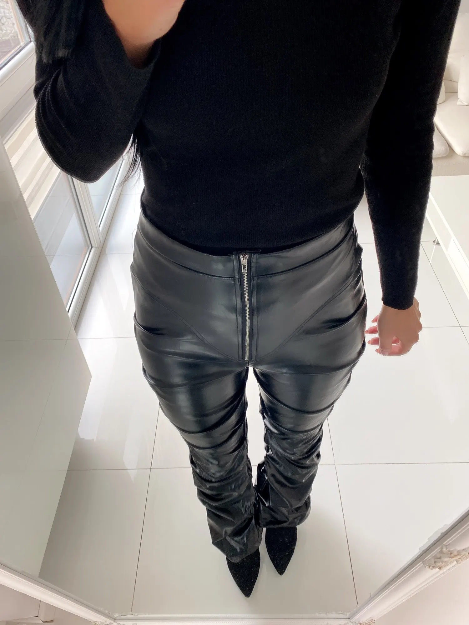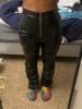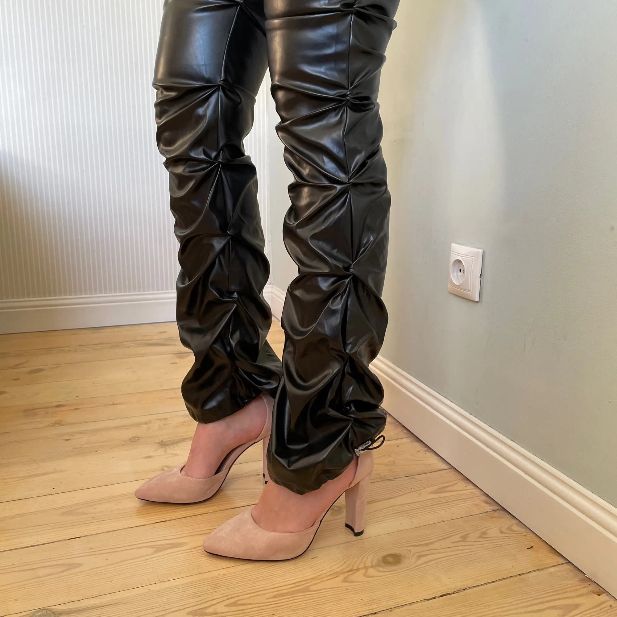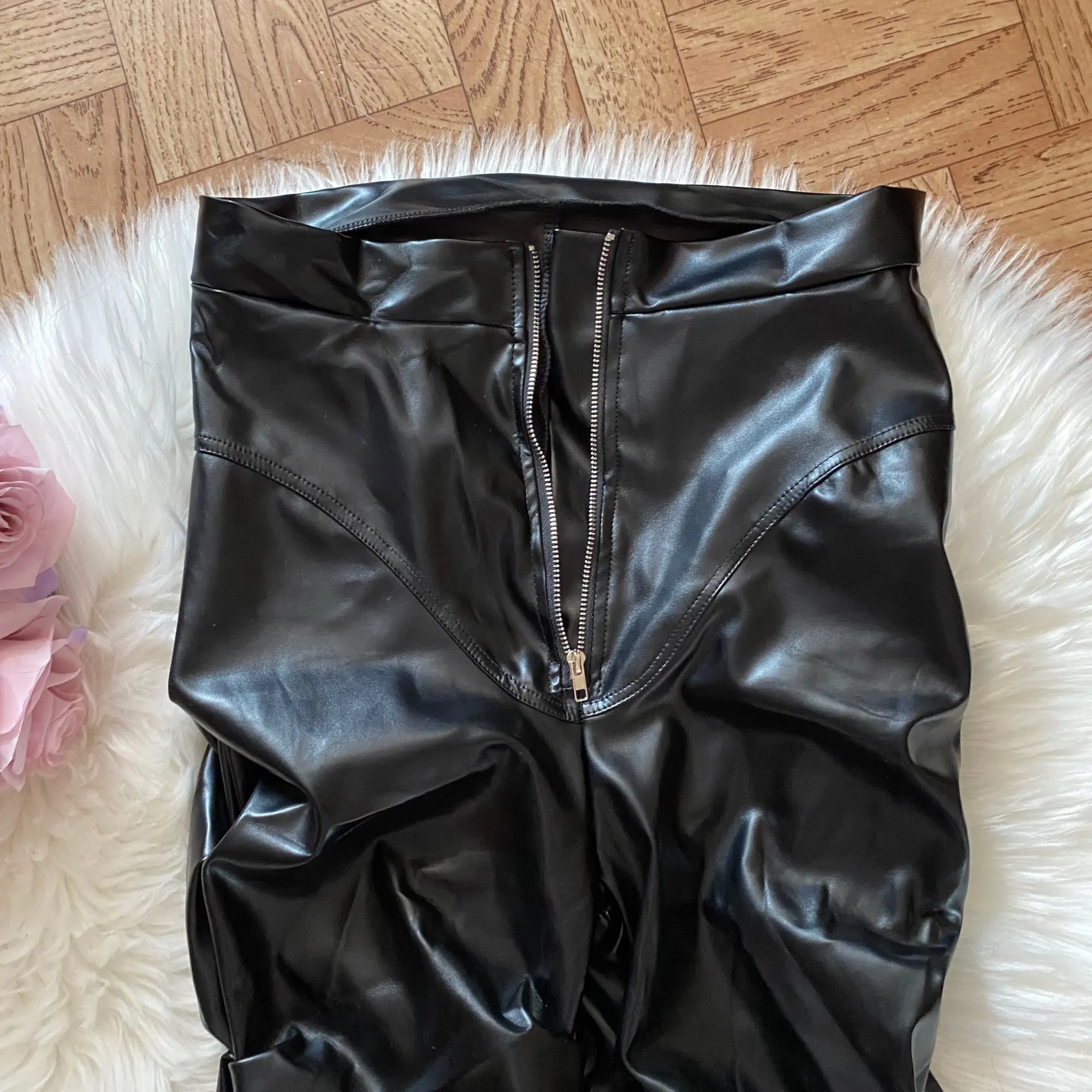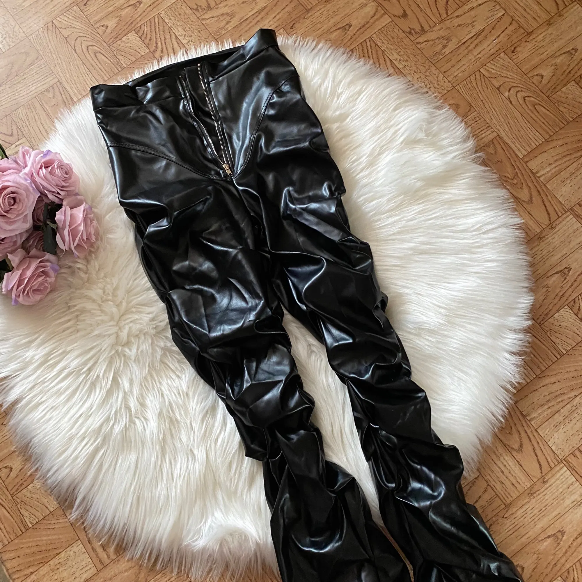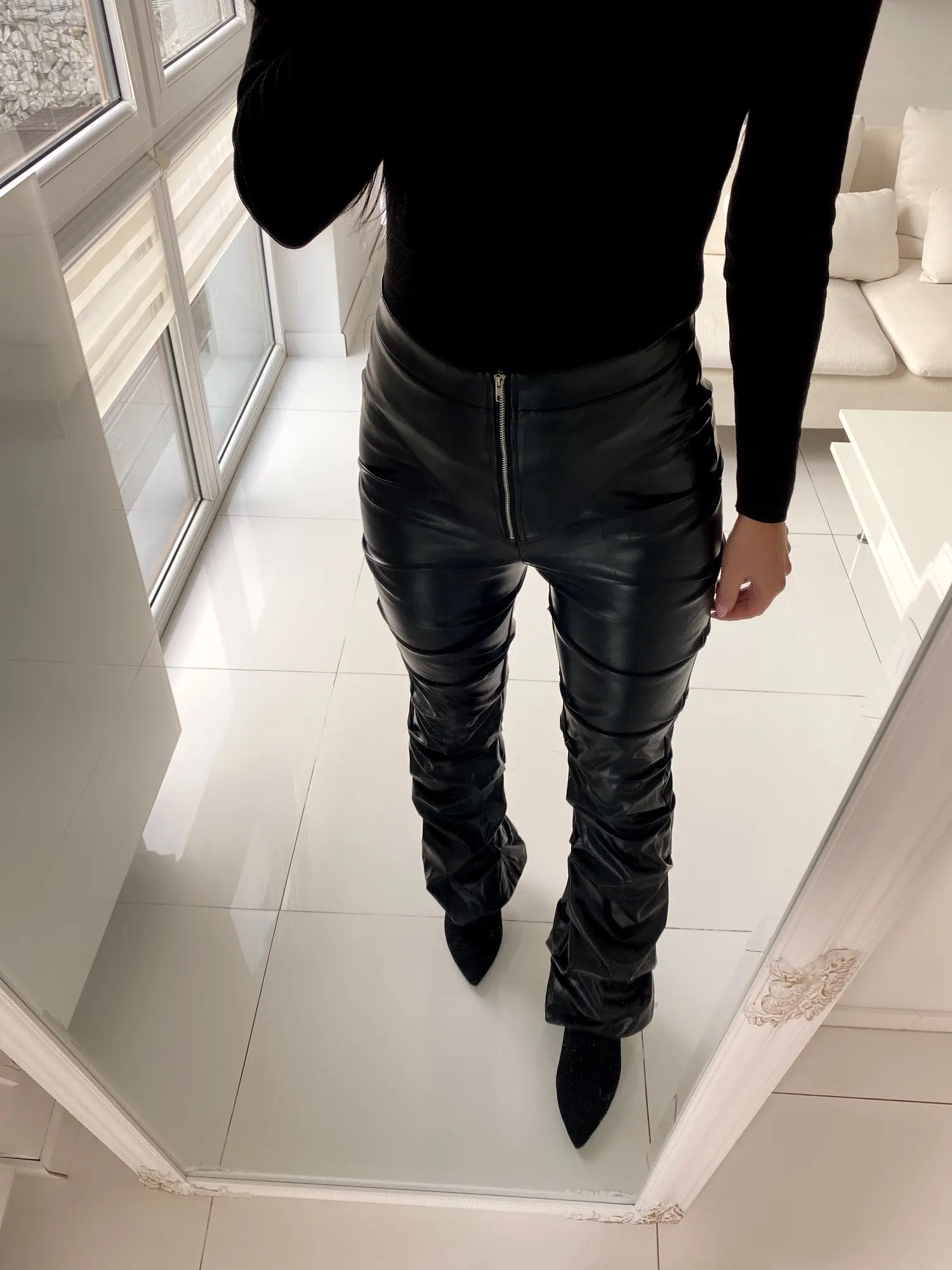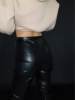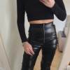 Eco leather pants. WITH A high waist crinkle leg, bottom rozszerzane leg-is adjustable can zwęzić bottom. Front zipped silver slider. Great fashion. Pants układają Sie beautifully. I wearing size M 68 cm waist, 92 cm hip, 174 cm tall. Perfectly fitted-material jeat flexible.