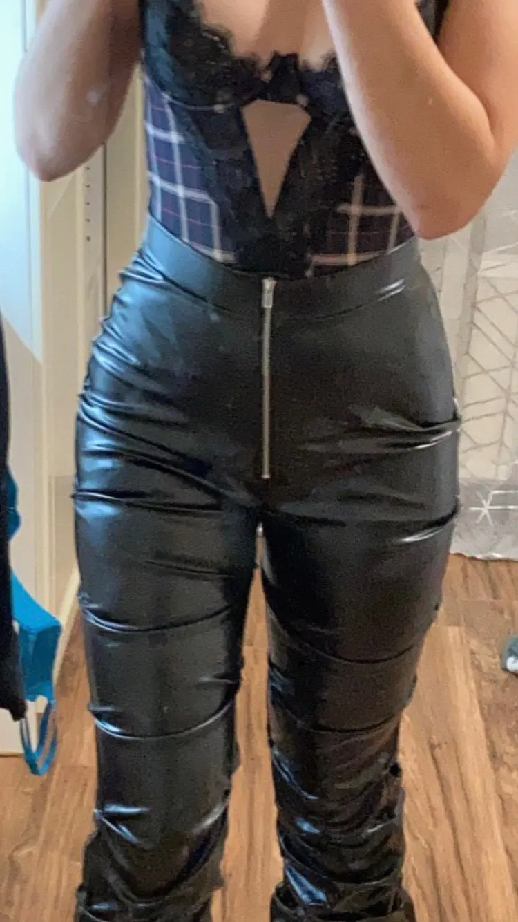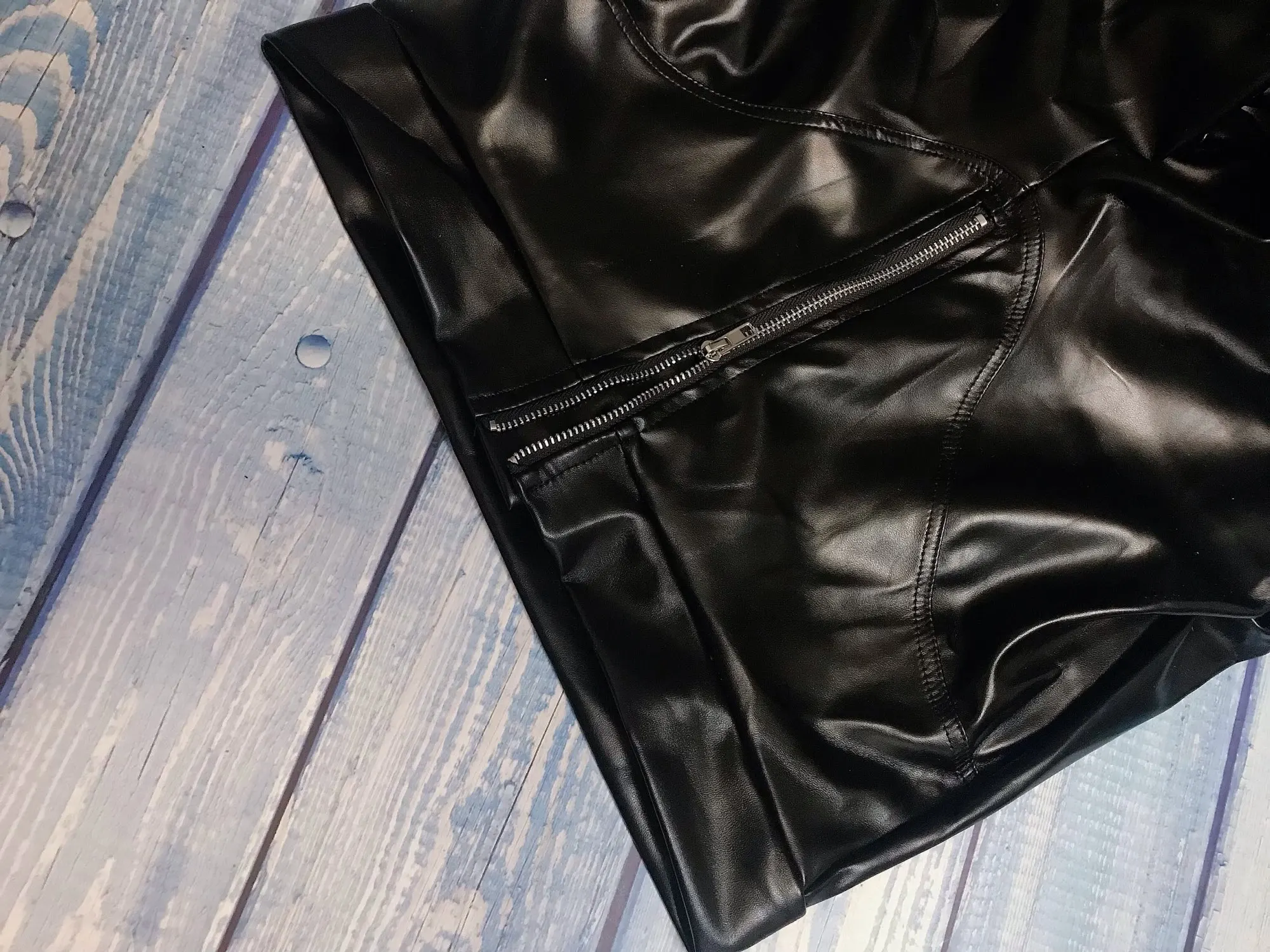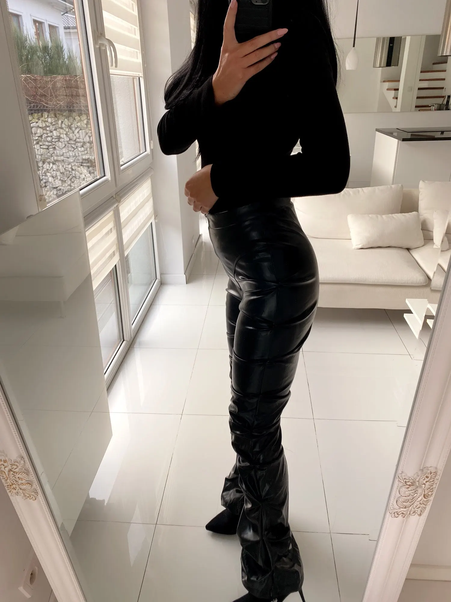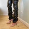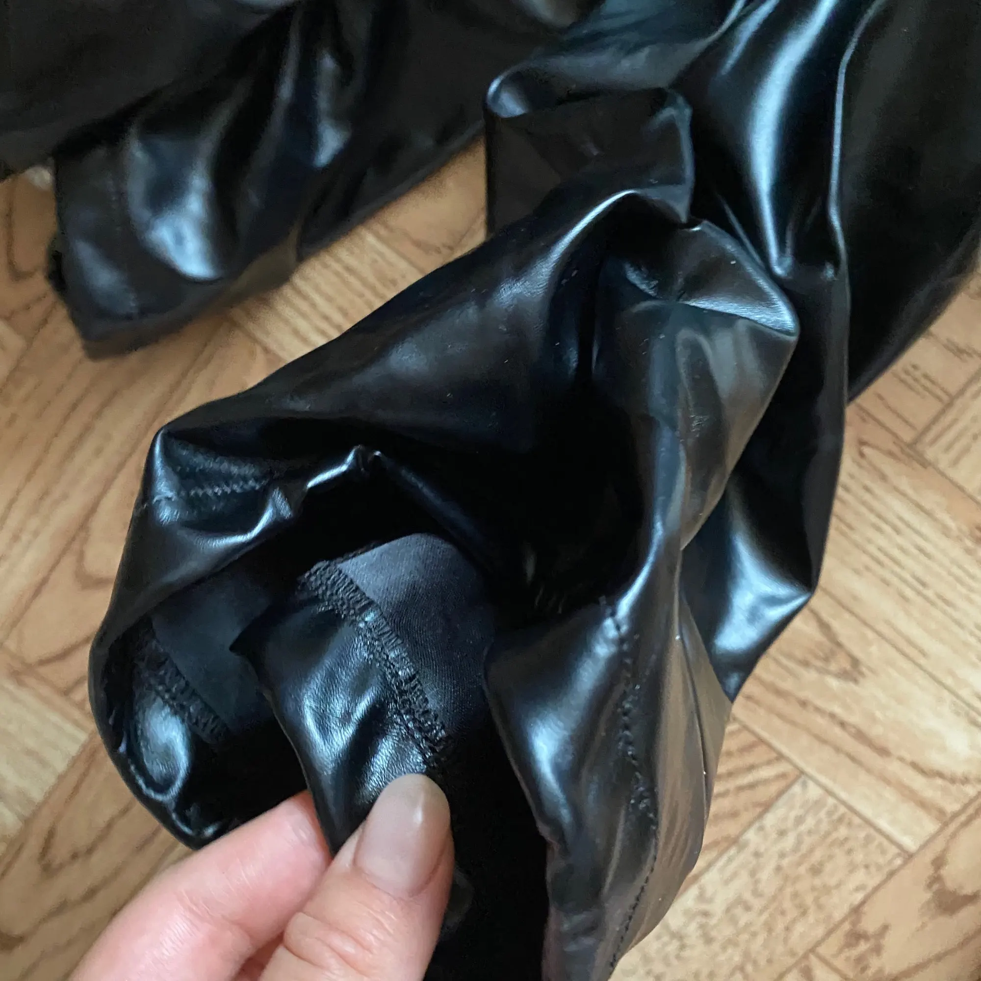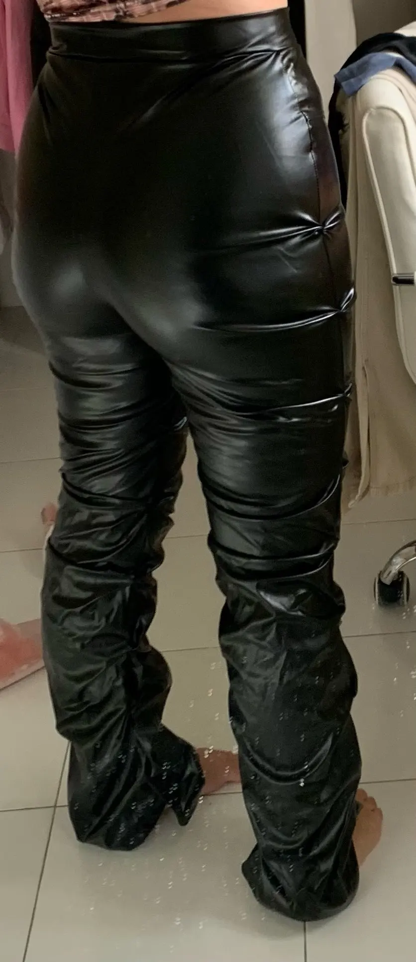Eco leather pants. WITH A high waist crinkle leg, bottom rozszerzane leg-is adjustable can zwęzić bottom. Front zipped silver slider. Great fashion. Pants układają Sie beautifully. I wearing size M 68 cm waist, 92 cm hip, 174 cm tall. Perfectly fitted-material jeat flexible.