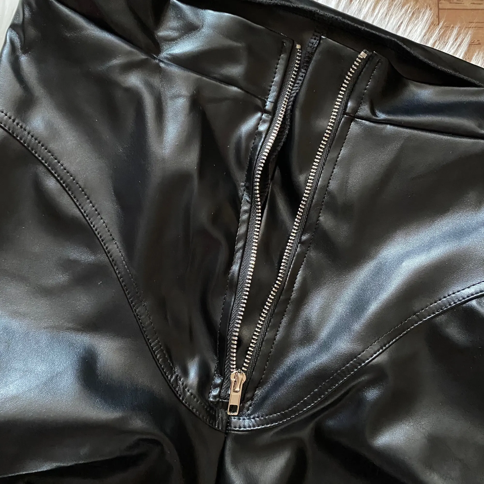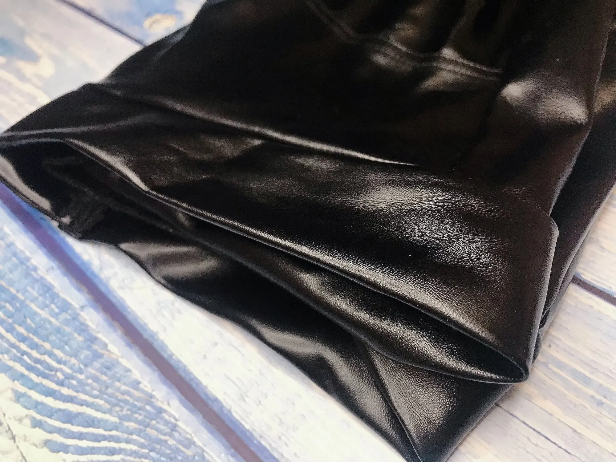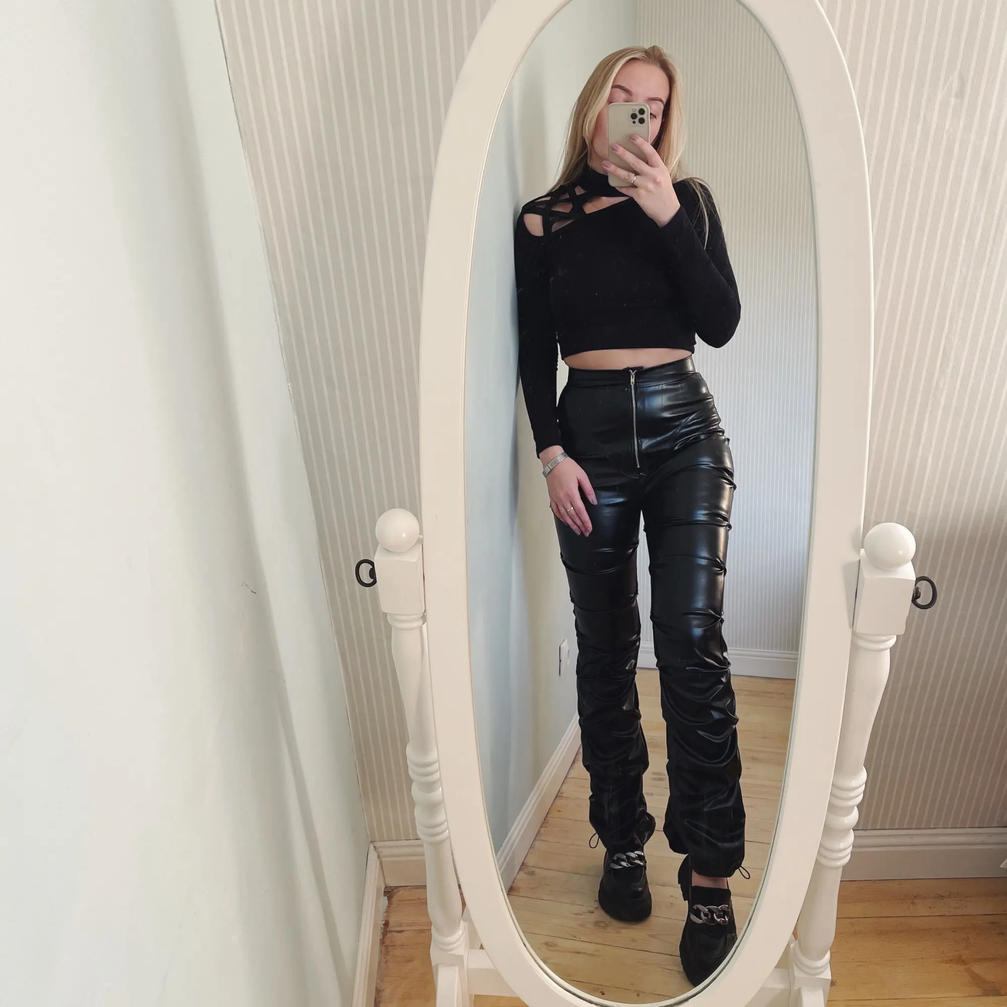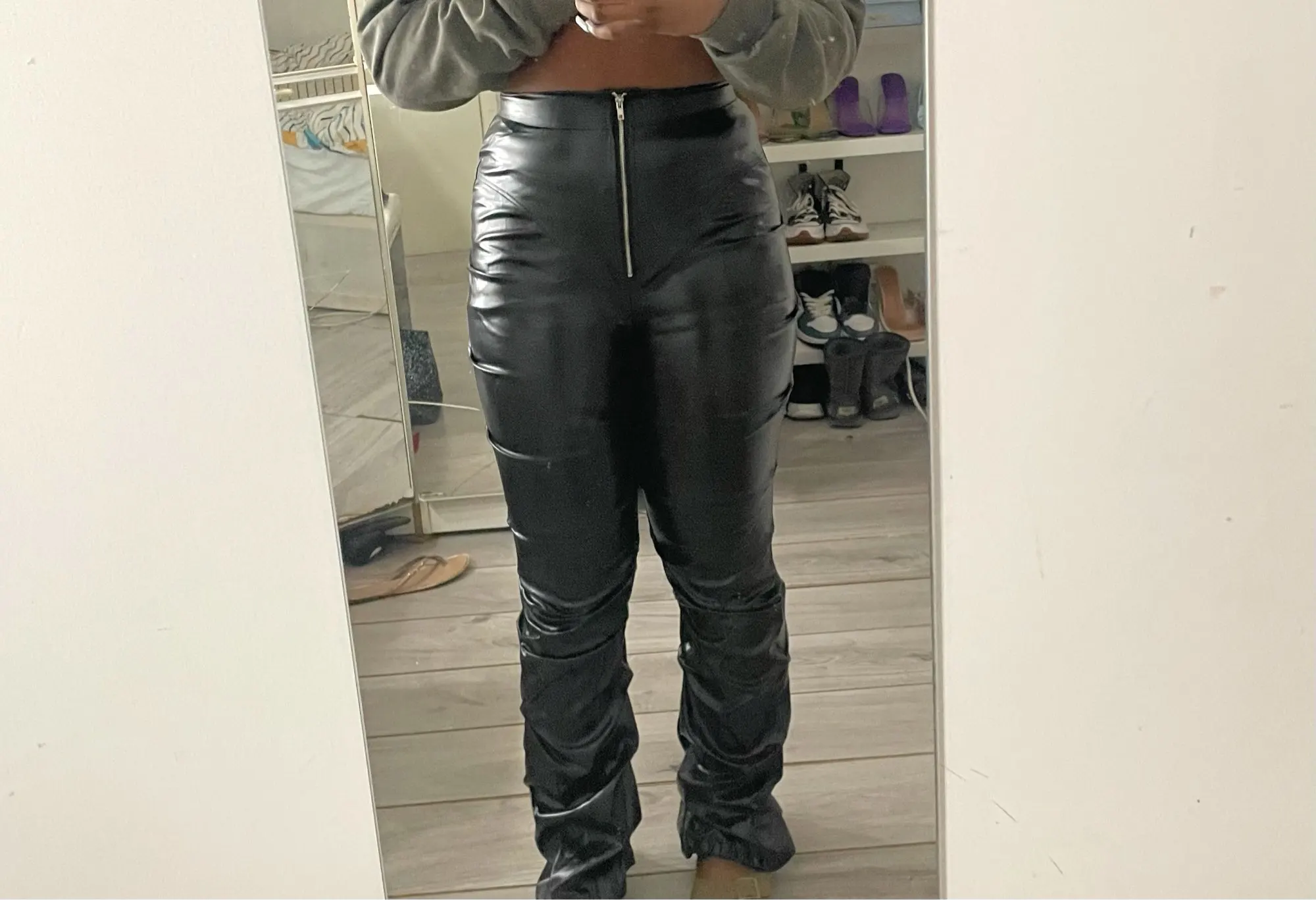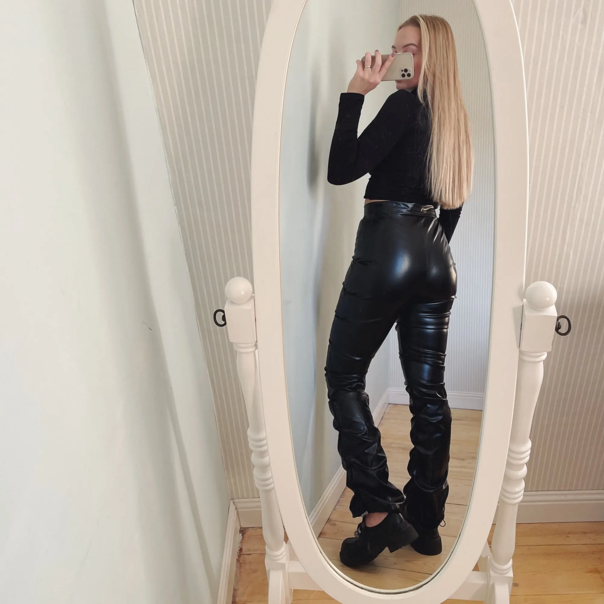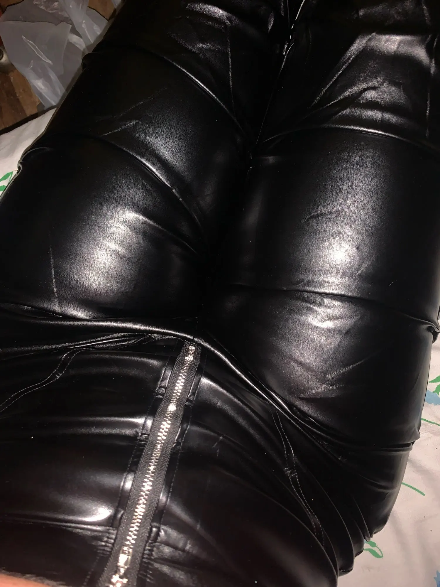 Eco leather pants. WITH A high waist crinkle leg, bottom rozszerzane leg-is adjustable can zwęzić bottom. Front zipped silver slider. Great fashion. Pants układają Sie beautifully. I wearing size M 68 cm waist, 92 cm hip, 174 cm tall. Perfectly fitted-material jeat flexible.