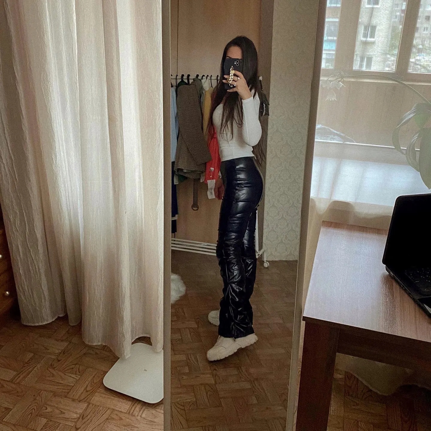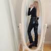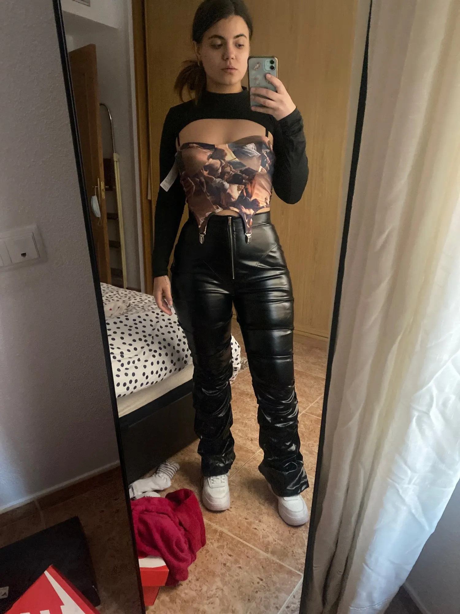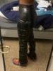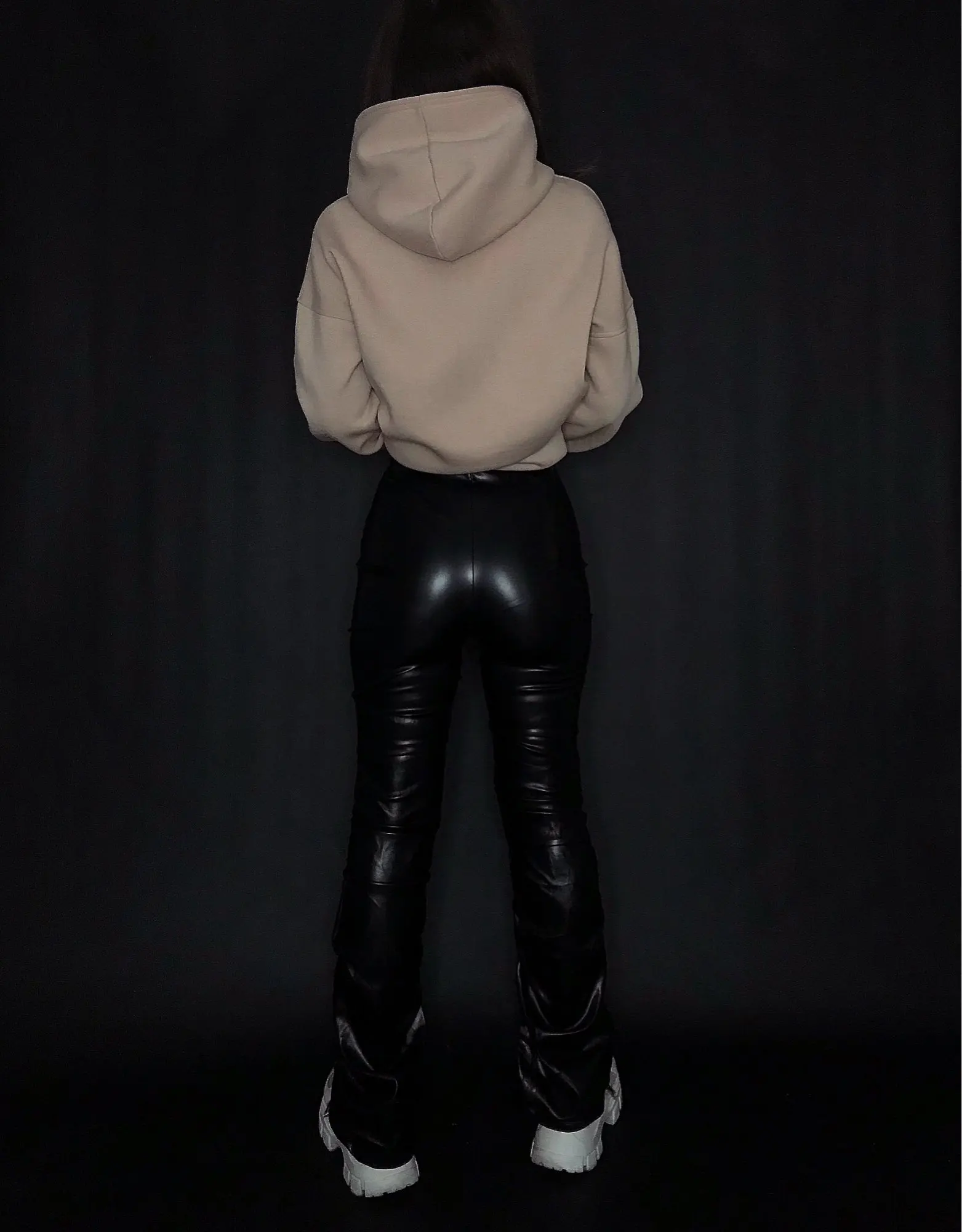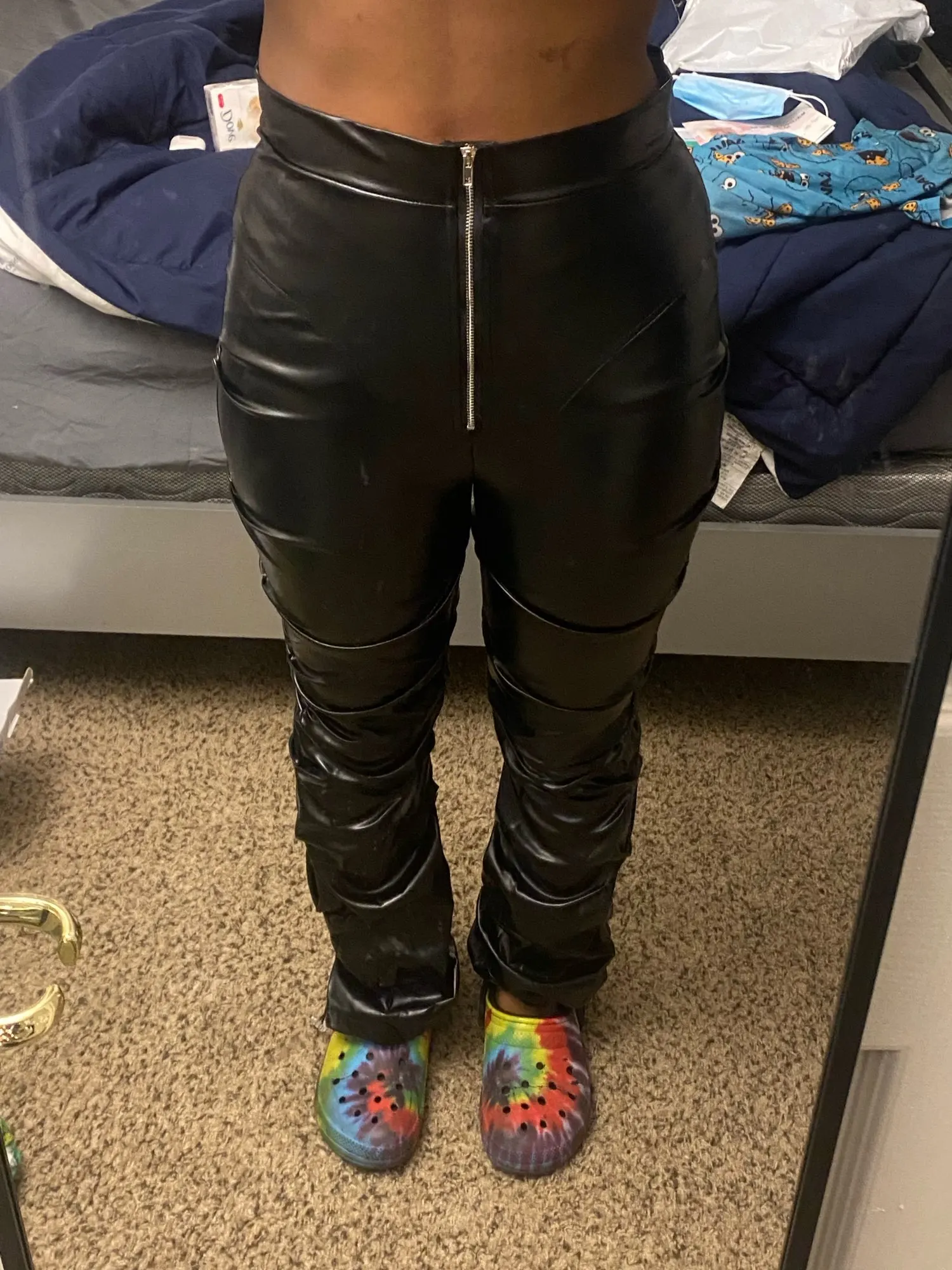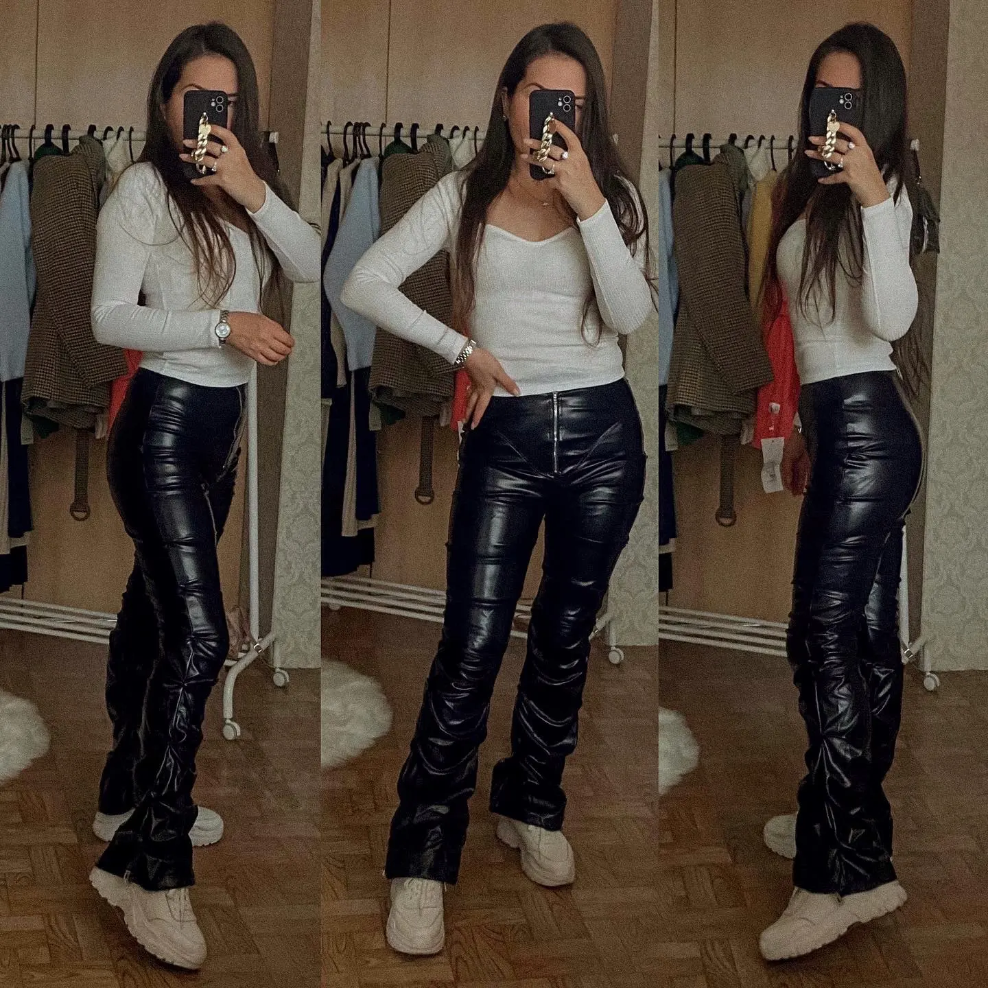 Eco leather pants. WITH A high waist crinkle leg, bottom rozszerzane leg-is adjustable can zwęzić bottom. Front zipped silver slider. Great fashion. Pants układają Sie beautifully. I wearing size M 68 cm waist, 92 cm hip, 174 cm tall. Perfectly fitted-material jeat flexible.