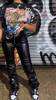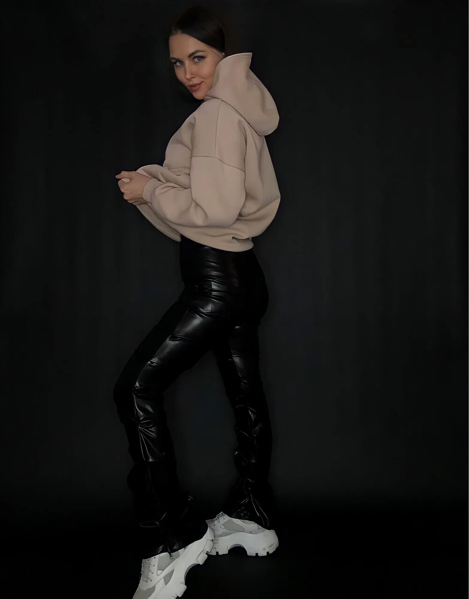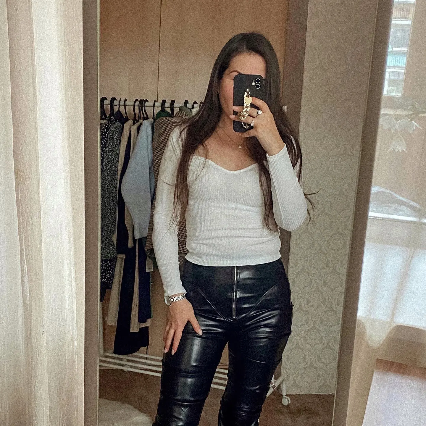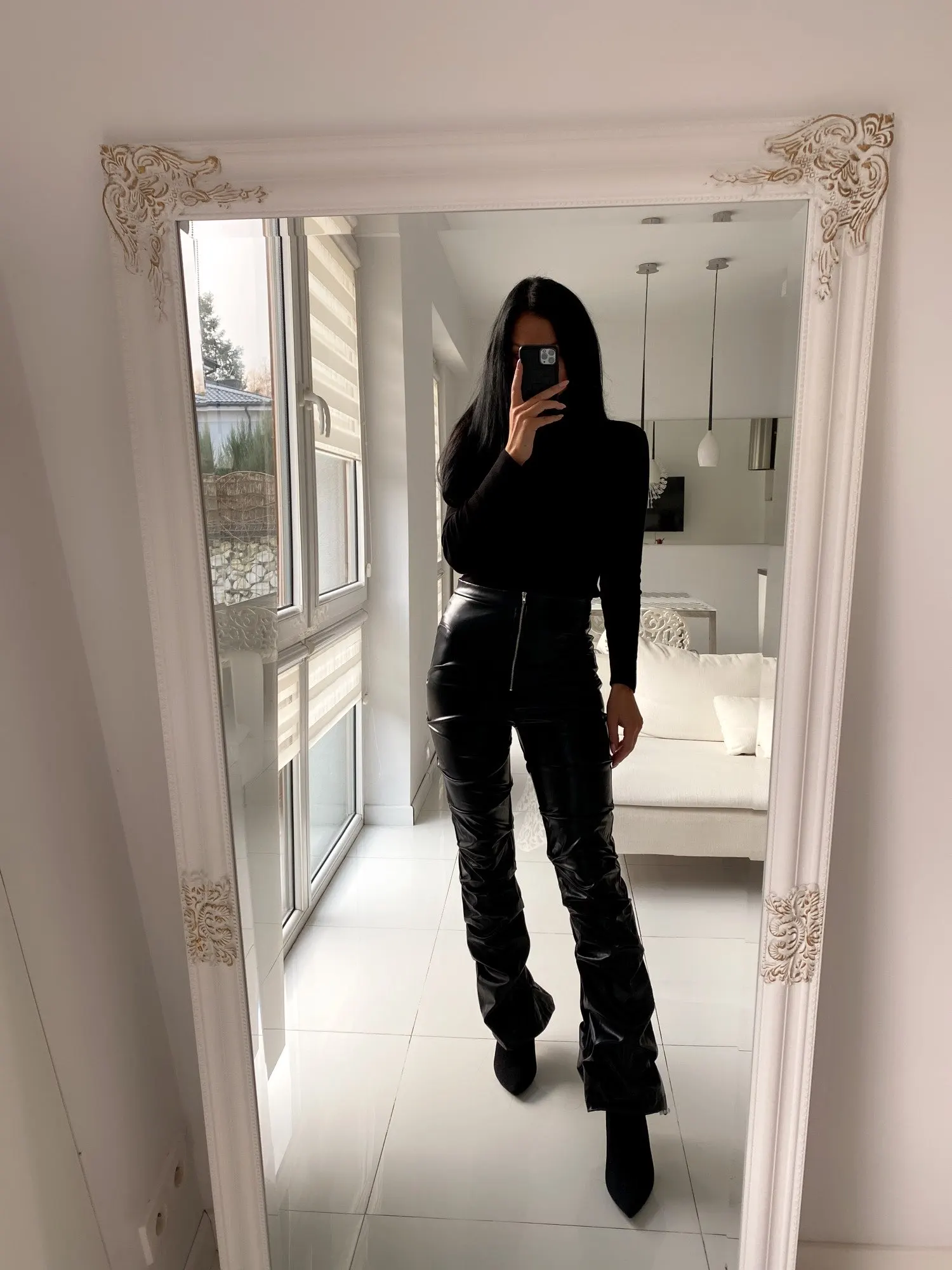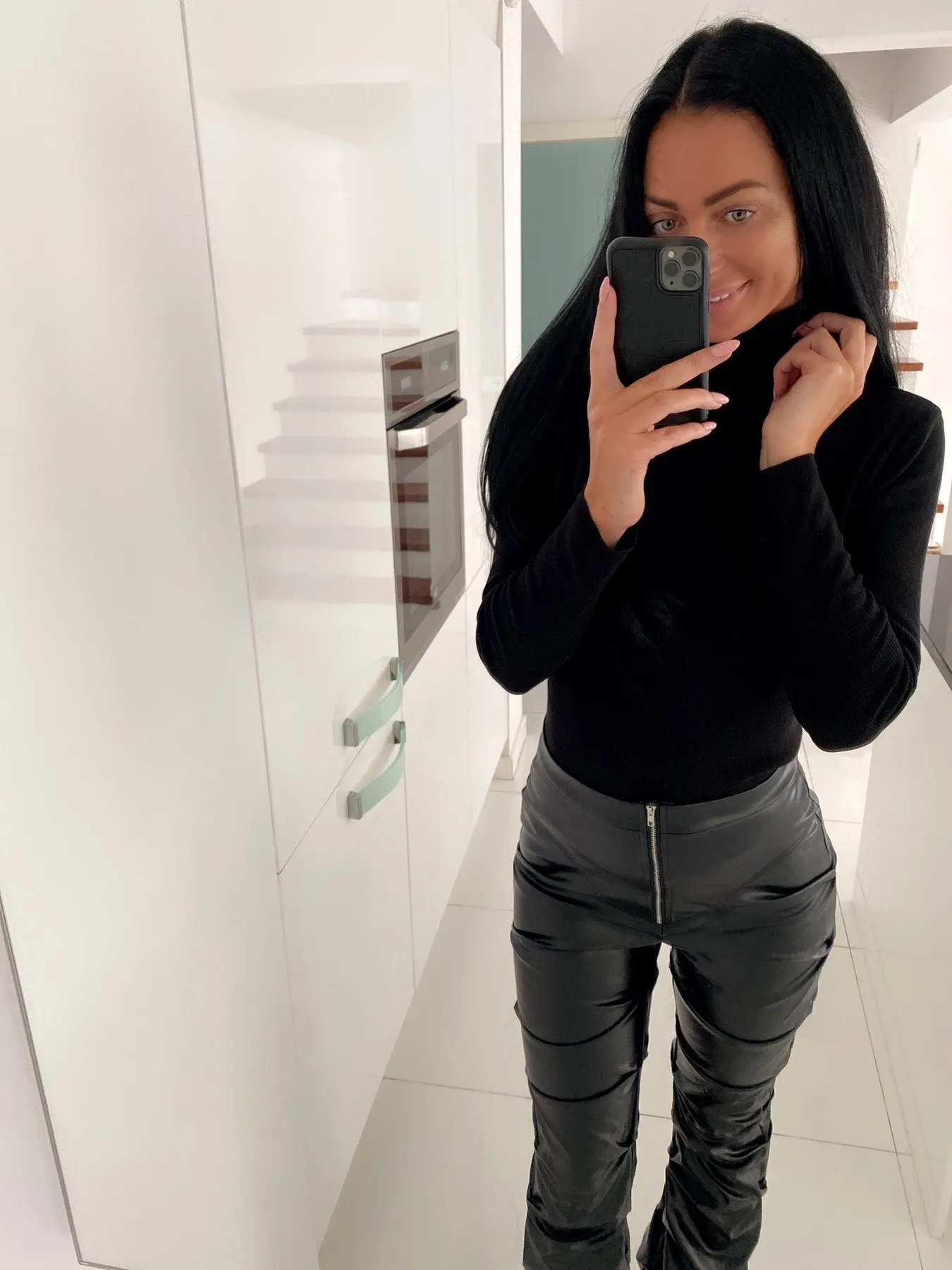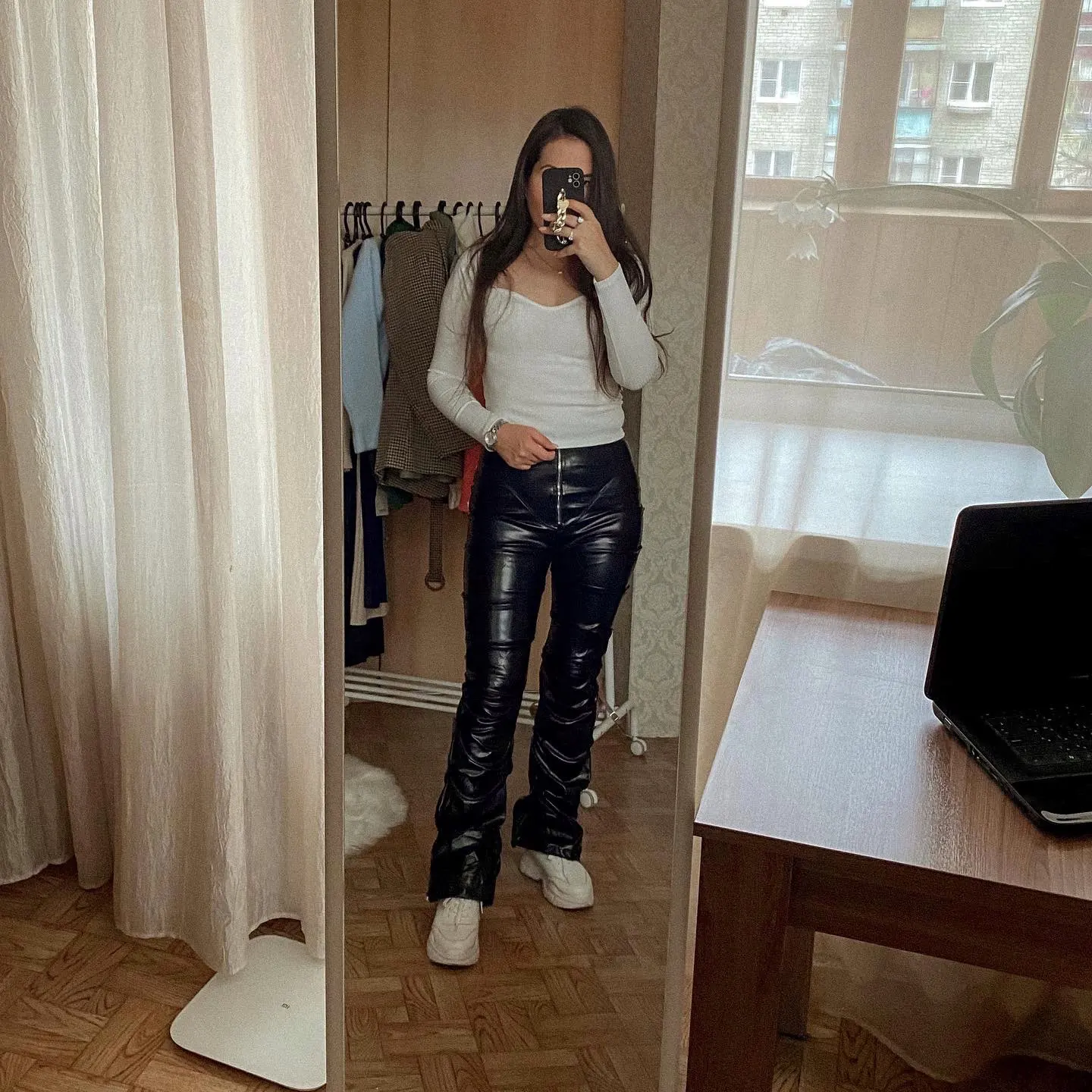 Eco leather pants. WITH A high waist crinkle leg, bottom rozszerzane leg-is adjustable can zwęzić bottom. Front zipped silver slider. Great fashion. Pants układają Sie beautifully. I wearing size M 68 cm waist, 92 cm hip, 174 cm tall. Perfectly fitted-material jeat flexible.