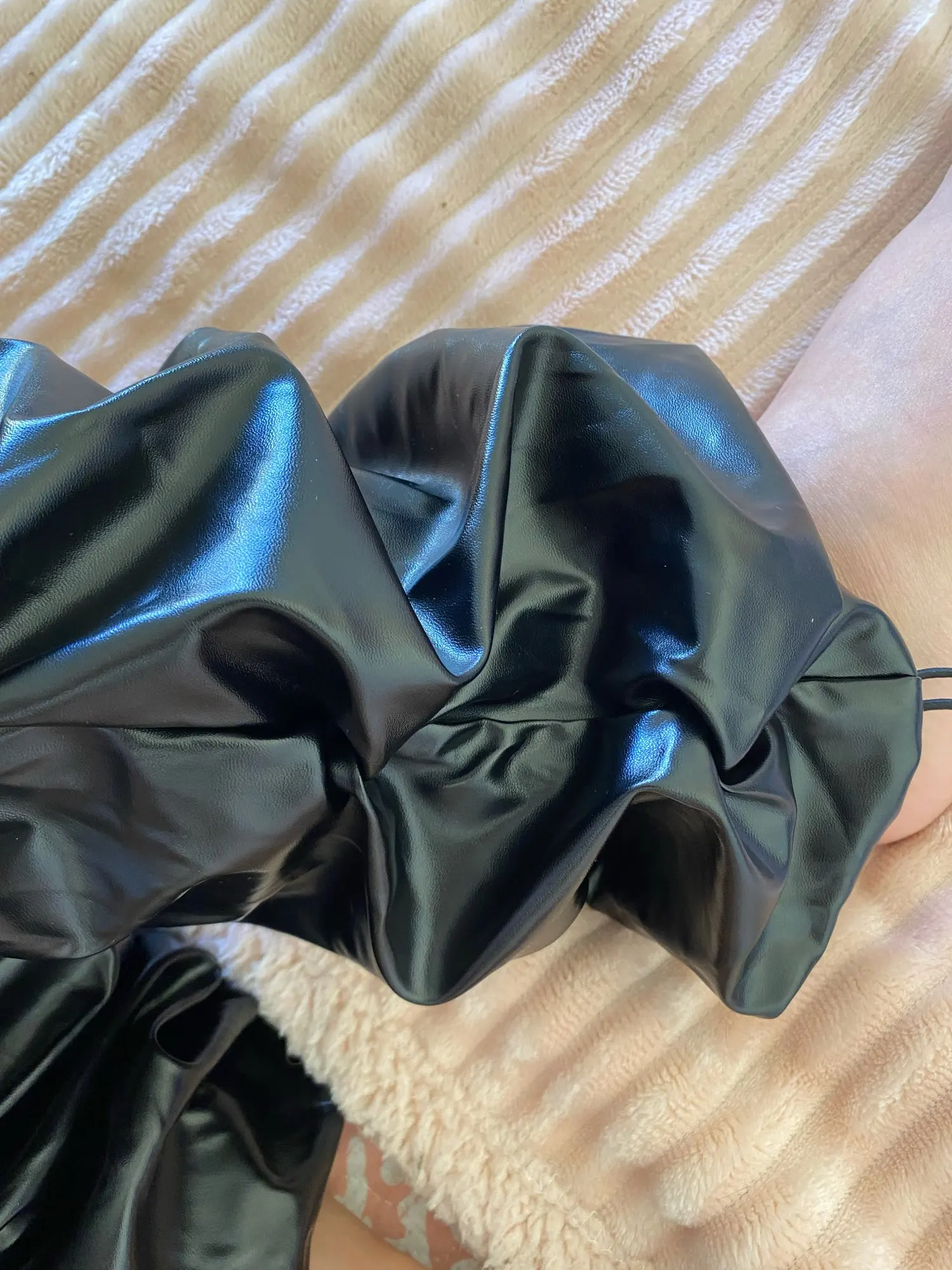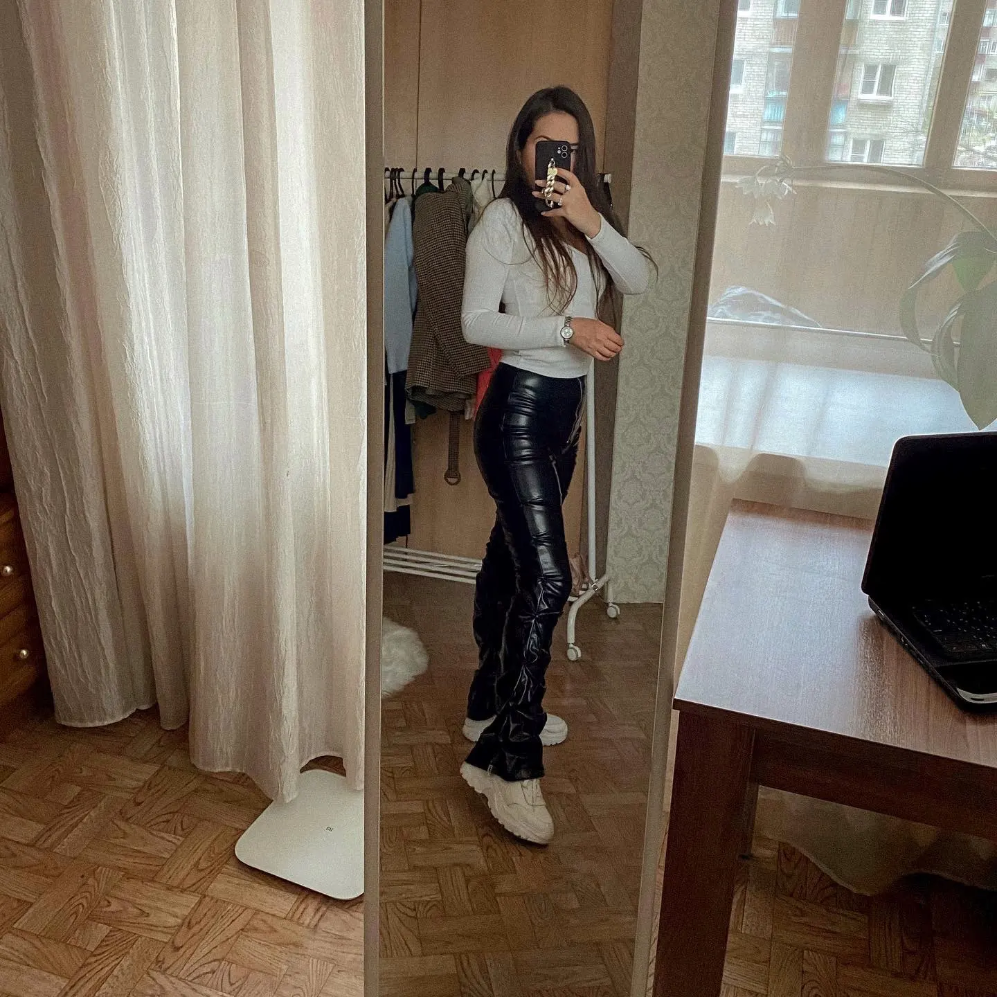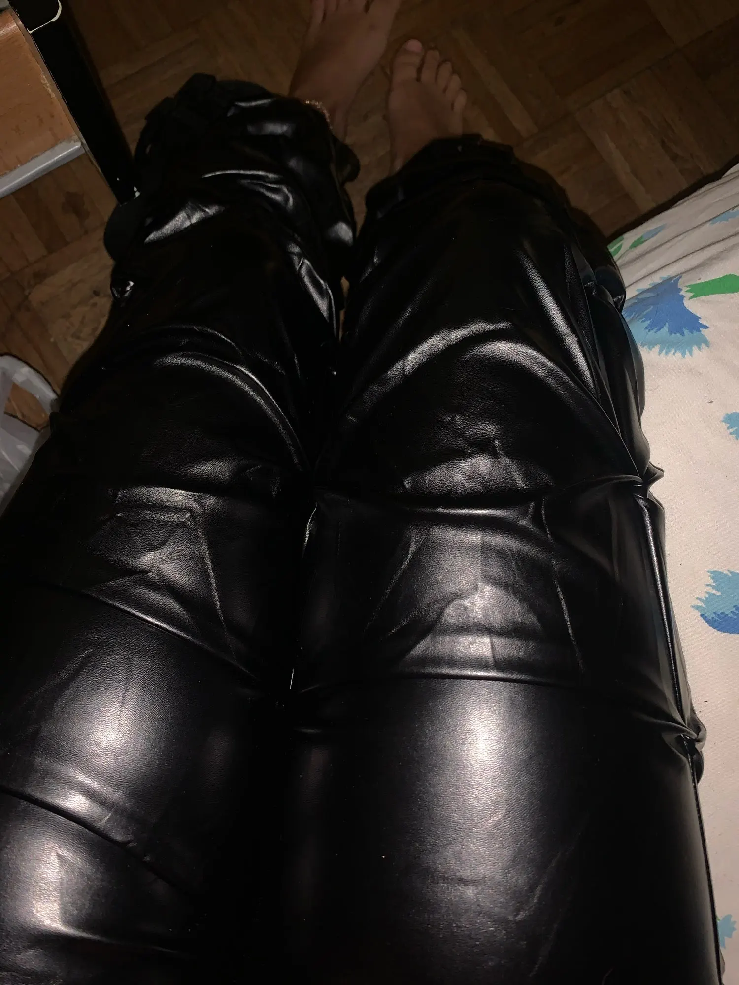 Faux leather trousers On my parameters og 84, OT 70 cm, OB 90 cm. Height 171 cm, weight: 55 kg, I chose size XL. free. The fabric is thin enough. Below there are rubber bands, you can tighten them. Full length pants. Look unusual. Shipping fast.