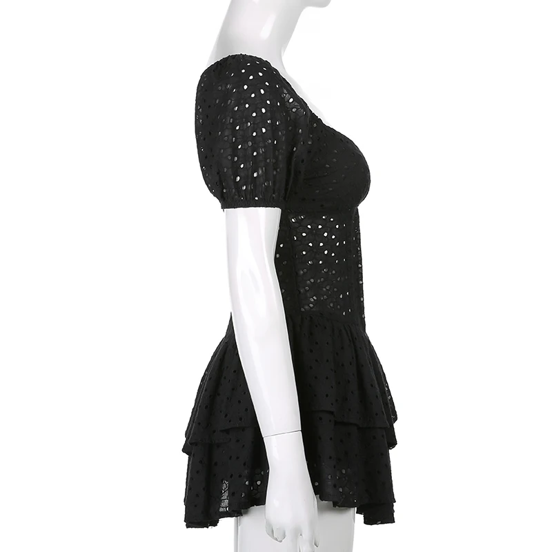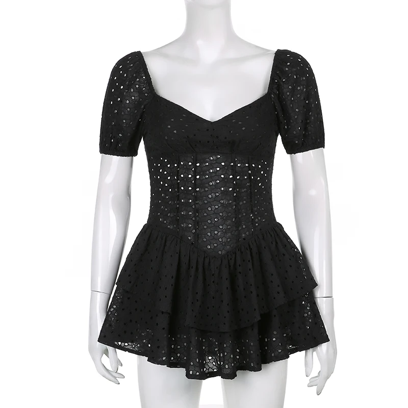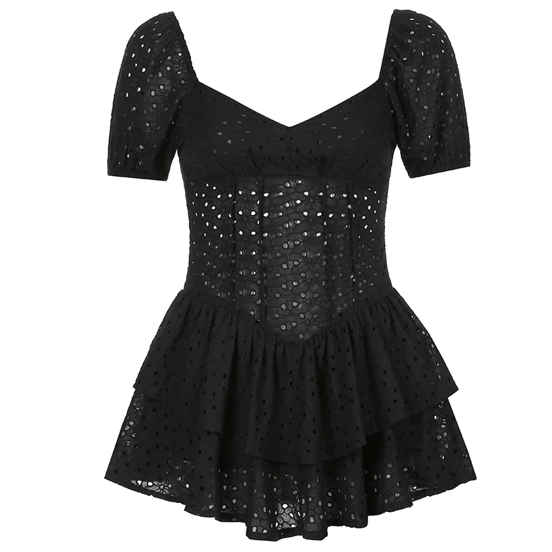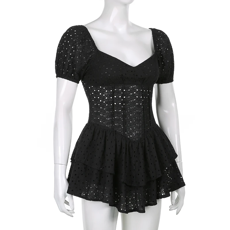 FREE SHIPPING 90s Chic Black Puff Sleeve Ruffles Pleated Corset Dress OUT0933