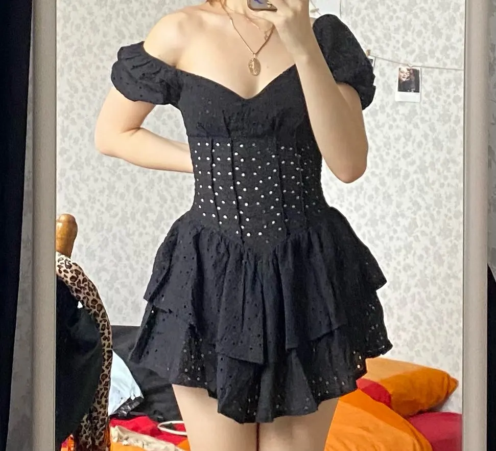 FREE SHIPPING 90s Chic Black Puff Sleeve Ruffles Pleated Corset Dress OUT0933