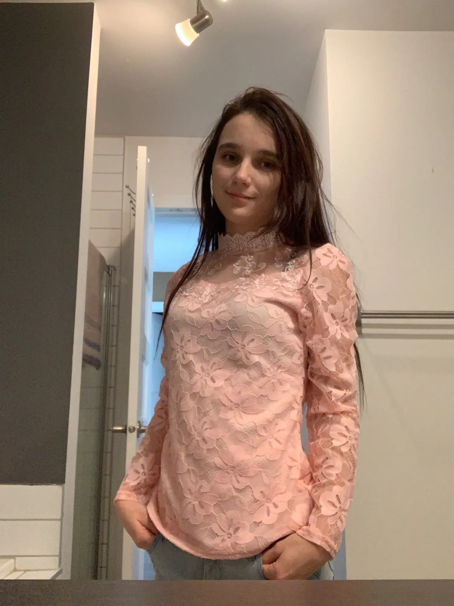Открыла упаковку и ахнула, качество просто шикарное, очень нежное кружево, швы все ровные. На ОГ 82 - ОТ 66 - ОБ 87 подошло идеально, что у меня бывает редко. Рукава короче примерно на 1/4.