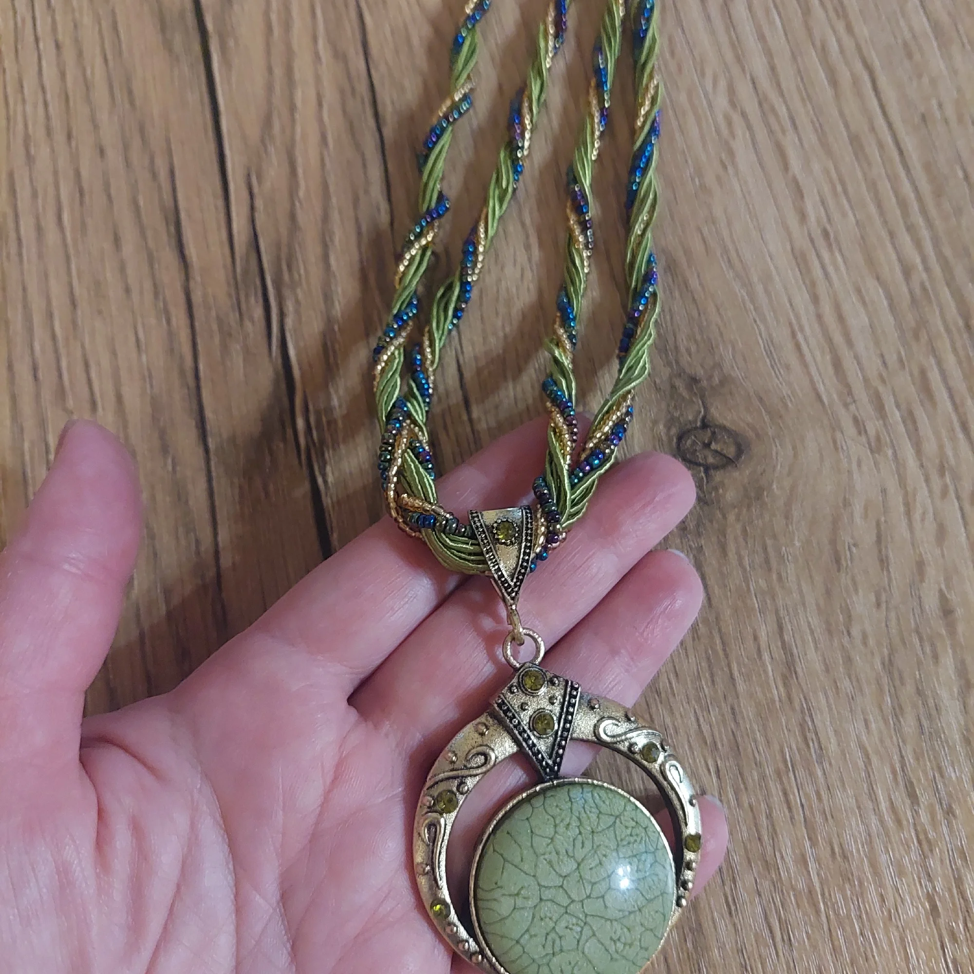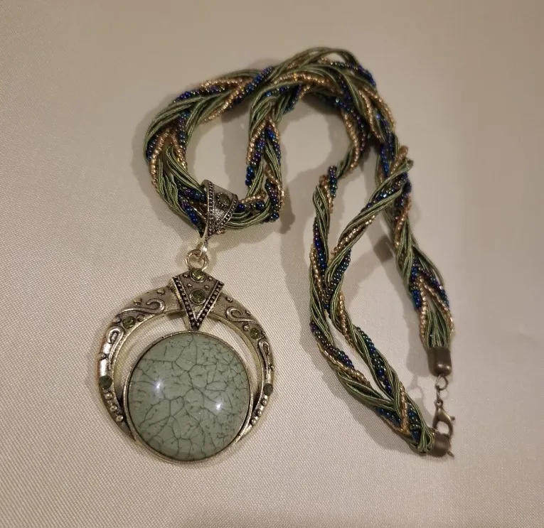 Beauty. The necklace is heavy and substantial. The cord is made of beads and thread, looks expensive. The only thing I didn't like was the clasp - the metal is dark and thin, but it does its job.