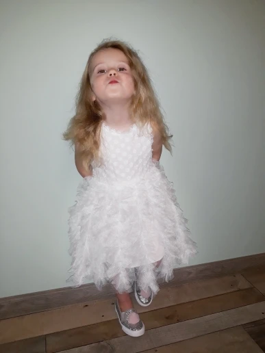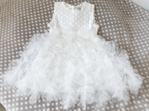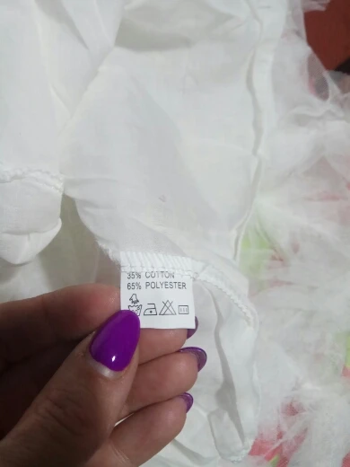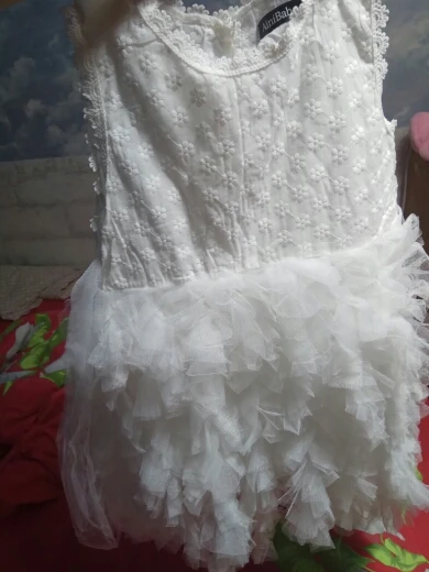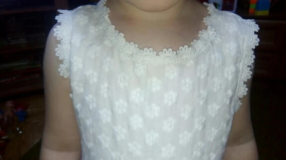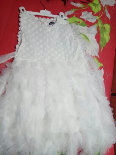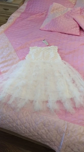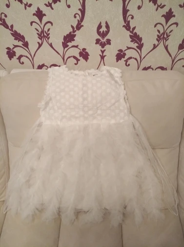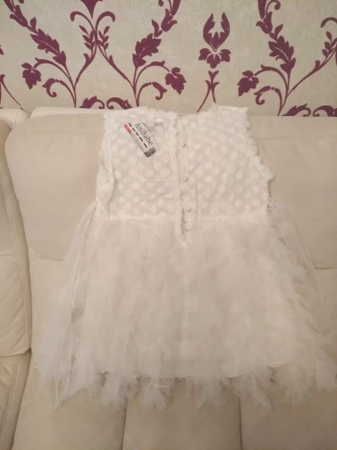 It came quickly, the dress is good, with a smell). Cotton, we 5,5 years ordered 6 T. Sits perfectly, and on growth will go. Black Tag on white dress (you need to steam). Iron a whole problem, especially ryushechki. The steamer also does not cope well. In general, a very good dress for such money, simple and elegant. I advise