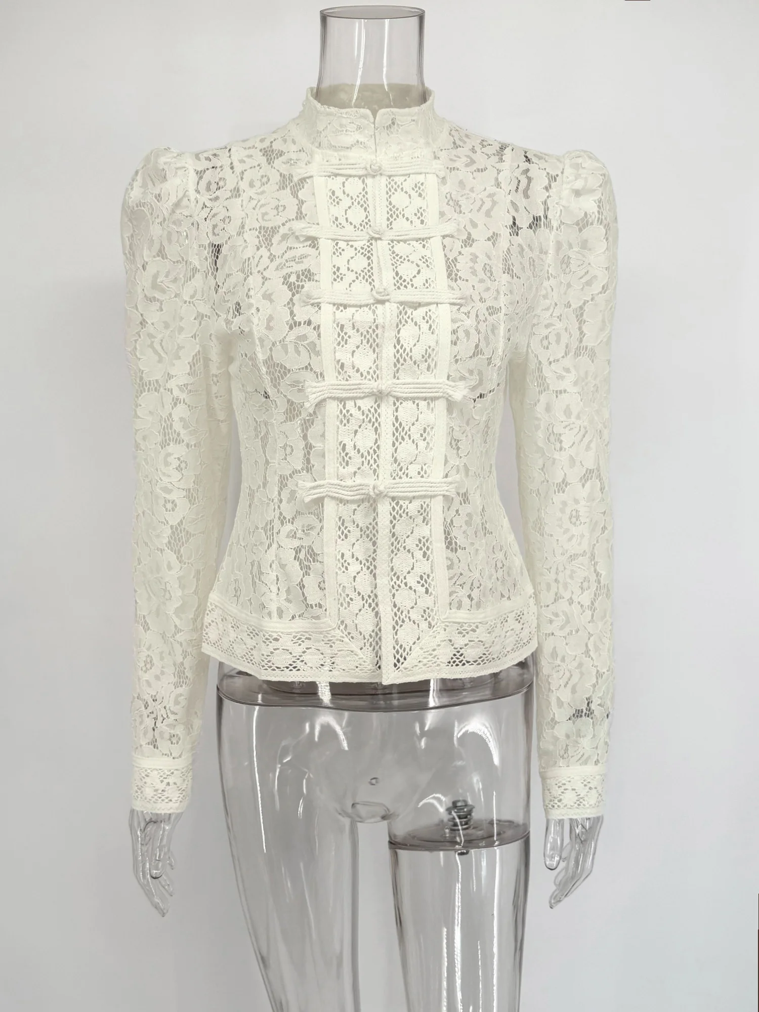 For this price, it's quite a nice little item. The blouse is almost transparent, needs a layer underneath. Sewn neatly, the lace is delicate, not thick, contains cotton. Clasp with Chinese knots, very cute.