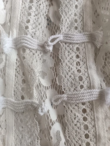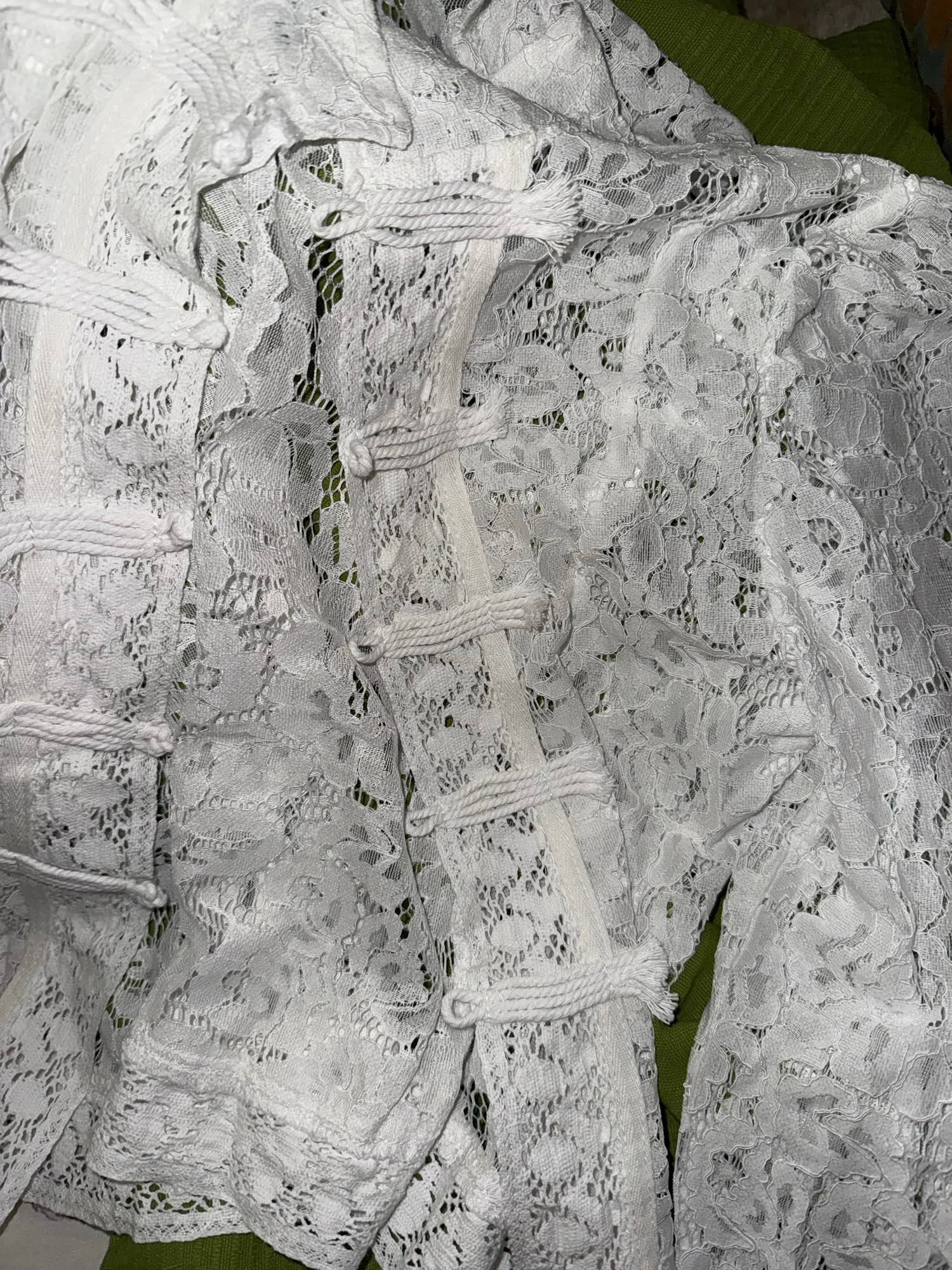 For this price, it's quite a nice little item. The blouse is almost transparent, needs a layer underneath. Sewn neatly, the lace is delicate, not thick, contains cotton. Clasp with Chinese knots, very cute.
