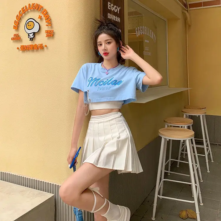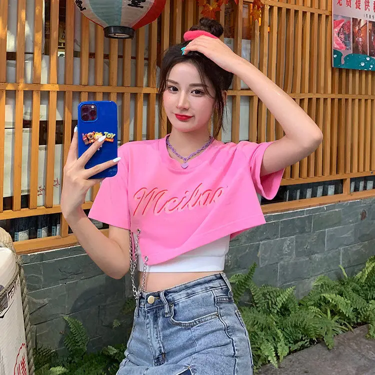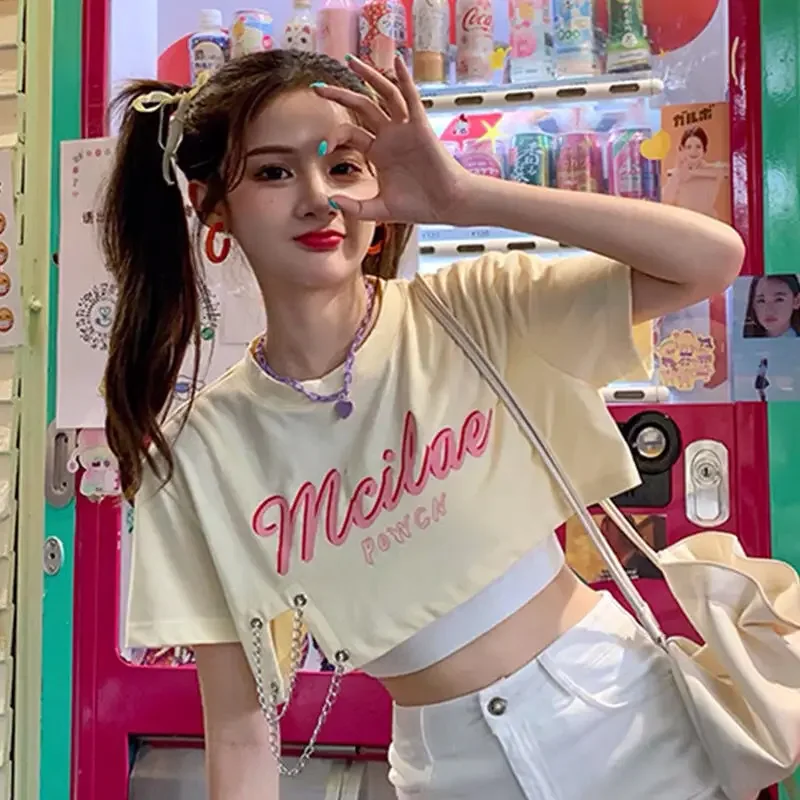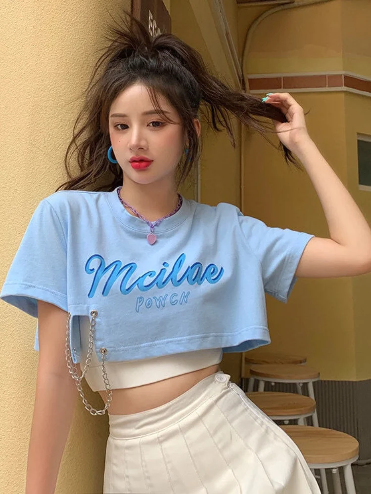 FREE SHIPPING Korean Fashion New Letter Print Loose Short Sleeved Cropped Tops With Chain OUT0990
