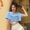 FREE SHIPPING Korean Fashion New Letter Print Loose Short Sleeved Cropped Tops With Chain OUT0990