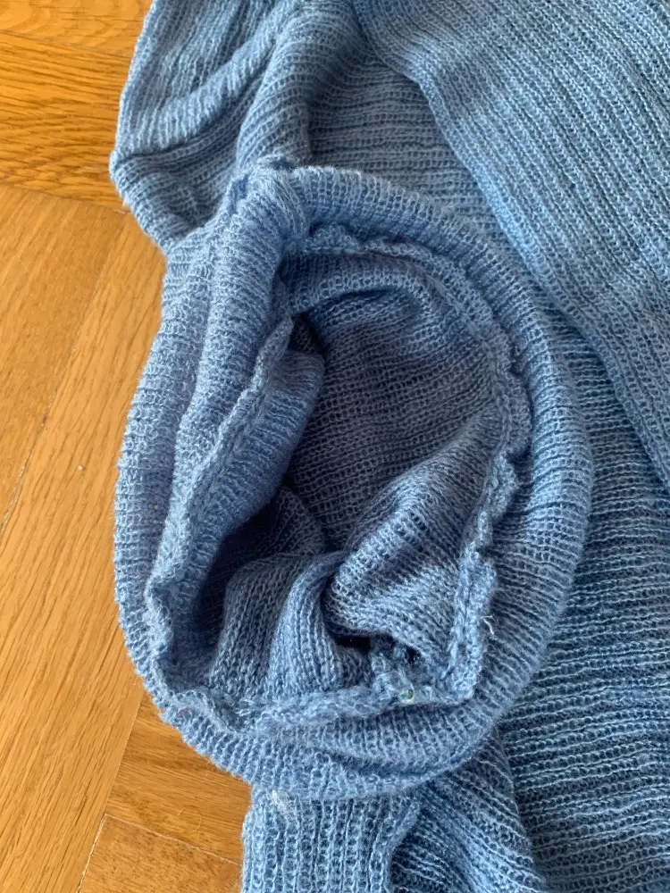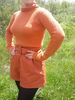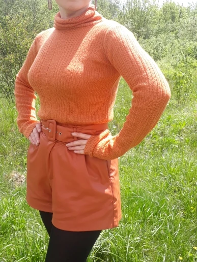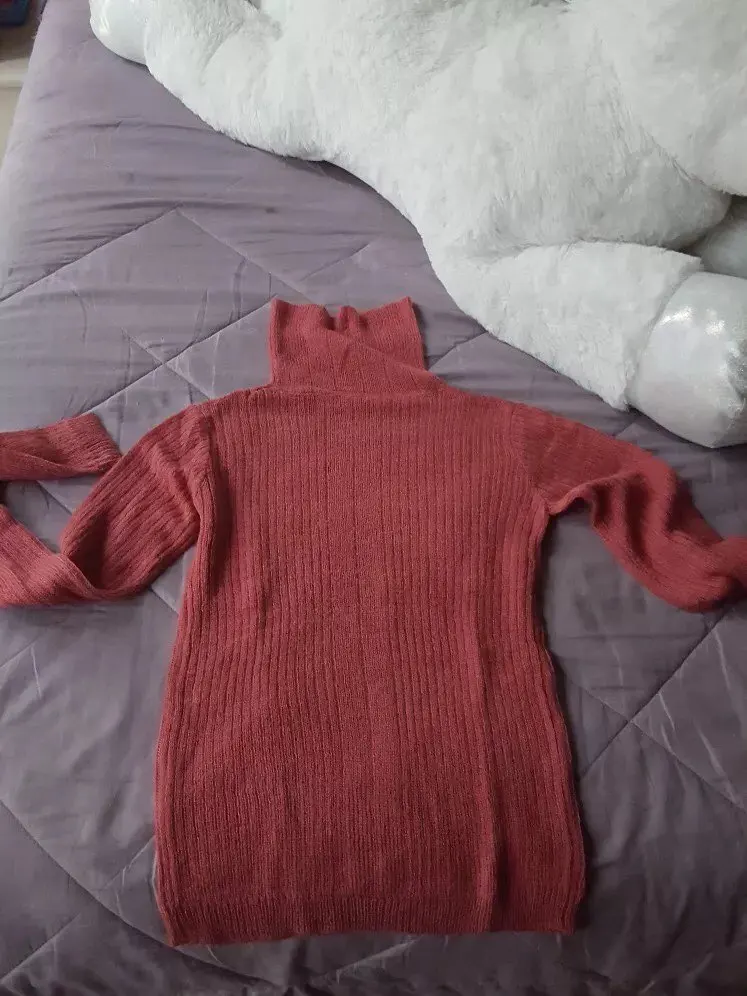 Delivery 3 weeks in United Parcel. Interesting color. And the truth is quite warm. The neck looks a little strange, because the top is not fixed with a dense seam, but the head does not get through without problems. My parameters are 95-75-95. Sleeves for height 168 do not say that straight is very long.