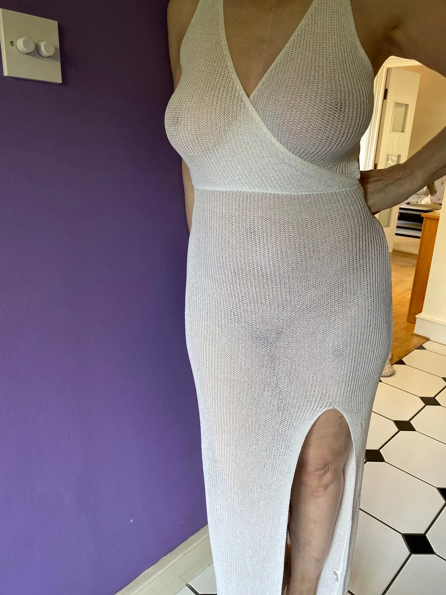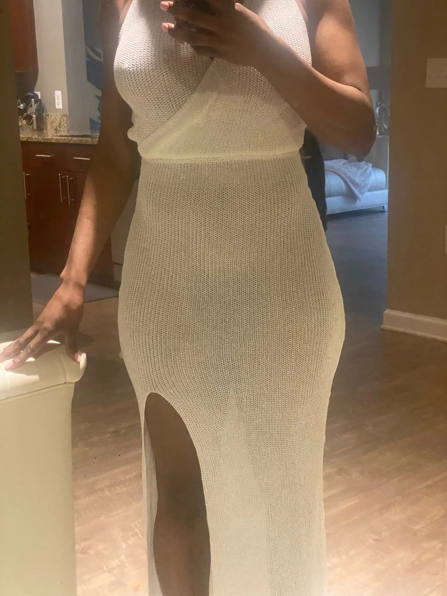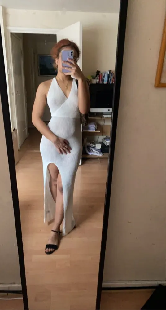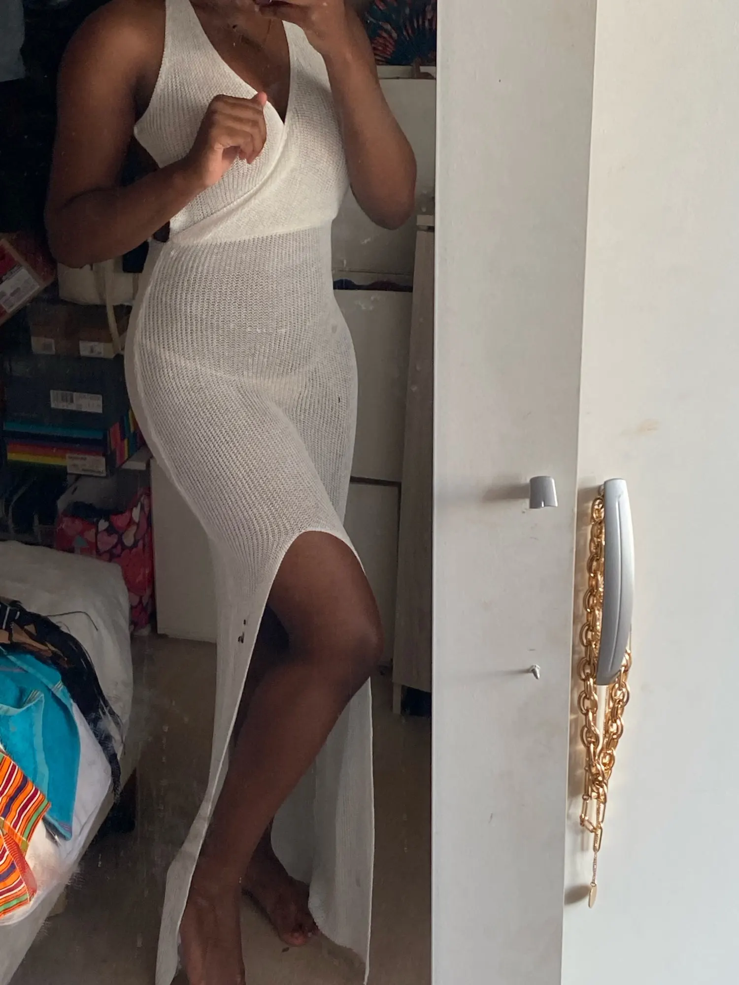 Such a lovely dress. The dress is made of a knitted polyester material and is super complimenting on the body. Is a bit see through but that’s because it’s knitted. I am 5’2 and the dress wasn’t too long for me. Shipping took like 10 days to the UK