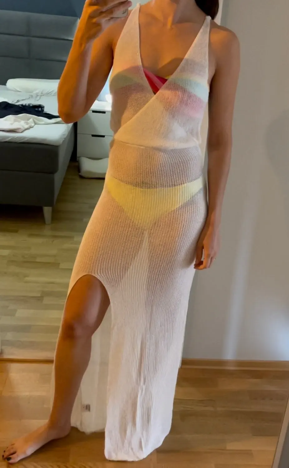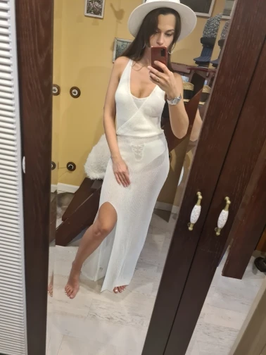 Good quality, pleasant to the body. On me M, parameters 88, 68, 93 and height 177 sits on the legs tightly and straight long in the floor. I probably would like to be more free, but for the beach it will come out. Delivery is very fast, there is no smell.