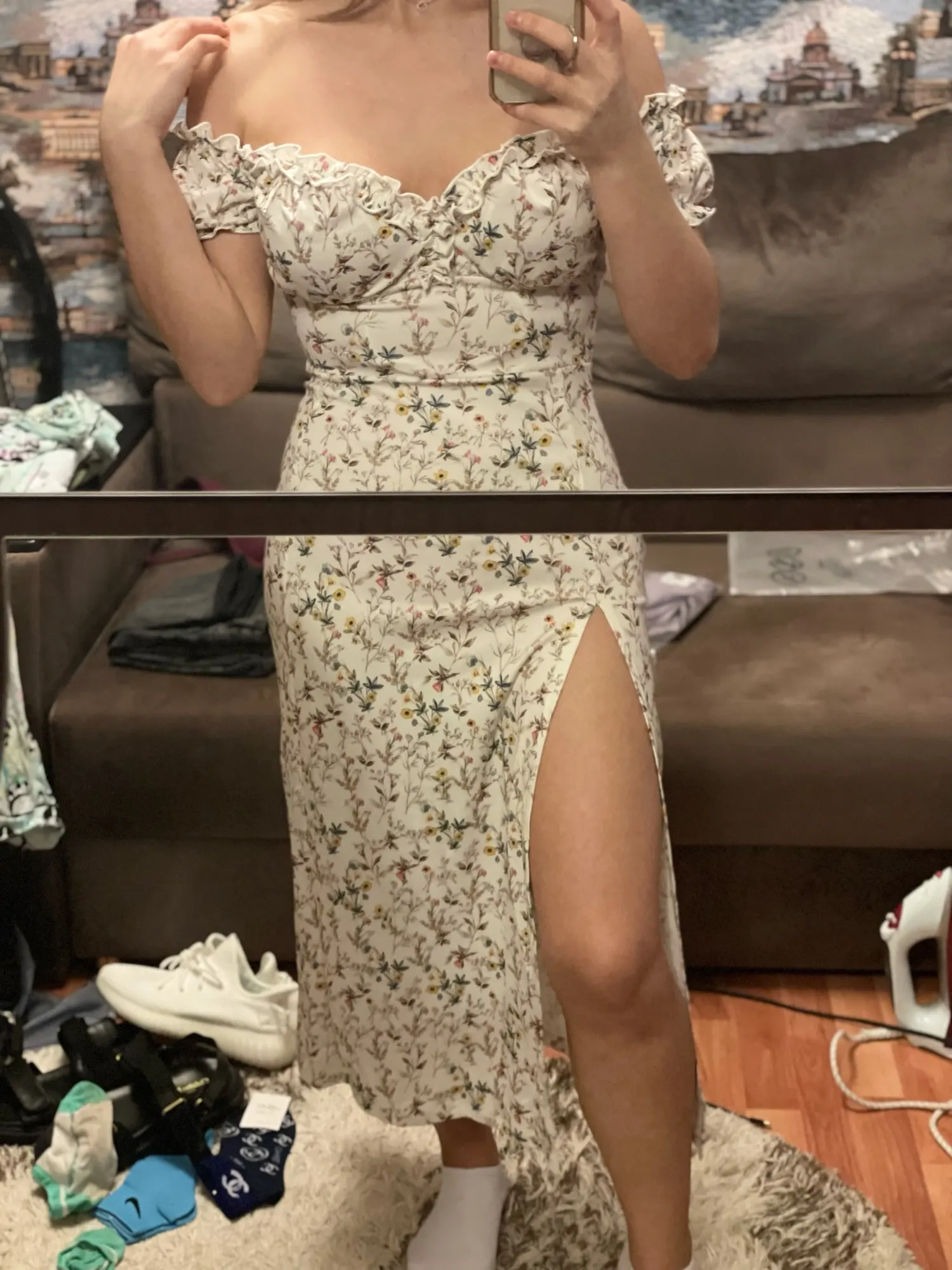 The dress really liked it! Spectacular cut. Sits perfectly, as worn until I do not know, still did not walk. height 156, took S, in the cover, I like everything) I only wear it with a bra, because there is a decent stock for the chest, but it's not)))) to Moscow reached 18 days (although promised a month minimum) I recommend!