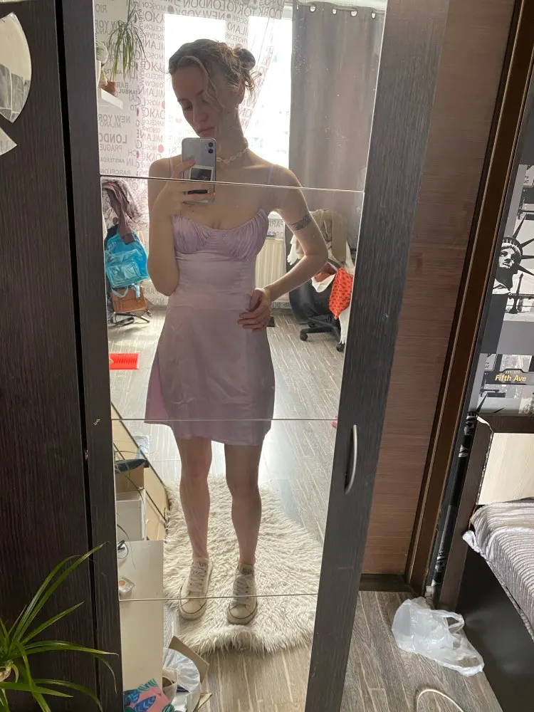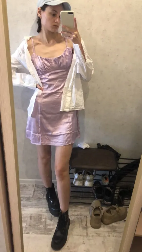 Very fast delivery to SPB. Dress of good quality. At the height of 170 size s sat perfectly. Does not shine, not very short. The threads were tightened, and they had to burn. Everyone is very happy