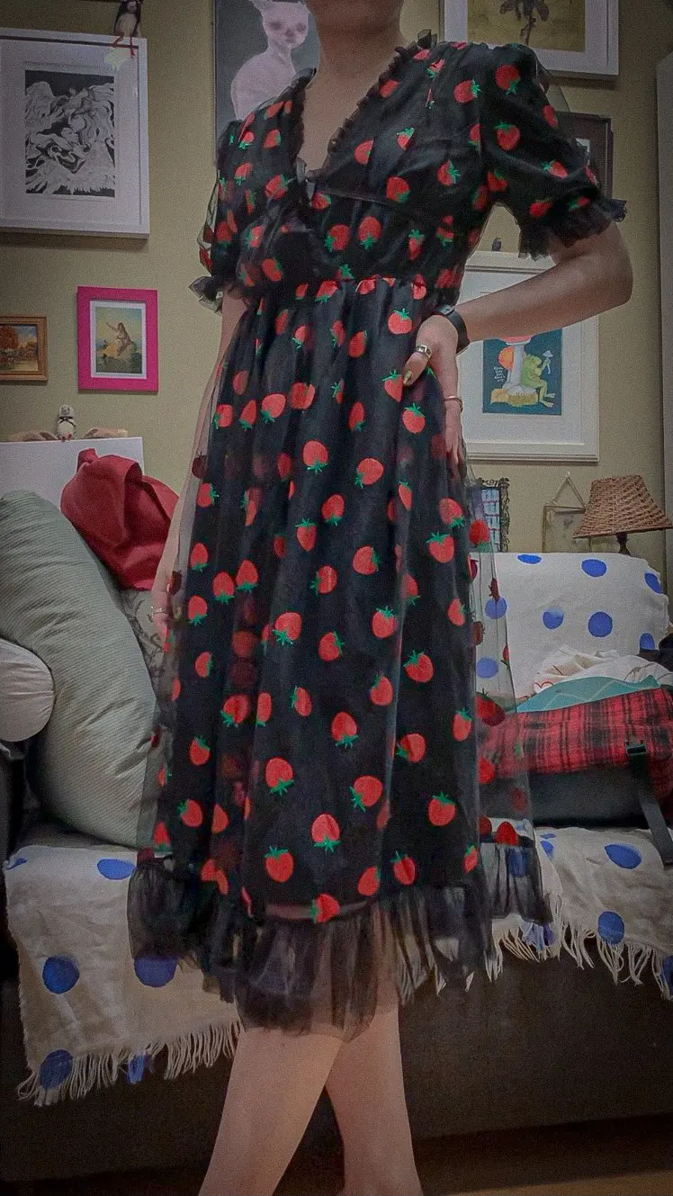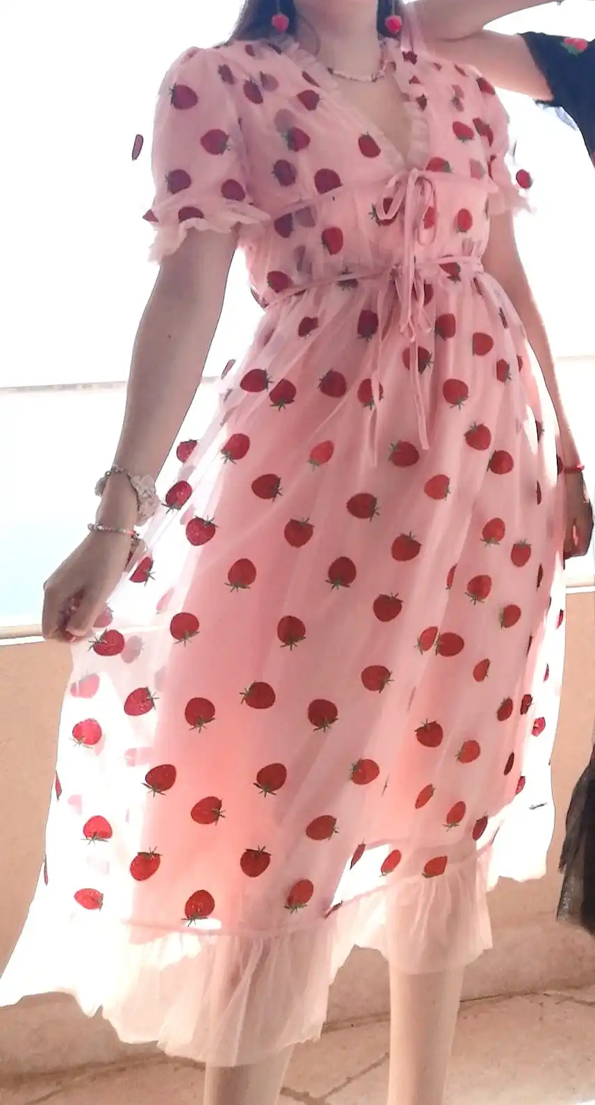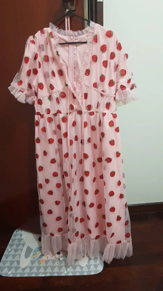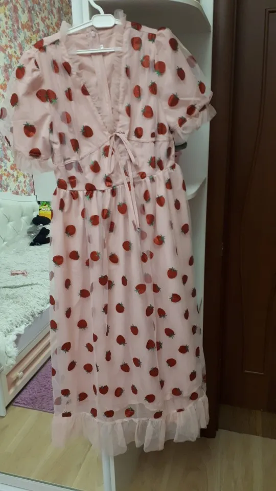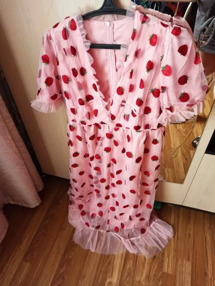 I had opened a dispute because I thought it wouldn't come but yes. It's very nice the dress, a friend of mine wore it and she looked so pretty. Fresitas look like stickers. It looks very nice. It has a small belt strip for adjusts, it is still pronounced from the neckline but can be adjusted.